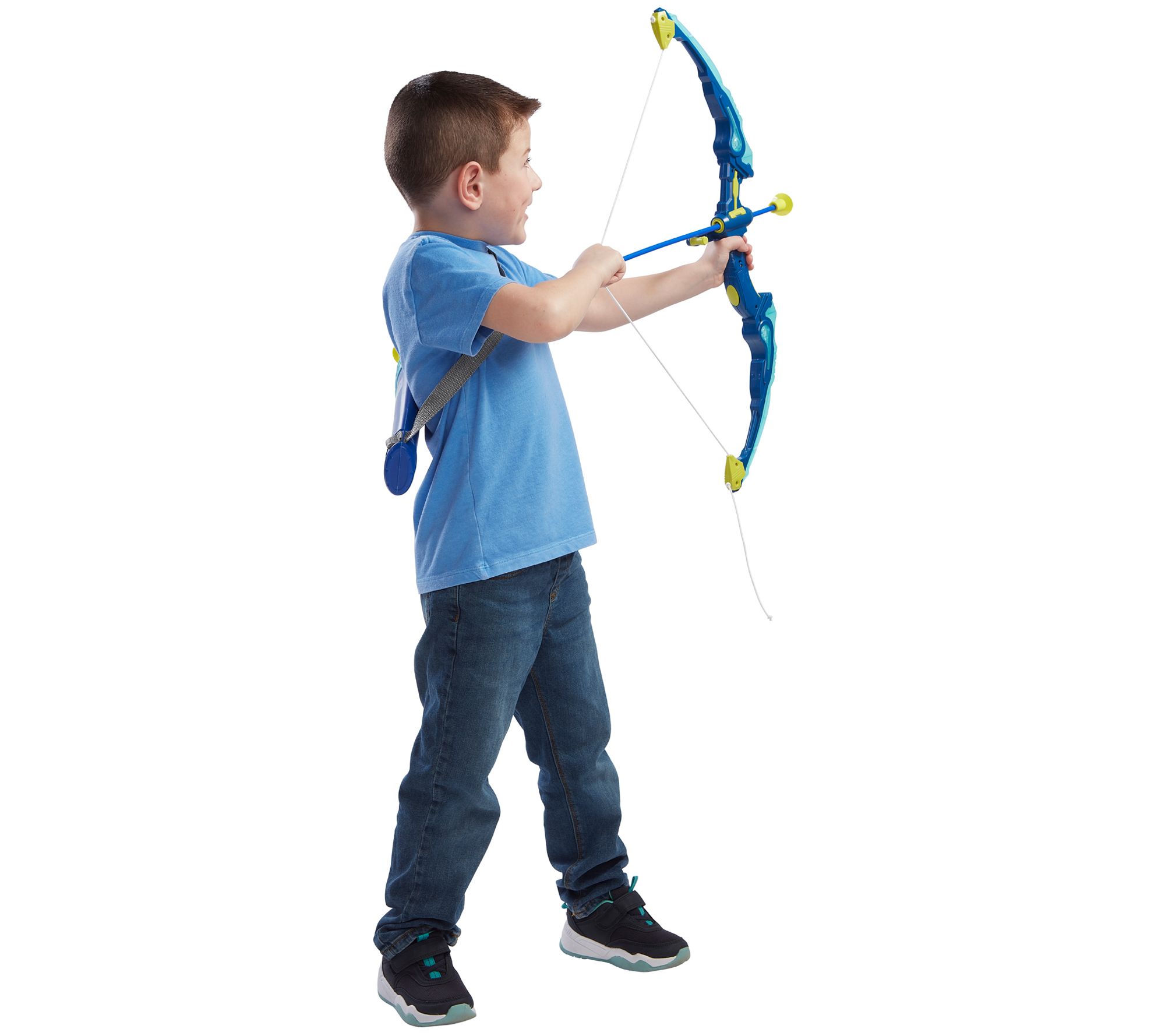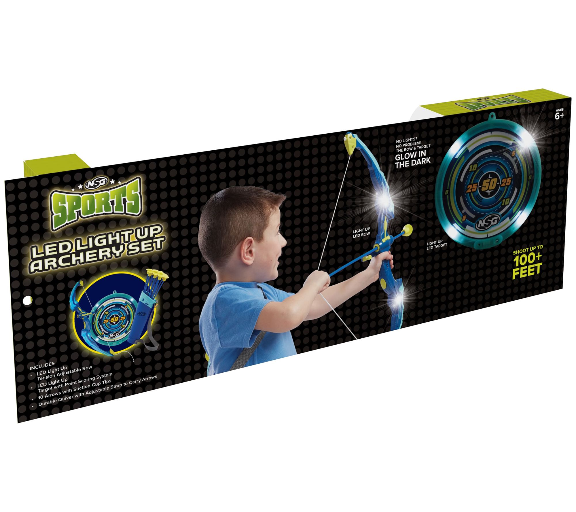 • Includes LED lighted bow, LED lighted target, 10 arrows with suction cup tips, quiver with adjustable strap, two AAA batteries, and three LR44 batteries