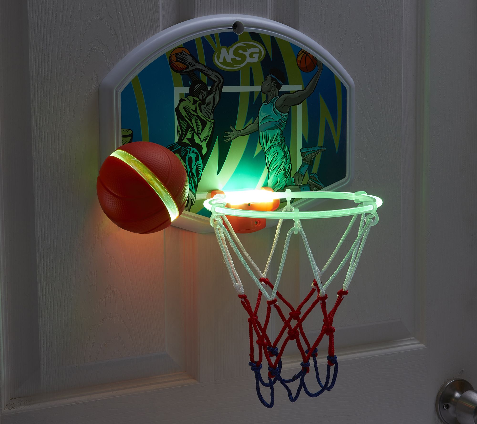 No lights, no problem! This glowing basketball hoop set can be played anytime, anywhere thanks to its door hook, suction cup hanger, and bright LED illumination. From National Sporting Goods.