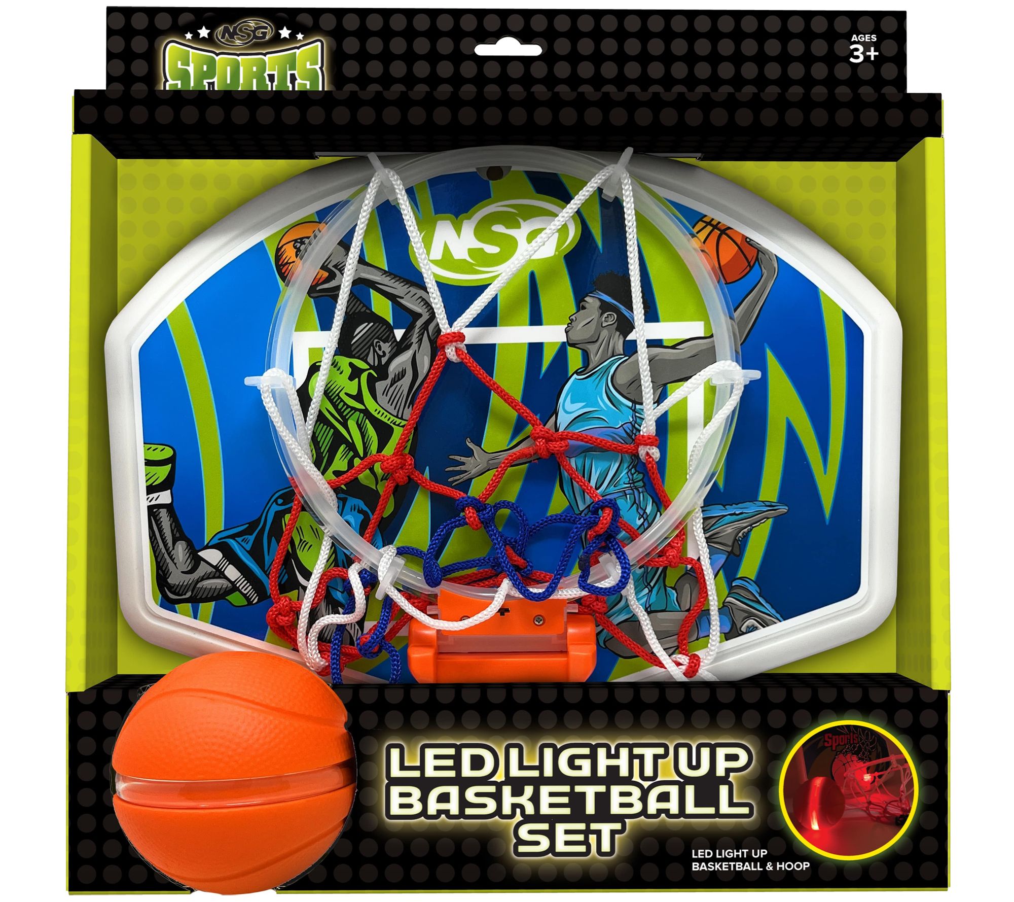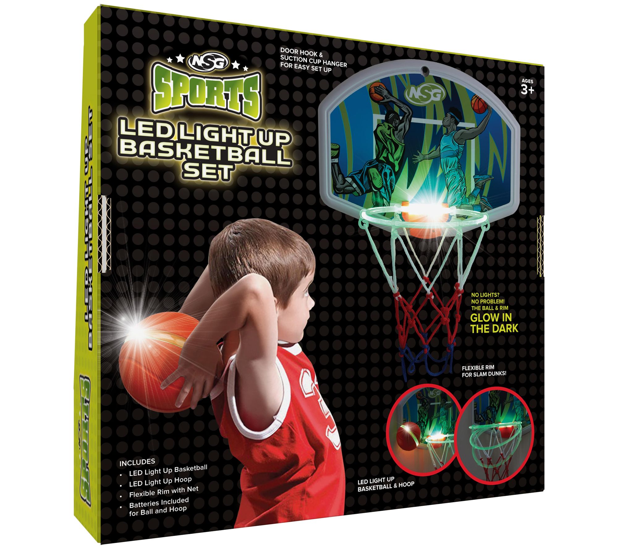 • Includes LED lighted basketball, LED hoop, flexible rim with net, over-the-door hook, suction cup, three AG13 batteries, and three AG10 batteries
