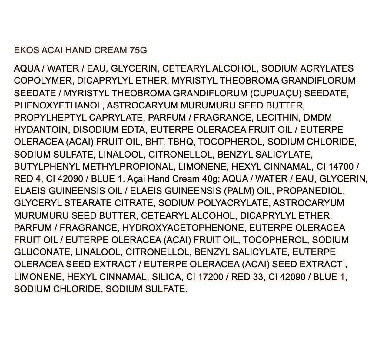 Natura Ekos Acai Hand Cream is an extremely effective hand cream that revitalizes the skin. Enriched with energizing acai oil and murumuru butter to strengthen skin's natural moisture barrier, it has a light texture that absorbs quickly to leave hands feeling comfortable, never greasy. It leaves a delicate scent on skin with fresh and fruity notes and instantly hydrates and revitalize hands and cuticles.