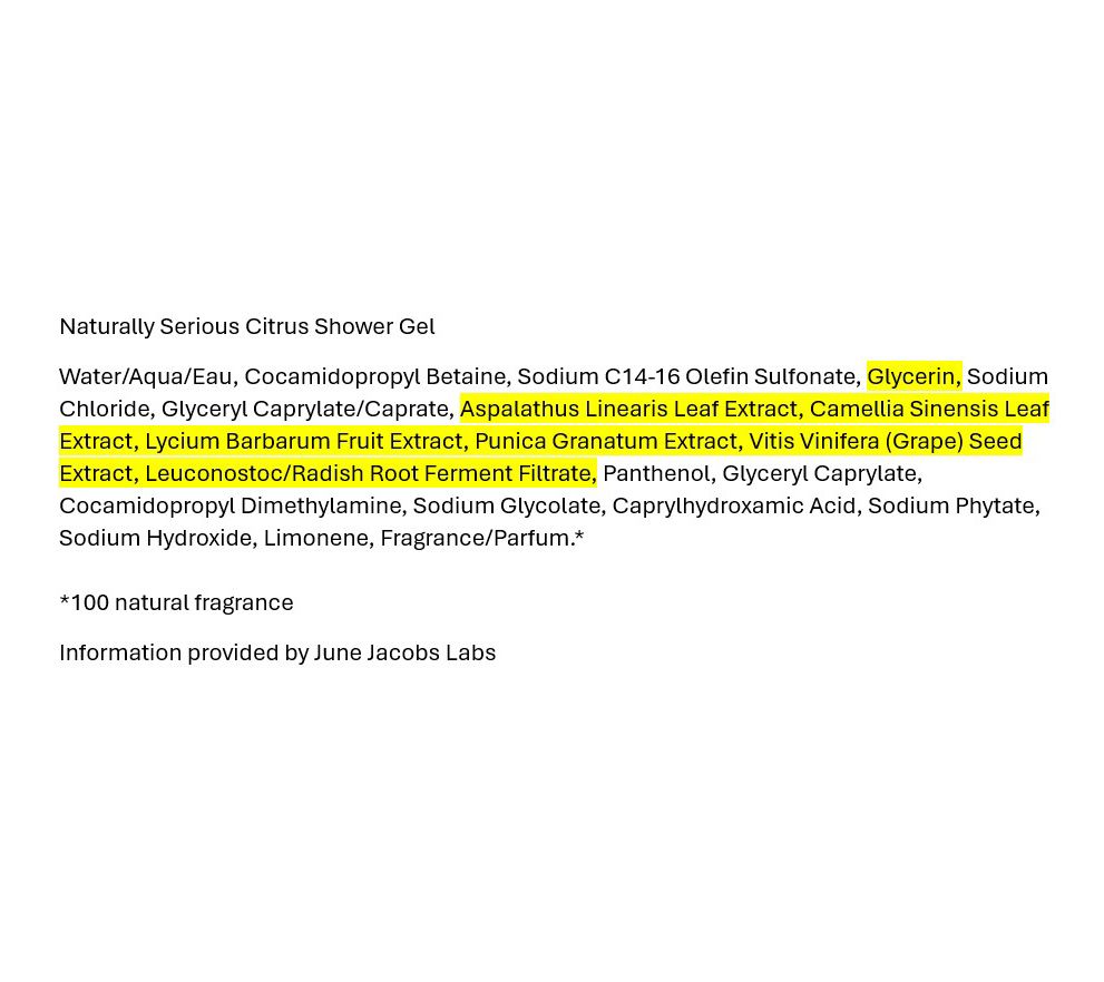 Naturally Serious Citrus Shower Gel gently sweeps away surface impurities. Infused with rice bran extract, Pro Vitamin B5, and a proprietary blend of anti-oxidants, the nourishing formula may help fight free radical aggressors. Skin is left appearing cleansed, with a light and uplifting citrus fragrance.
