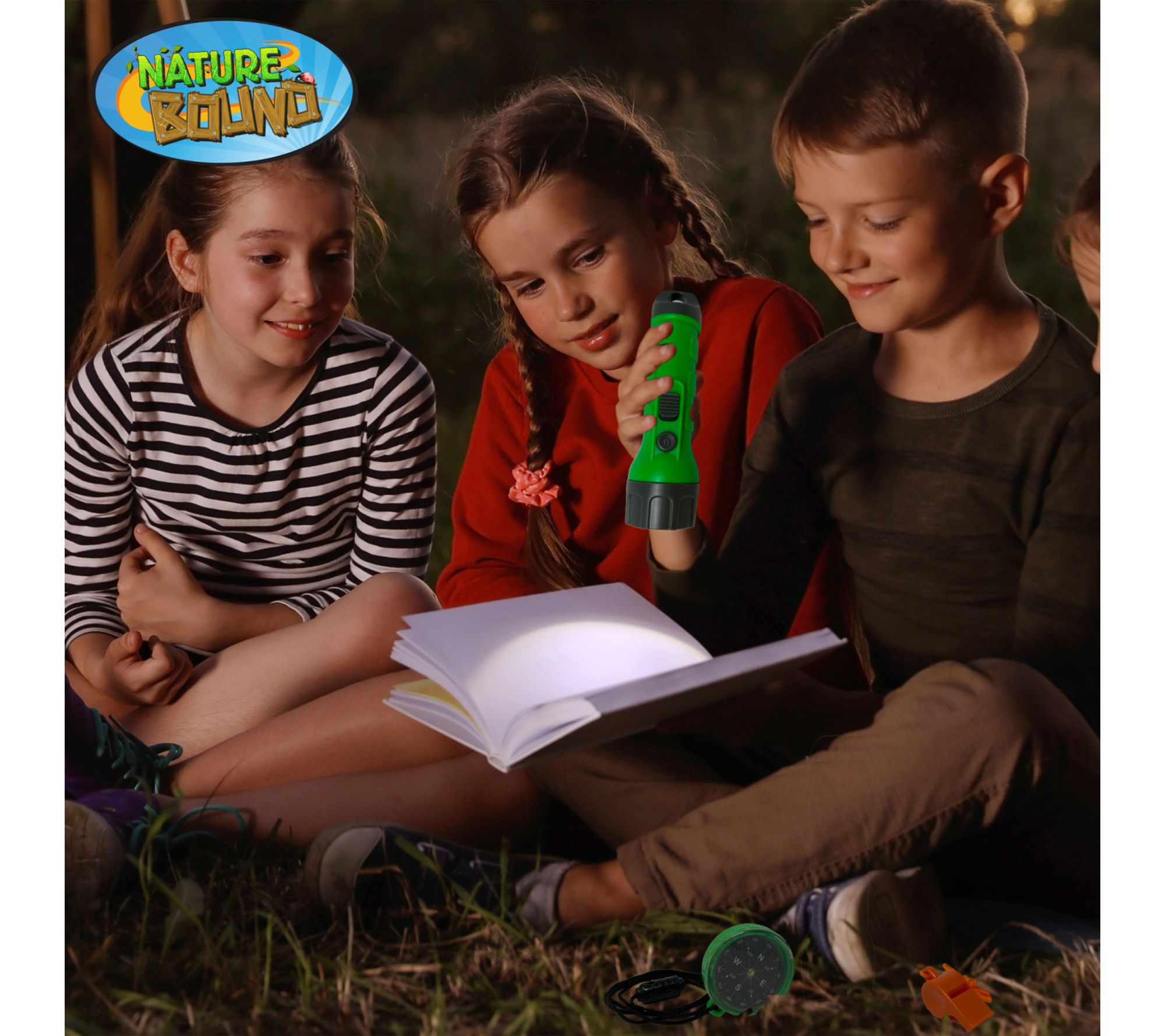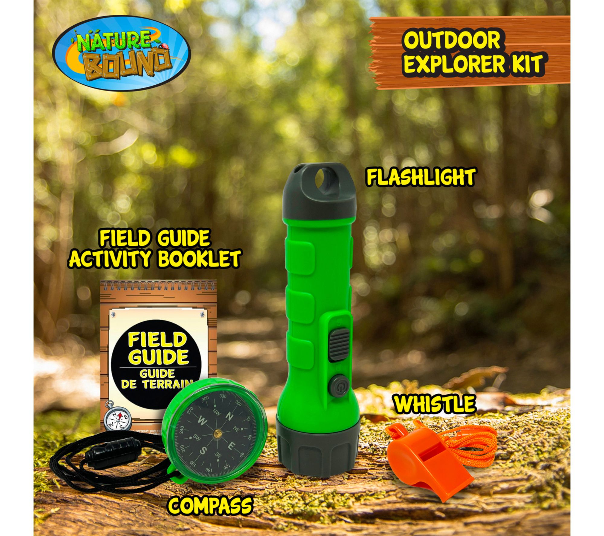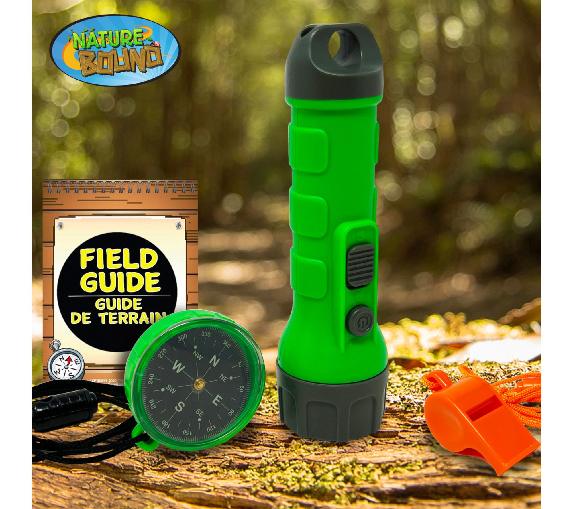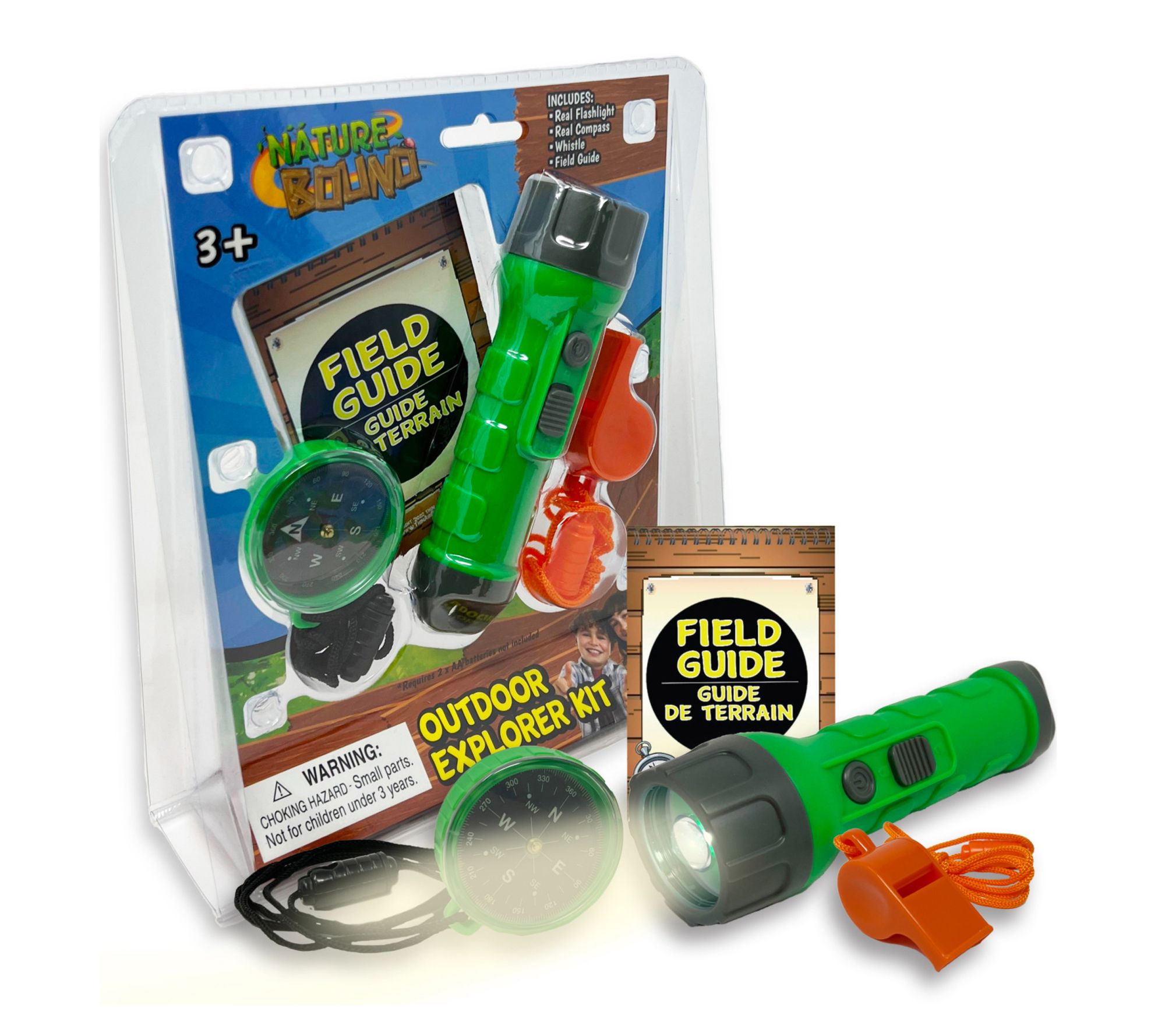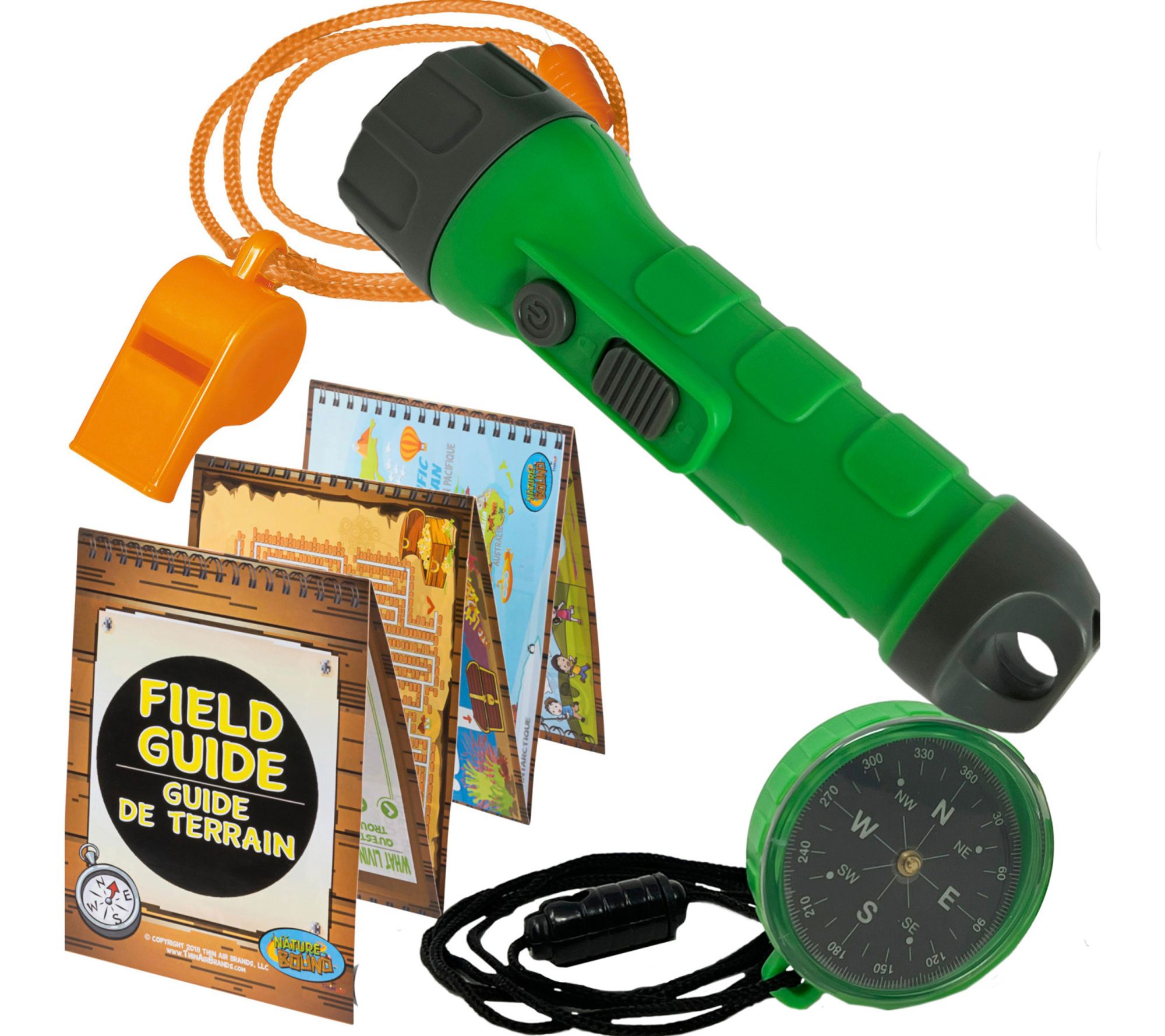 • Includes real flashlight, compass, whistle, and field guide