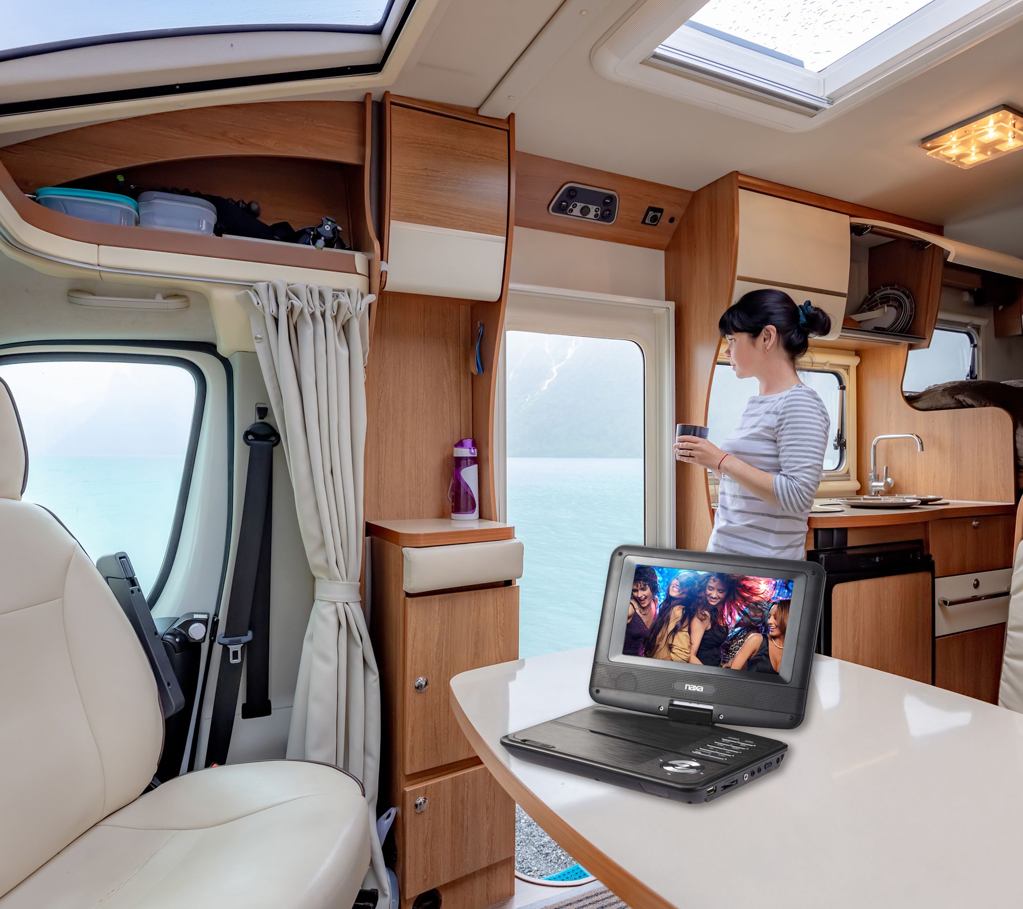 Includes DVD player, AC power adapter, DC car cord, A/V cable, and remote control