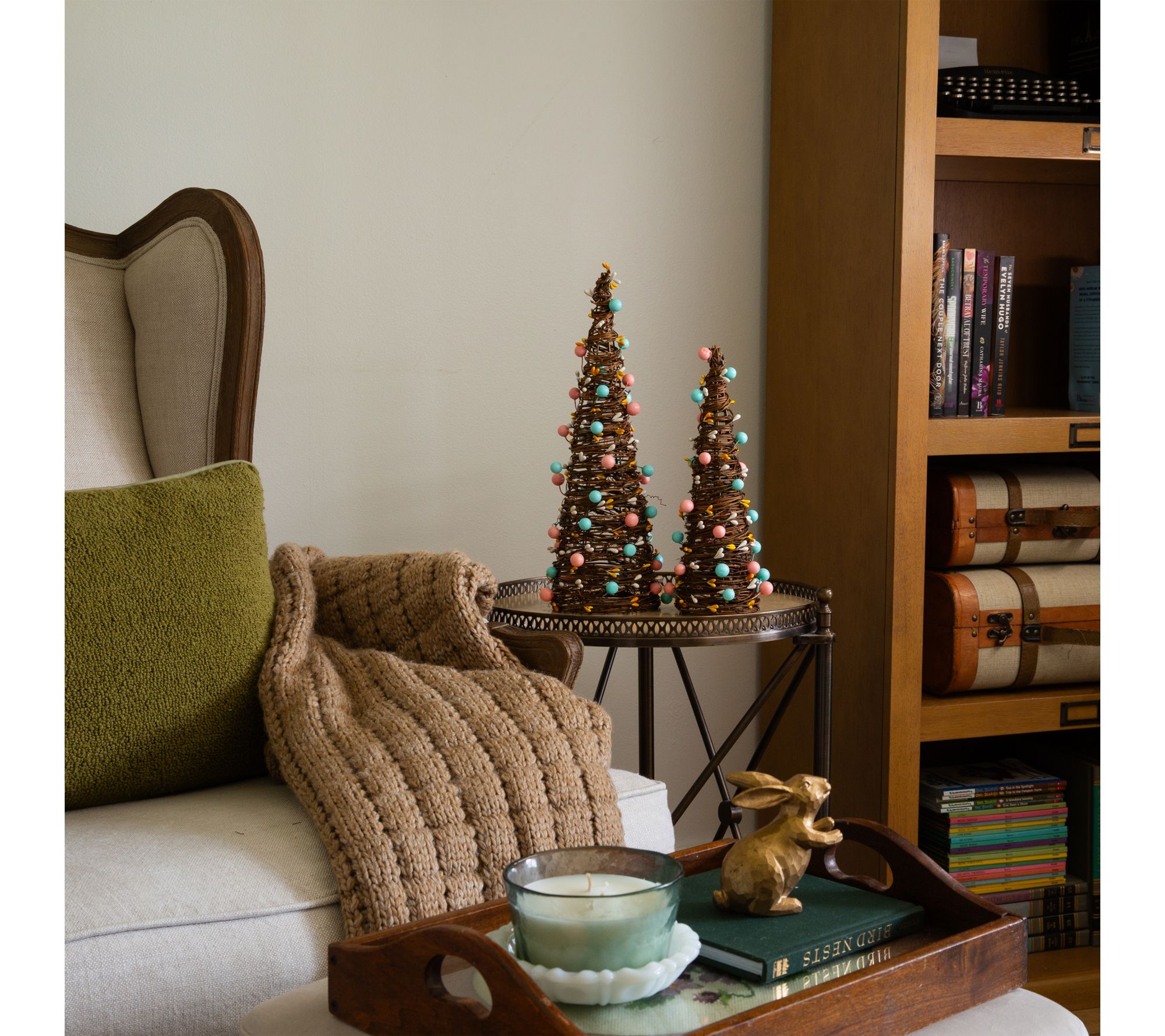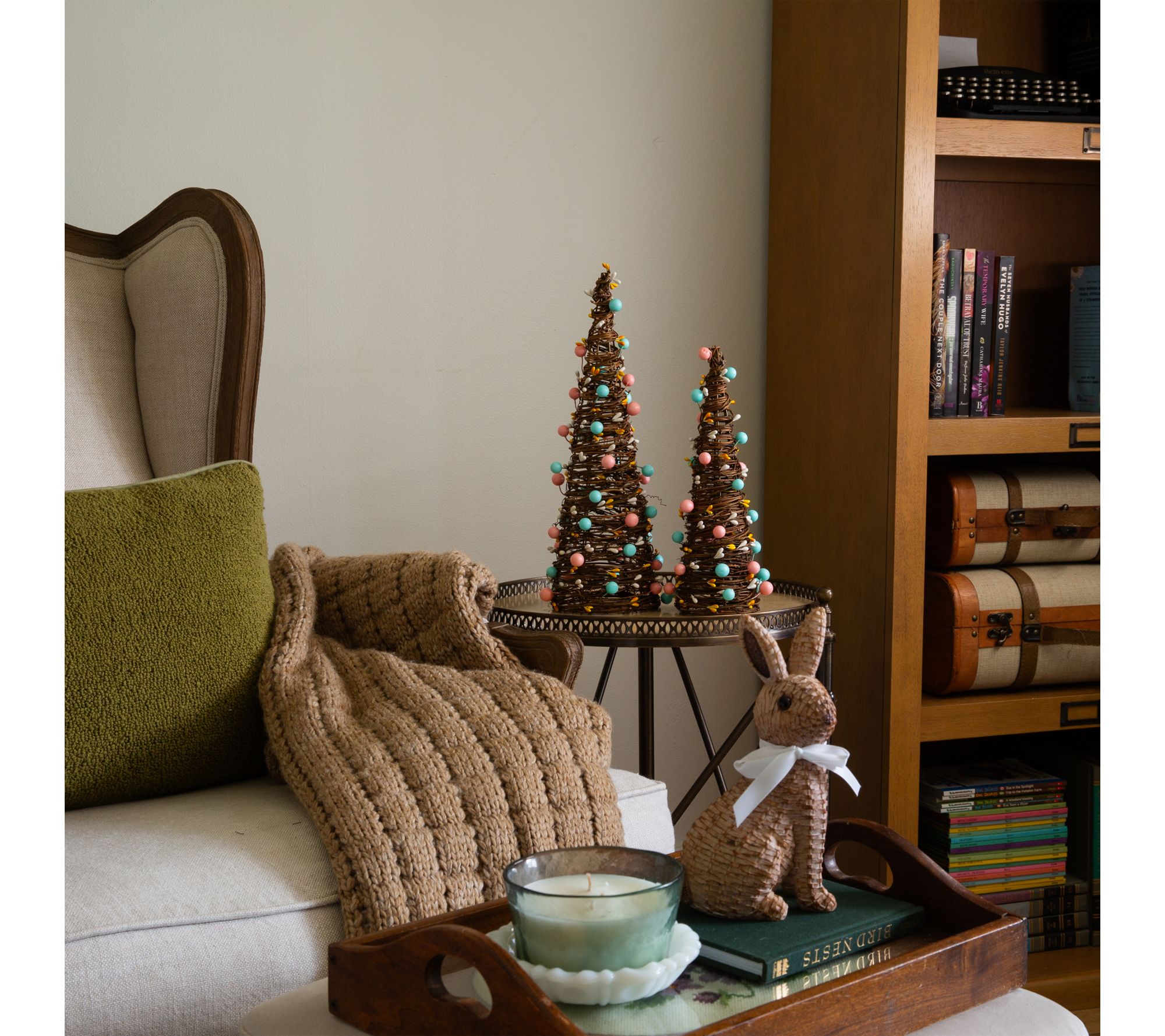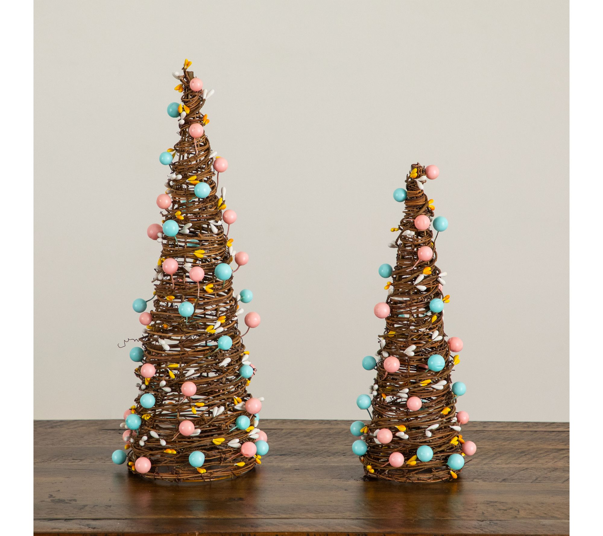 For an instant touch of springtime charm, decorate your home with this set of two rattan Easter egg trees. Each tree is topped with pastel eggs and yellow berry accents, making them ideal for brightening up a mantel, desktop, or entryway table with seasonal color and whimsy. From Nearly Natural.