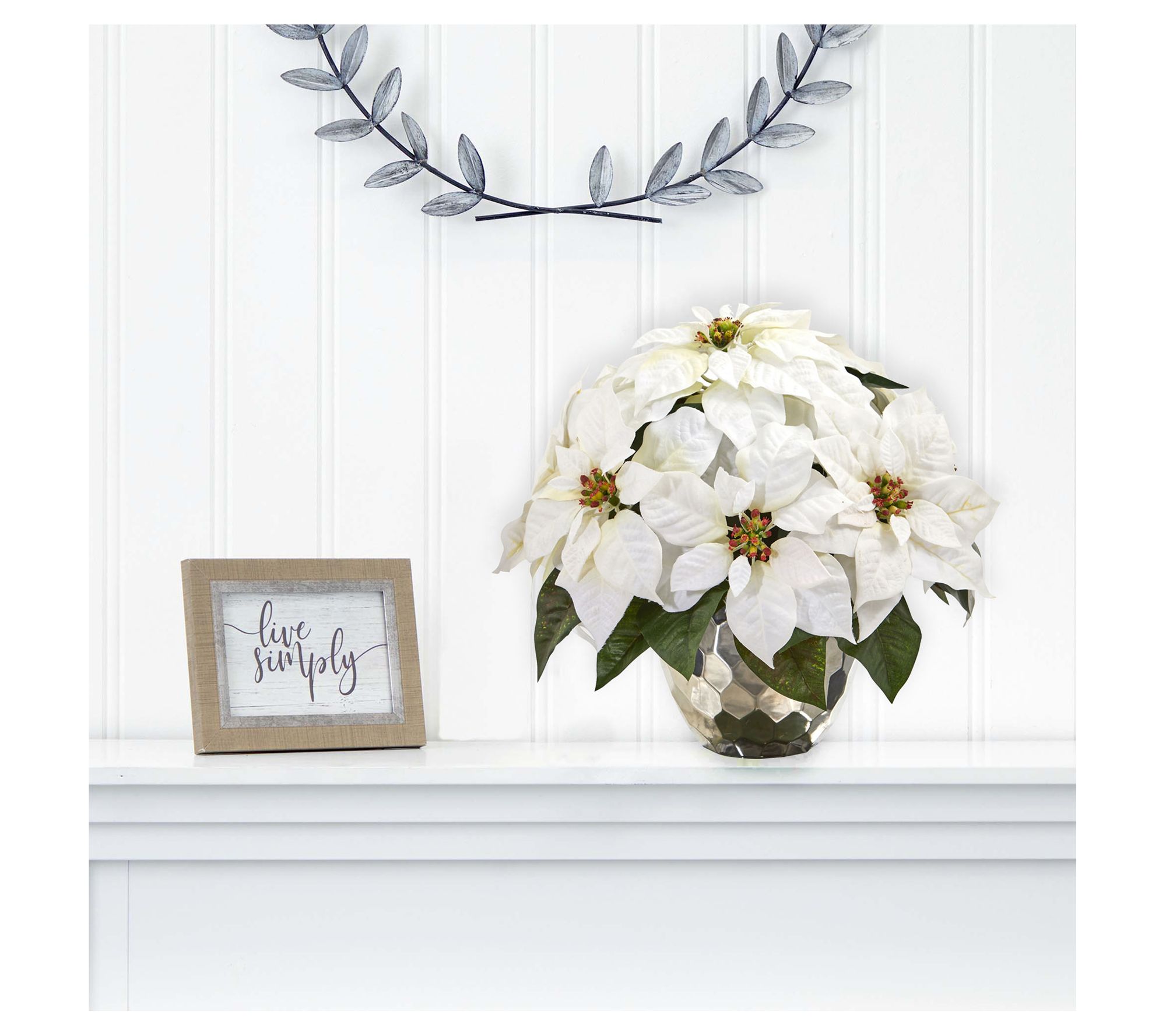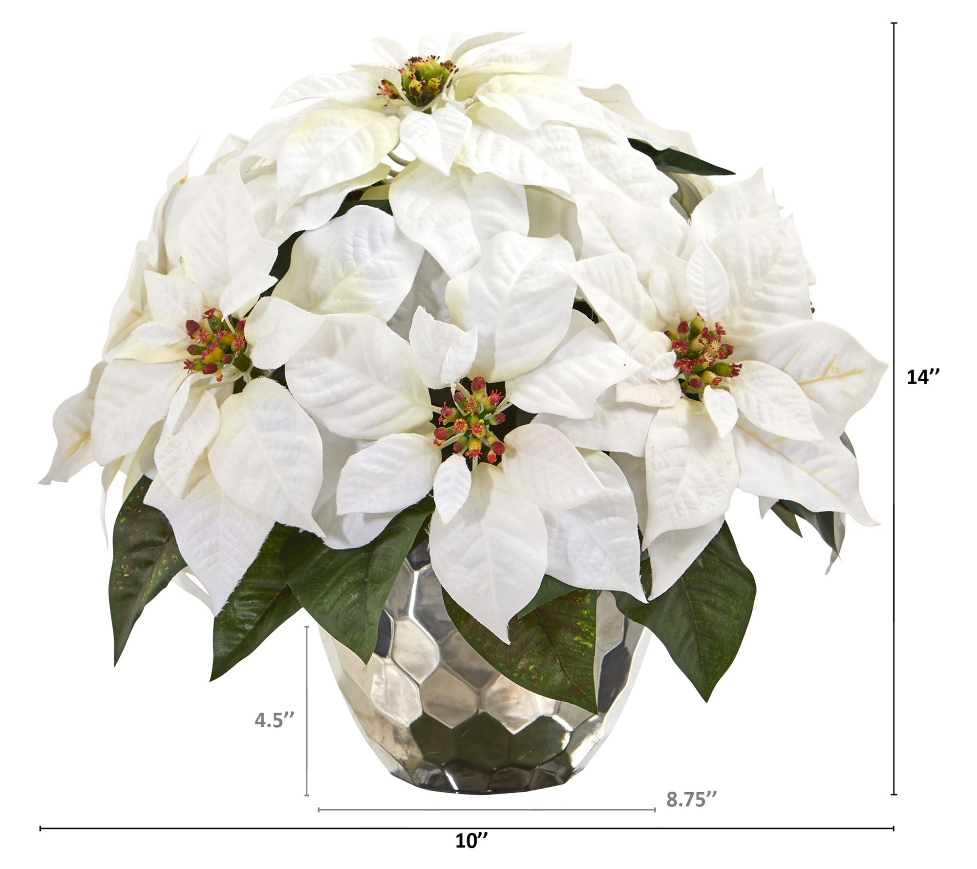Bring the holiday cheer into your home with this poinsettia artificial arrangement. This stunning display features a collection of silk poinsettia blossoms, beautifully arranged in winter whites and nestled among lush green foliage, all presented in a chic silver designer bowl. From Nearly Natural.