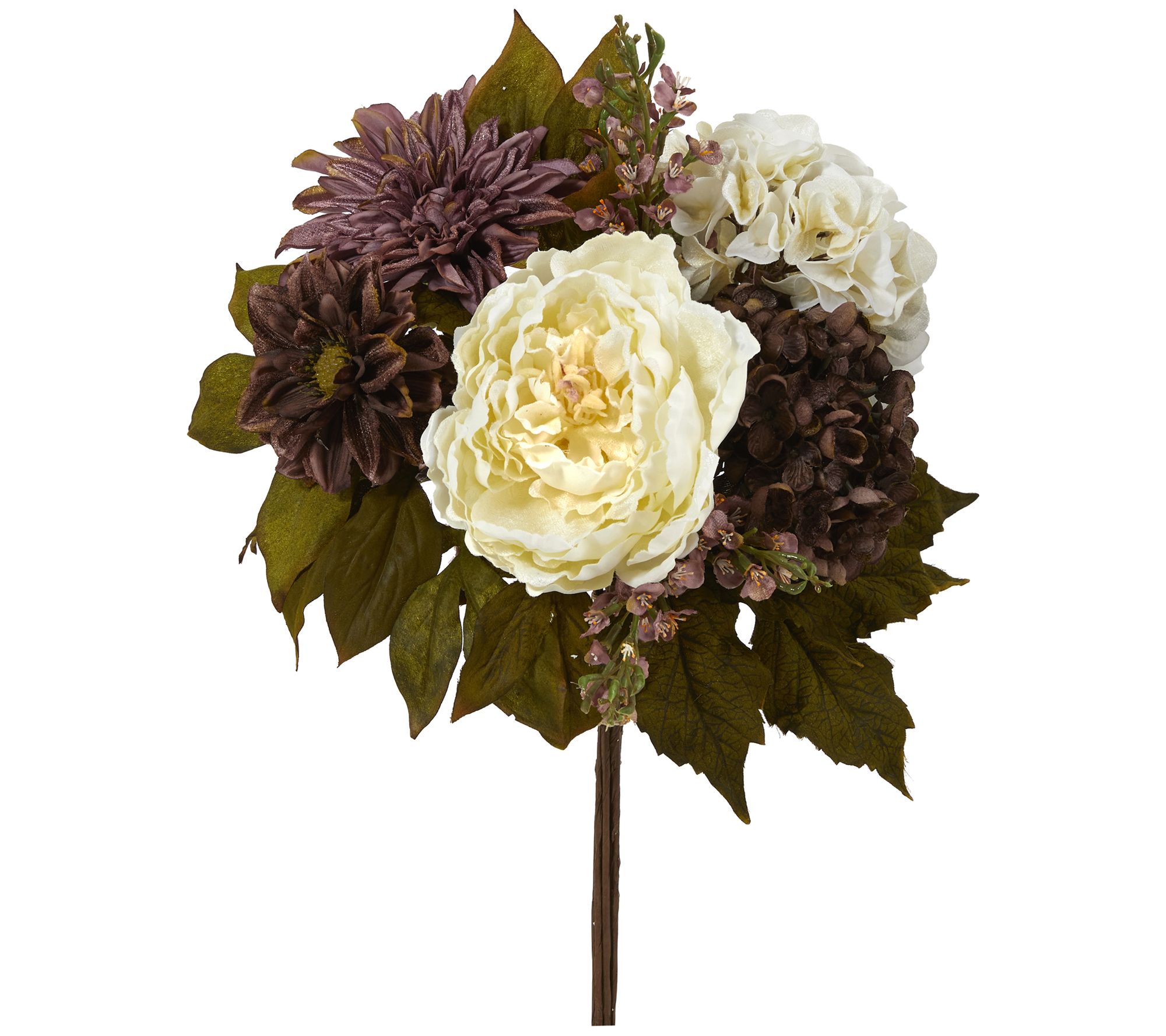 • Lifelike peony, hydrangea, and dahlia flowers in textured medley of foliage