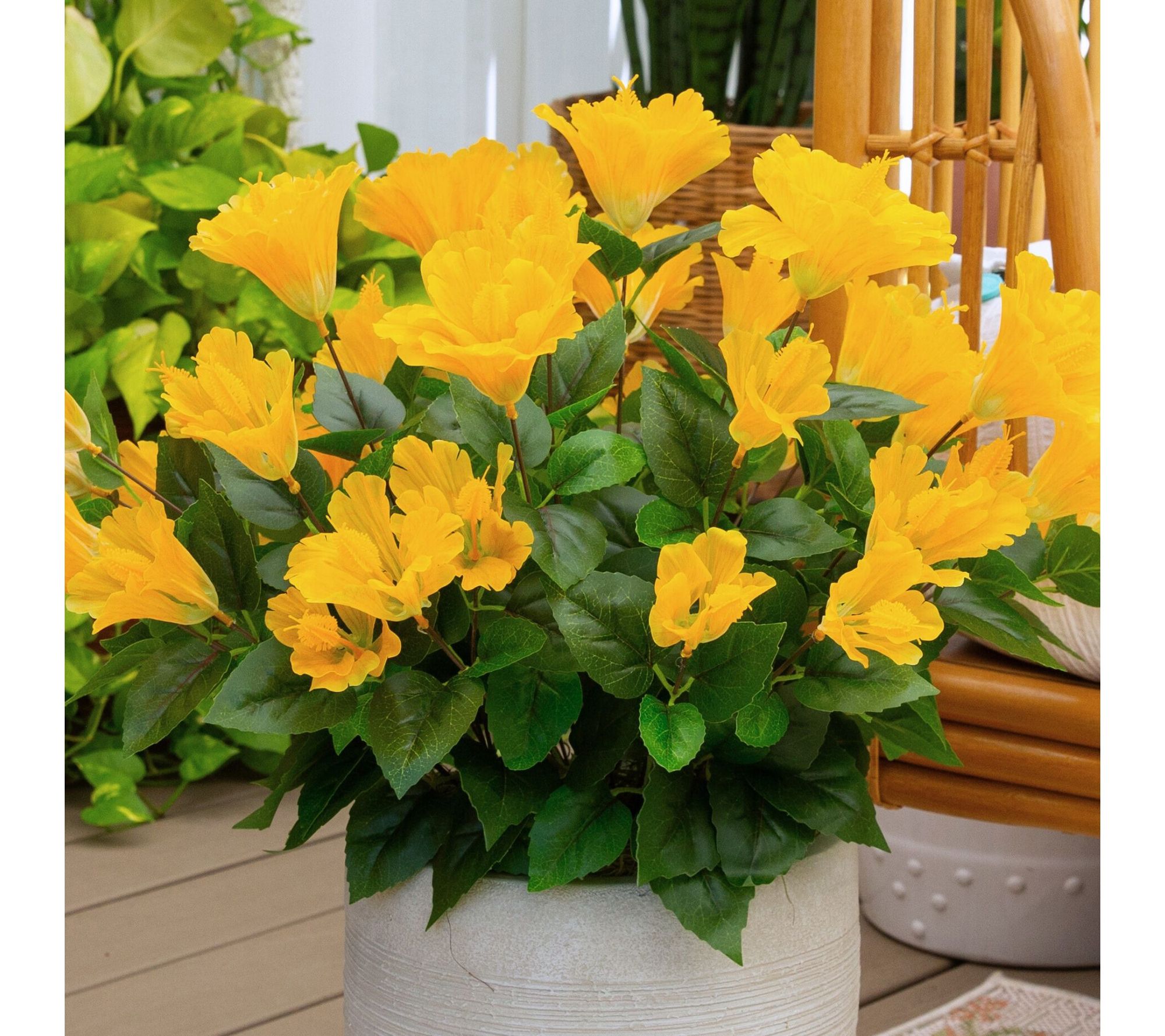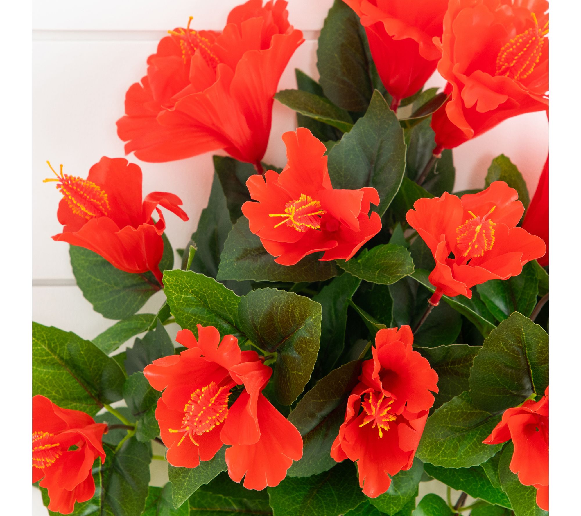 Turn any space into a tropical getaway with this set of three faux hibiscus bunches, bursting with vibrant flowers and lush greenery. Whether brightening up your front porch or adding a pop of color indoors, these lifelike blooms invite the spirit of summer into your home and offer endless possibilities to style in vases, window boxes, or planters. From Nearly Natural.