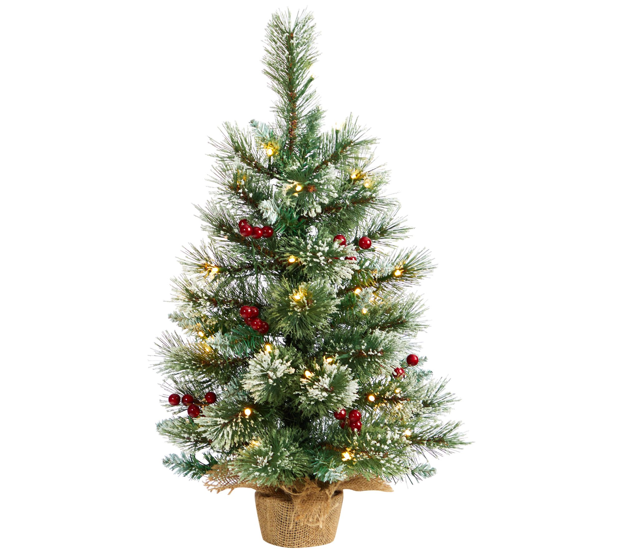 • Prelit lifelike pine and berry tree in burlap base