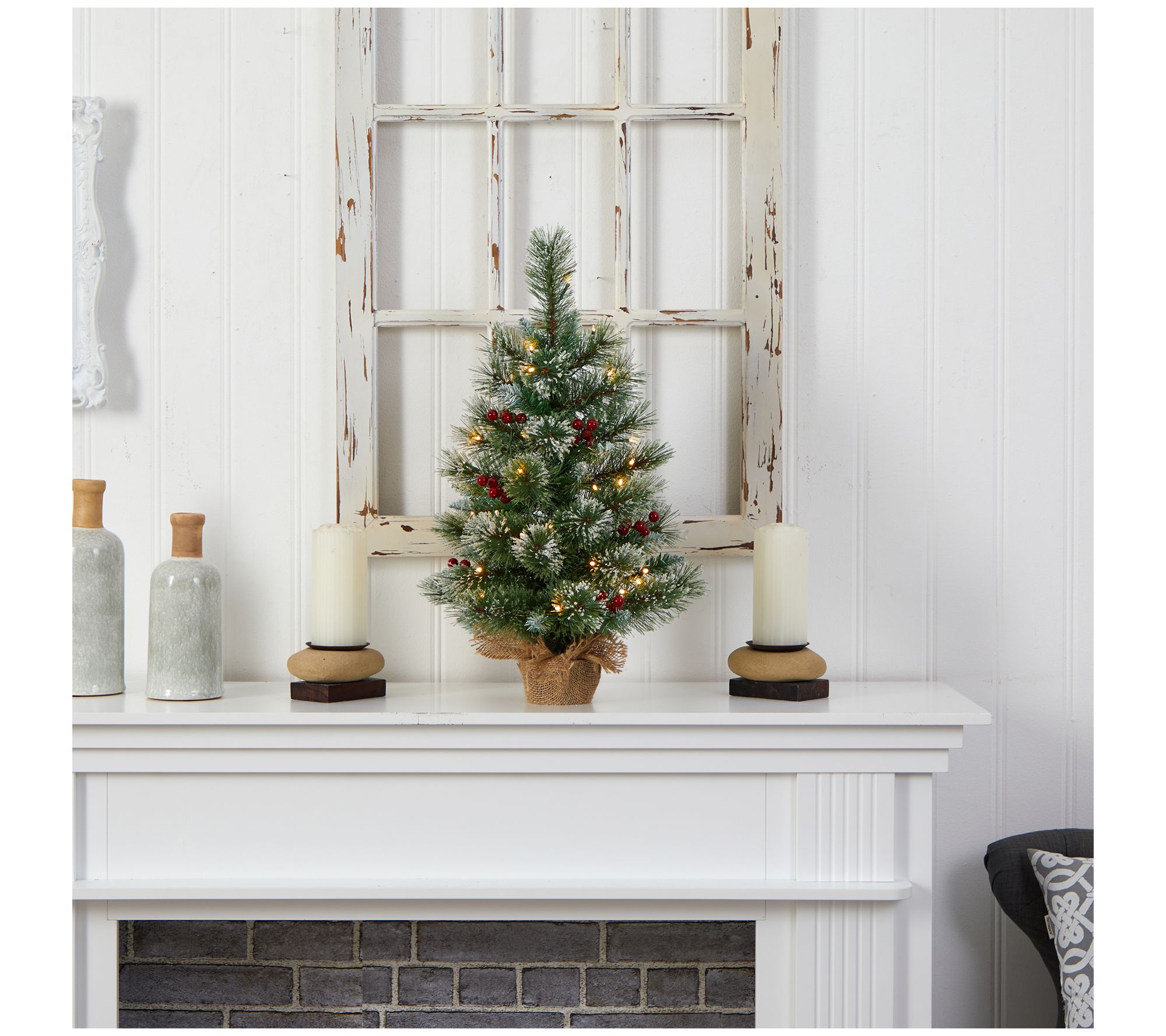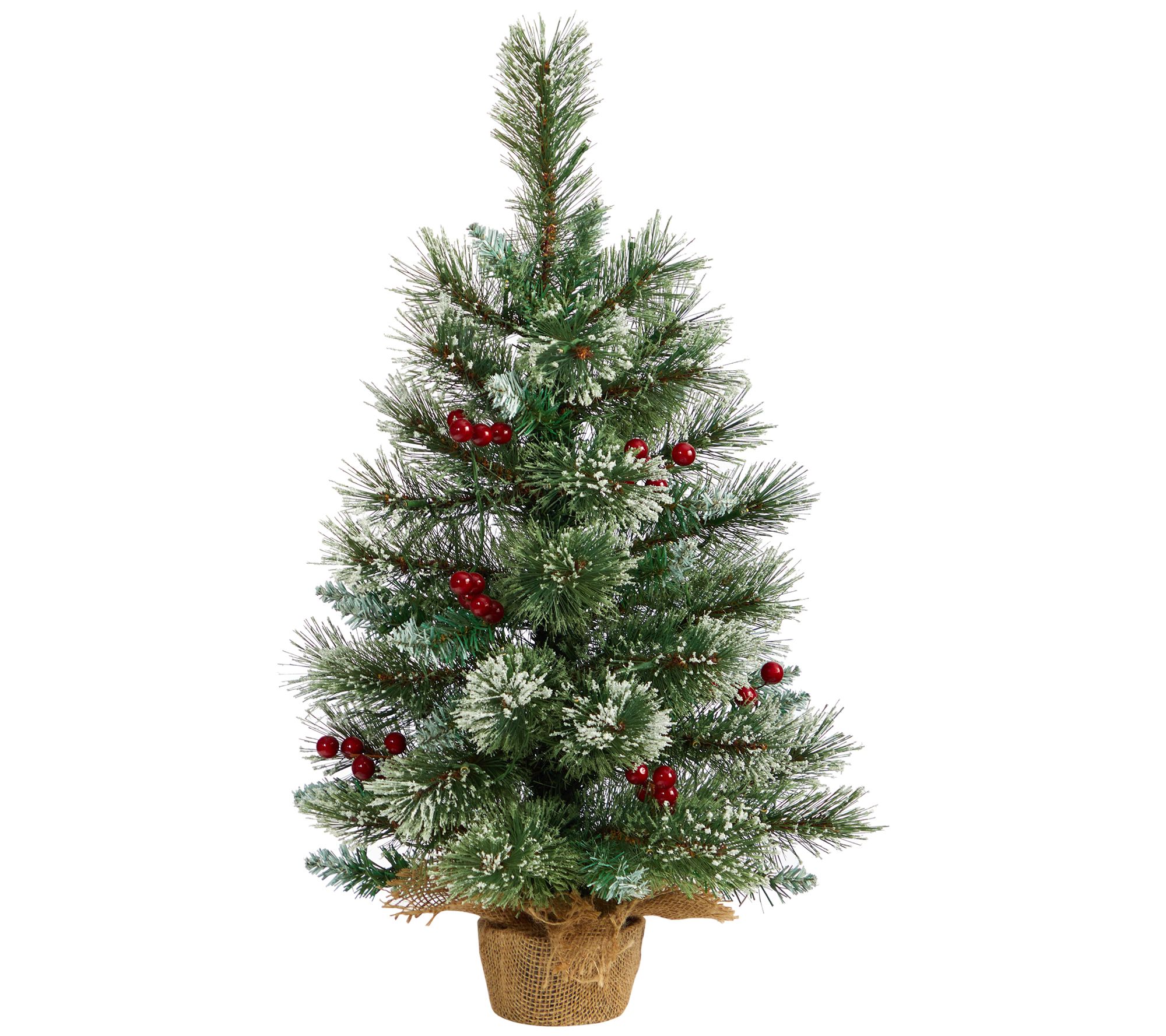 Spread holiday cheer to any tabletop with the Nearly Natural 2' snow-tipped pine and berry Christmas tree. This mini faux tree features lush PVC needles lightly dusted with snow and lifelike berries, prelit with 35 clear LED lights, and 50 bendable branches. Standing 2'H from a burlap base, it brings a rustic vibe to your office, desktop, or any tight area. From Nearly Natural.