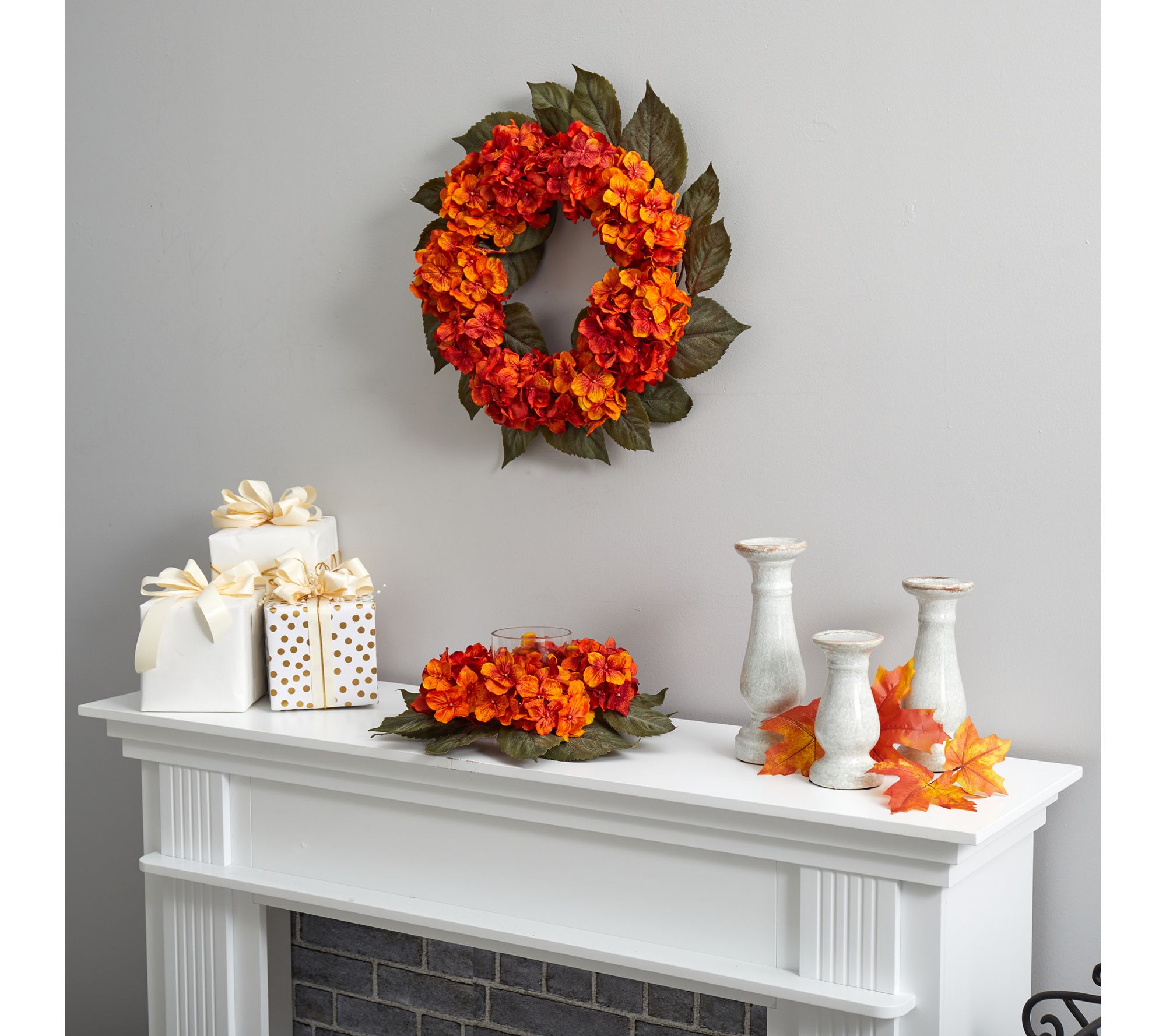 Welcome the beauty of autumn into your home with this artificial wreath. Featuring lifelike hydrangea flowers arranged in a circular cluster on a bed of green leaves, it brings a touch of seasonal flair to your living space. From Nearly Natural.