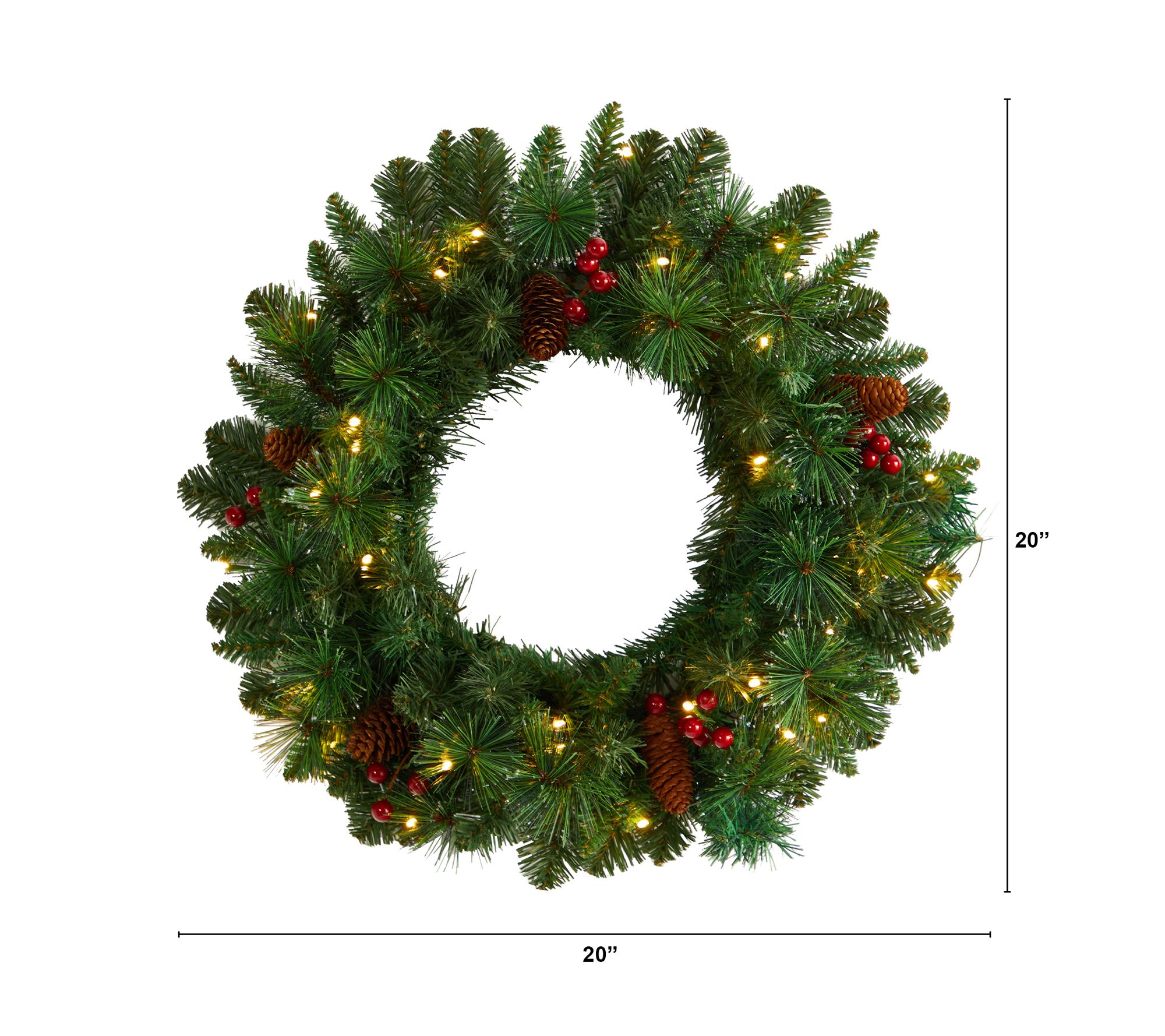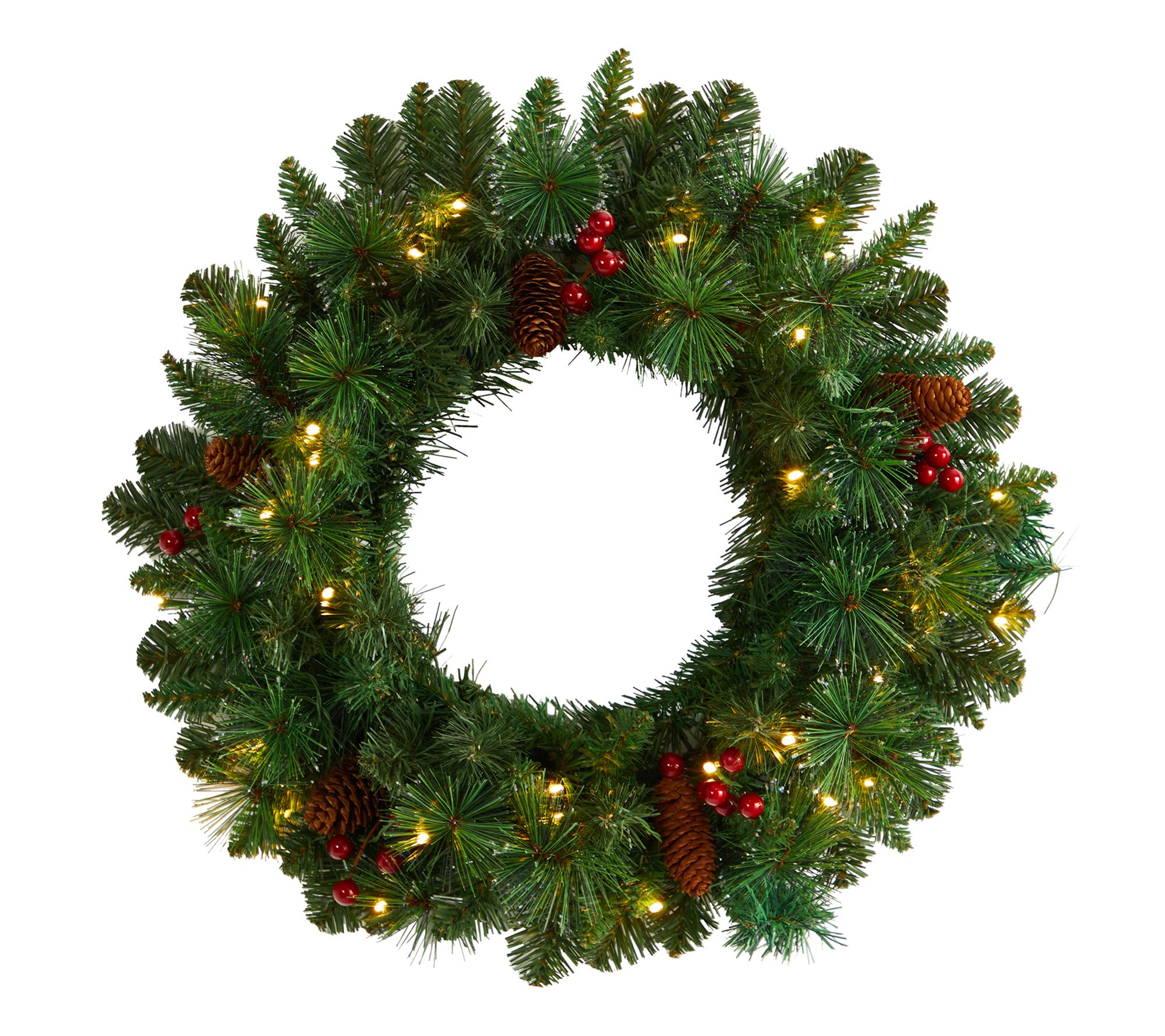 This beautiful wreath features lifelike pine foliage, faux pinecones, and berries, all frosted with a hint of faux snow. Pre-strung with 35 lights, it effortlessly illuminates any wall or door, transforming your entrance into a festive wonderland. From Nearly Natural.
