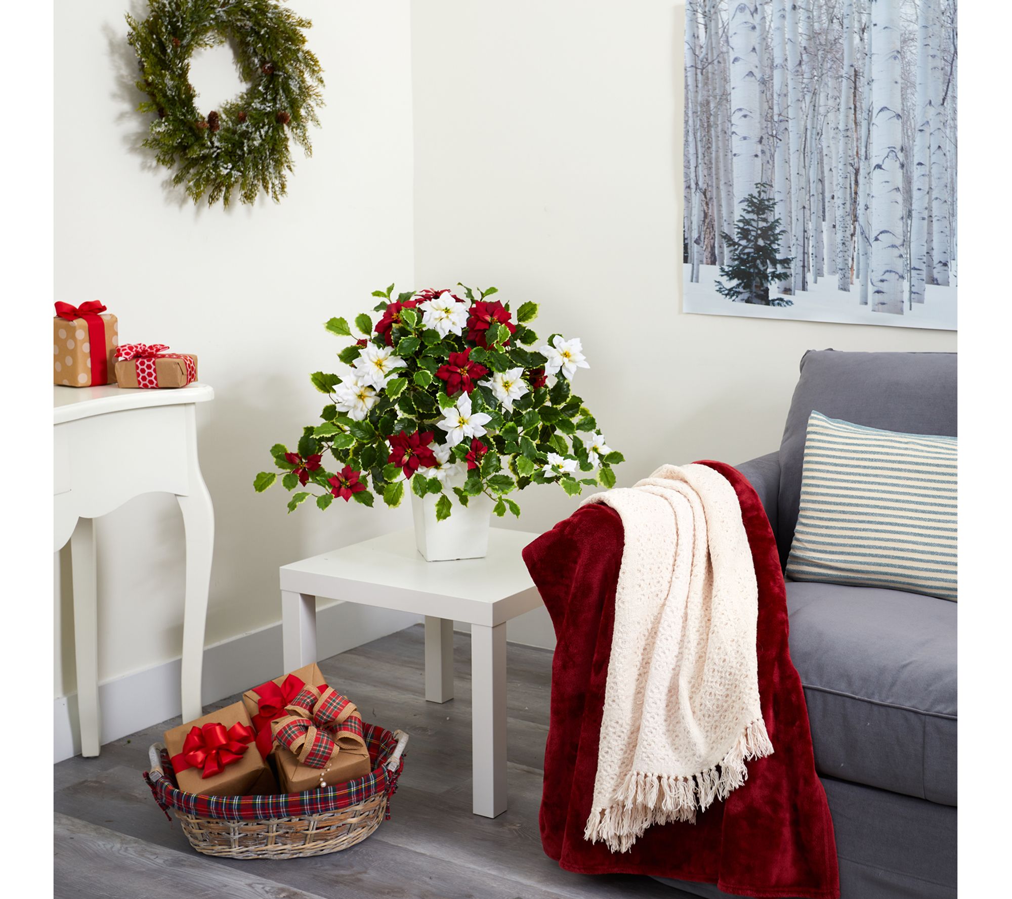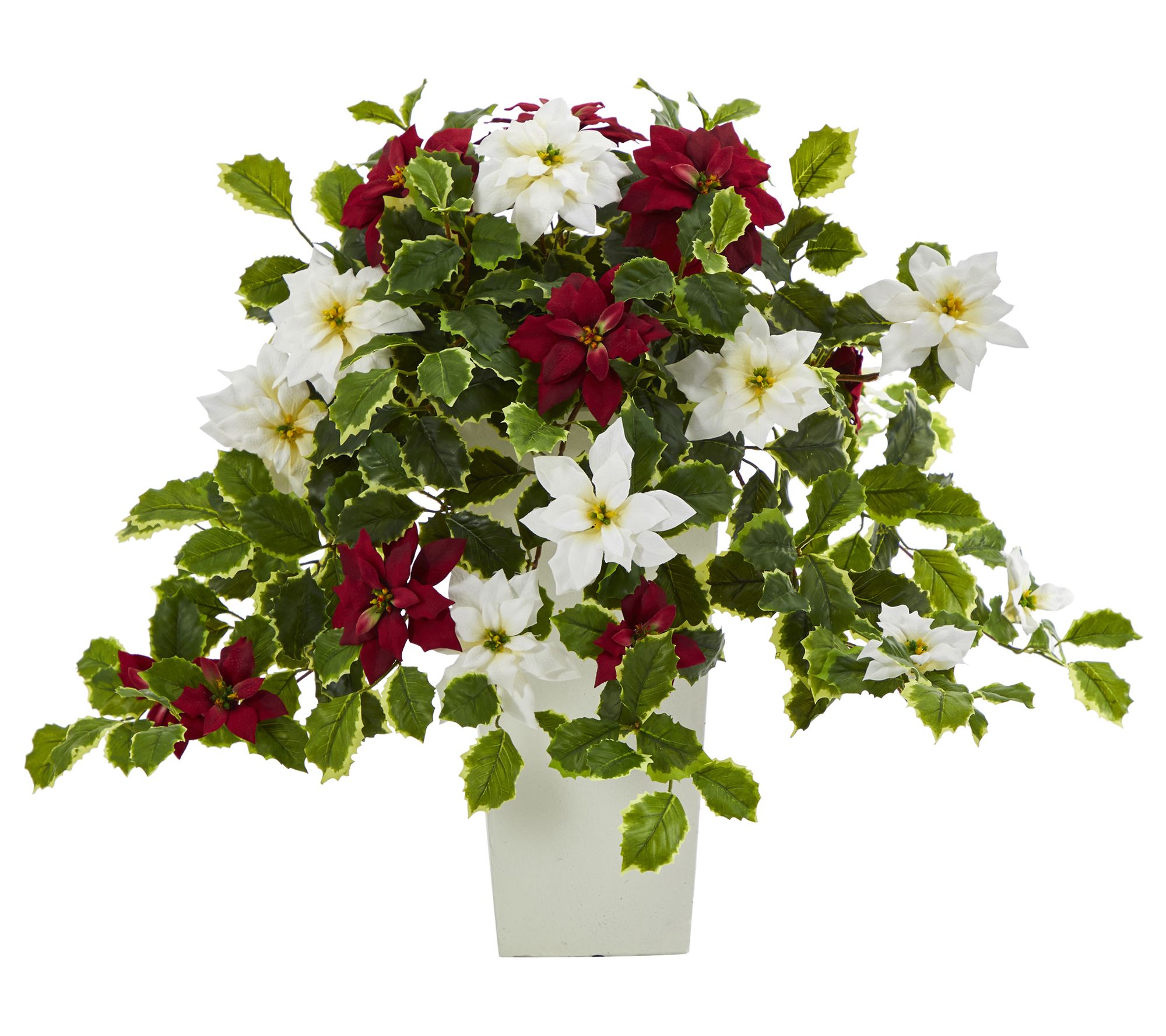 Showcase seasonal cheer throughout the winter season with the Nearly Natural 23" poinsettia and variegated holly plant. This lifelike arrangement features variegated holly leaves and iconic poinsettia blossoms, intricately designed with naturally occurring details. From Nearly Natural.