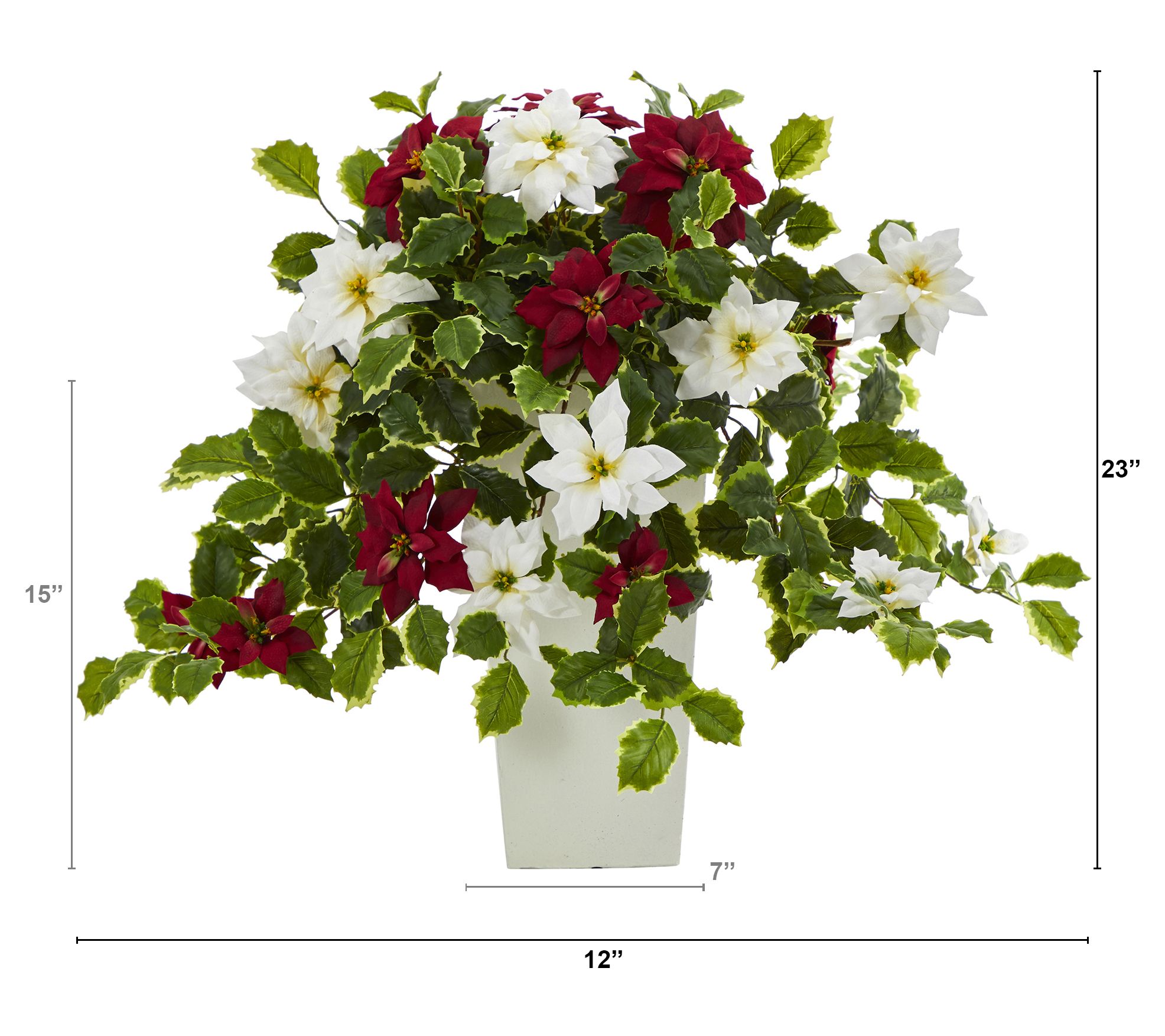 • Features variegated holly leaves and poinsettia blossoms
