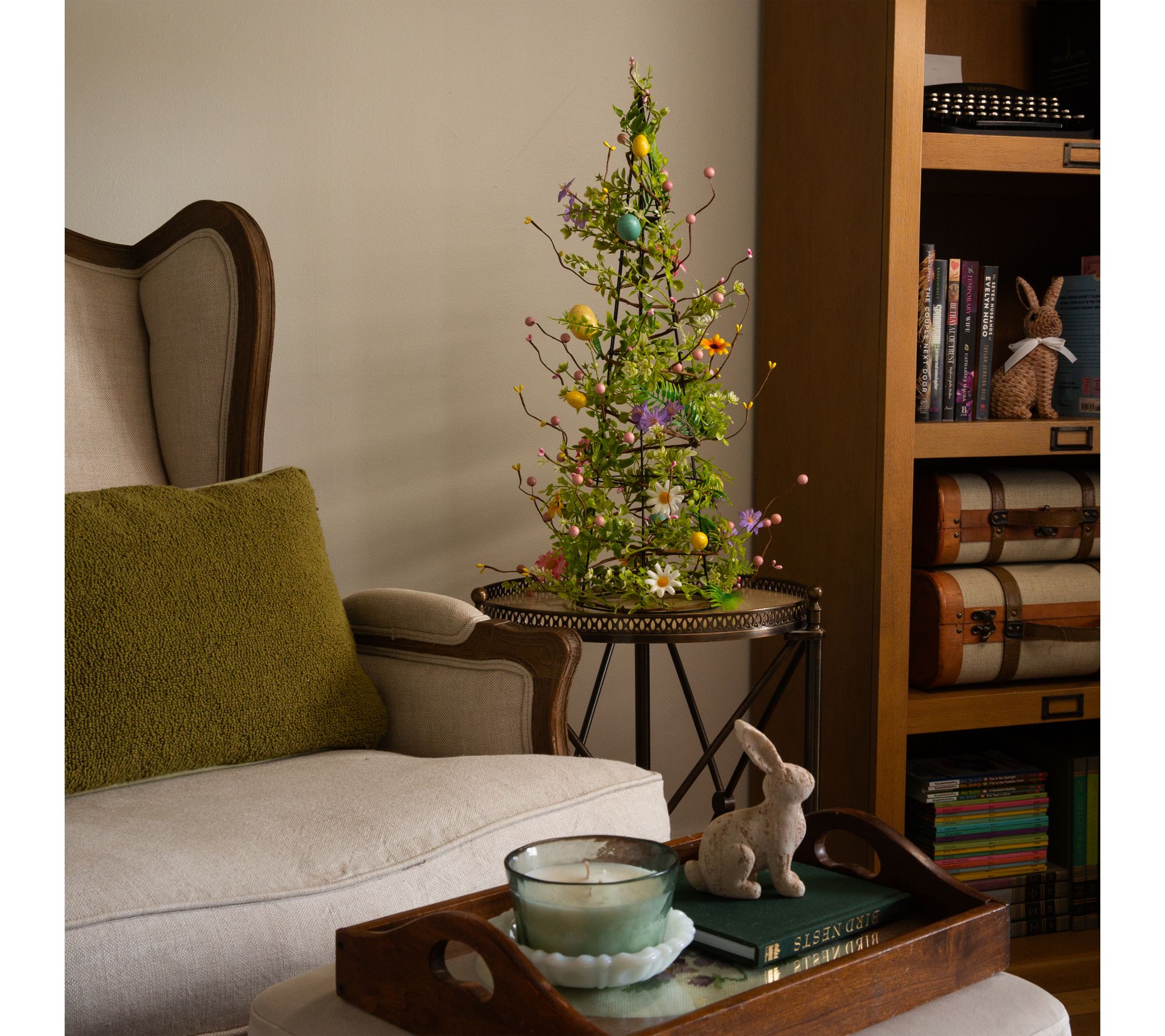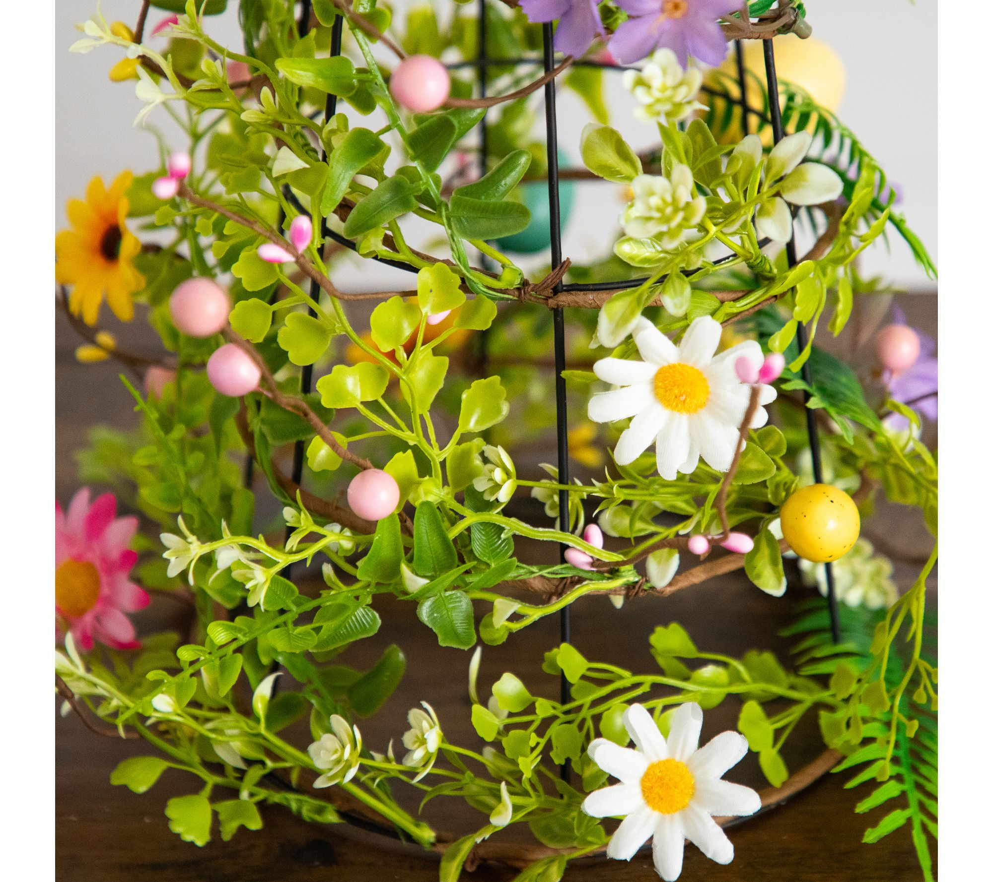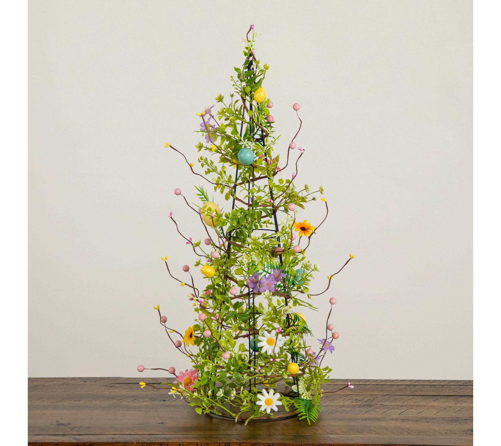 Lifelike cone tree design with pastel eggs, wildflowers, and green leaves