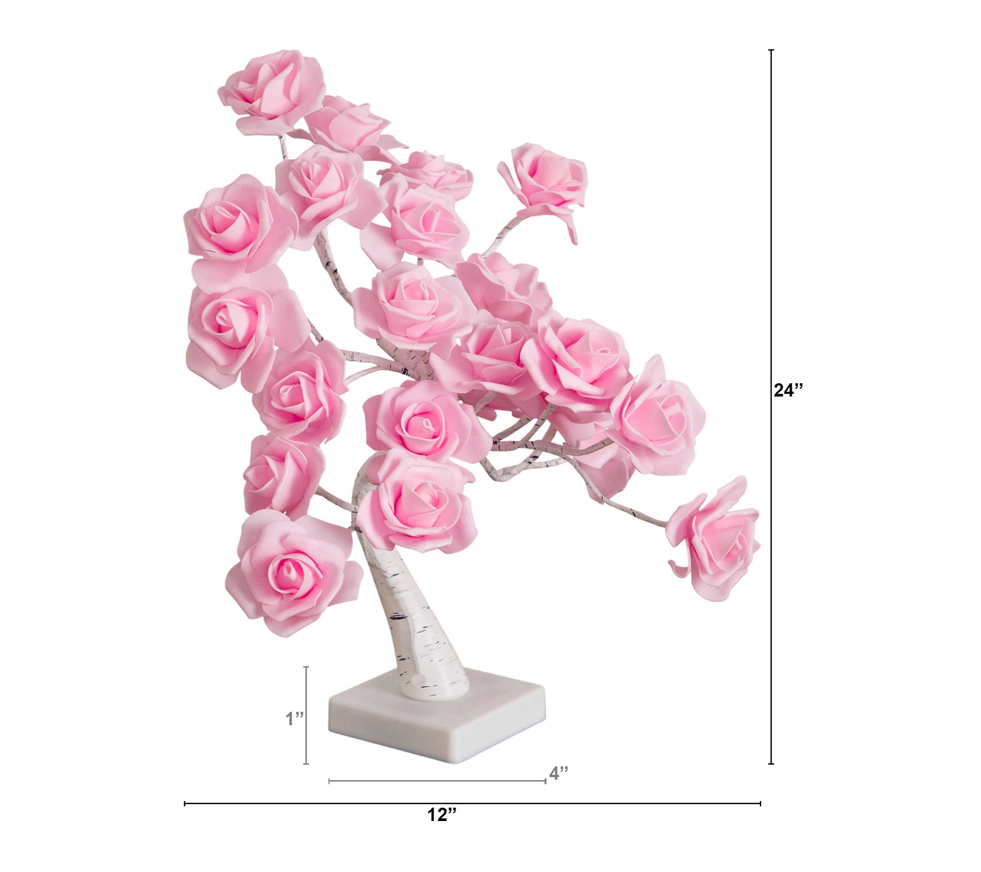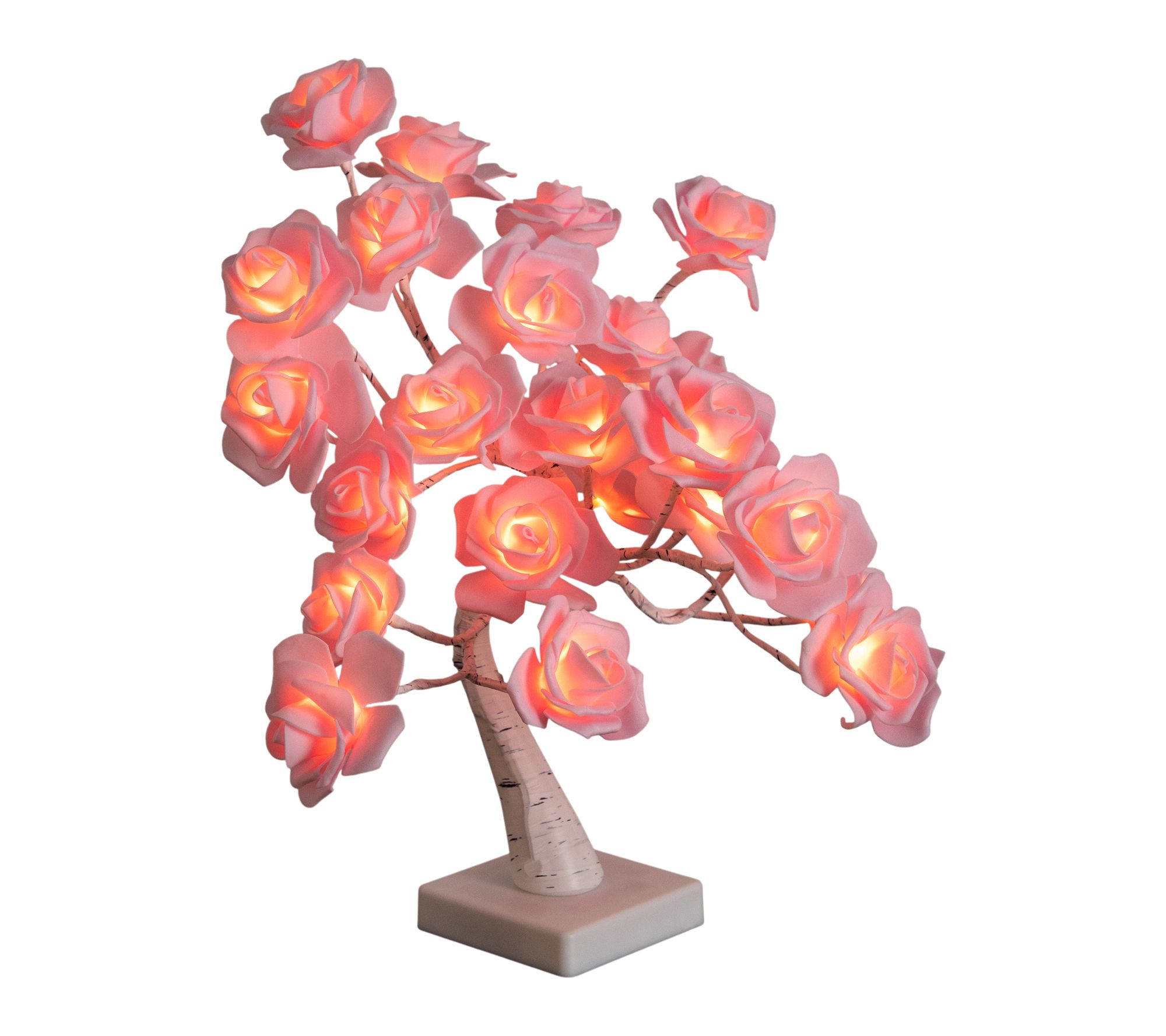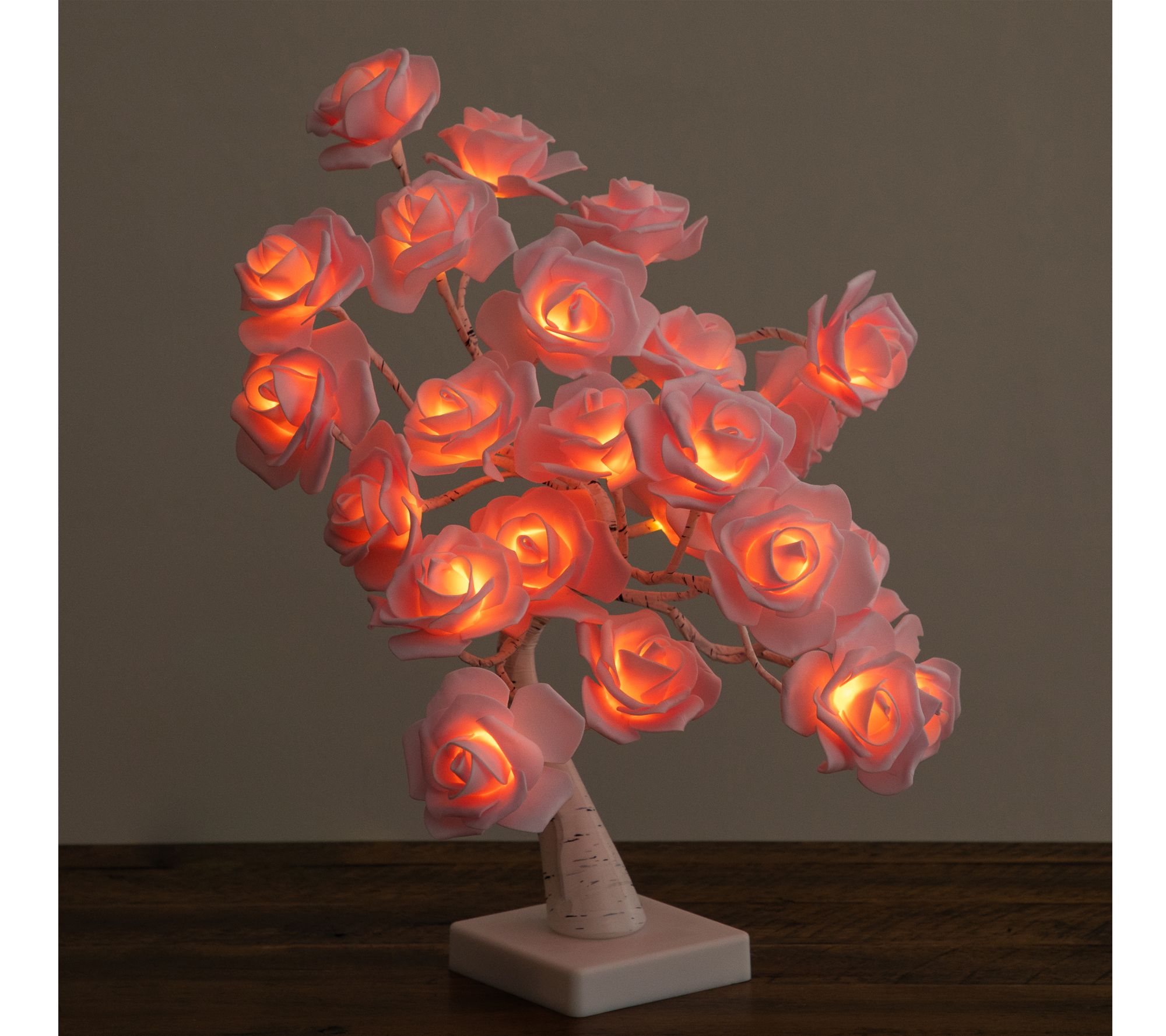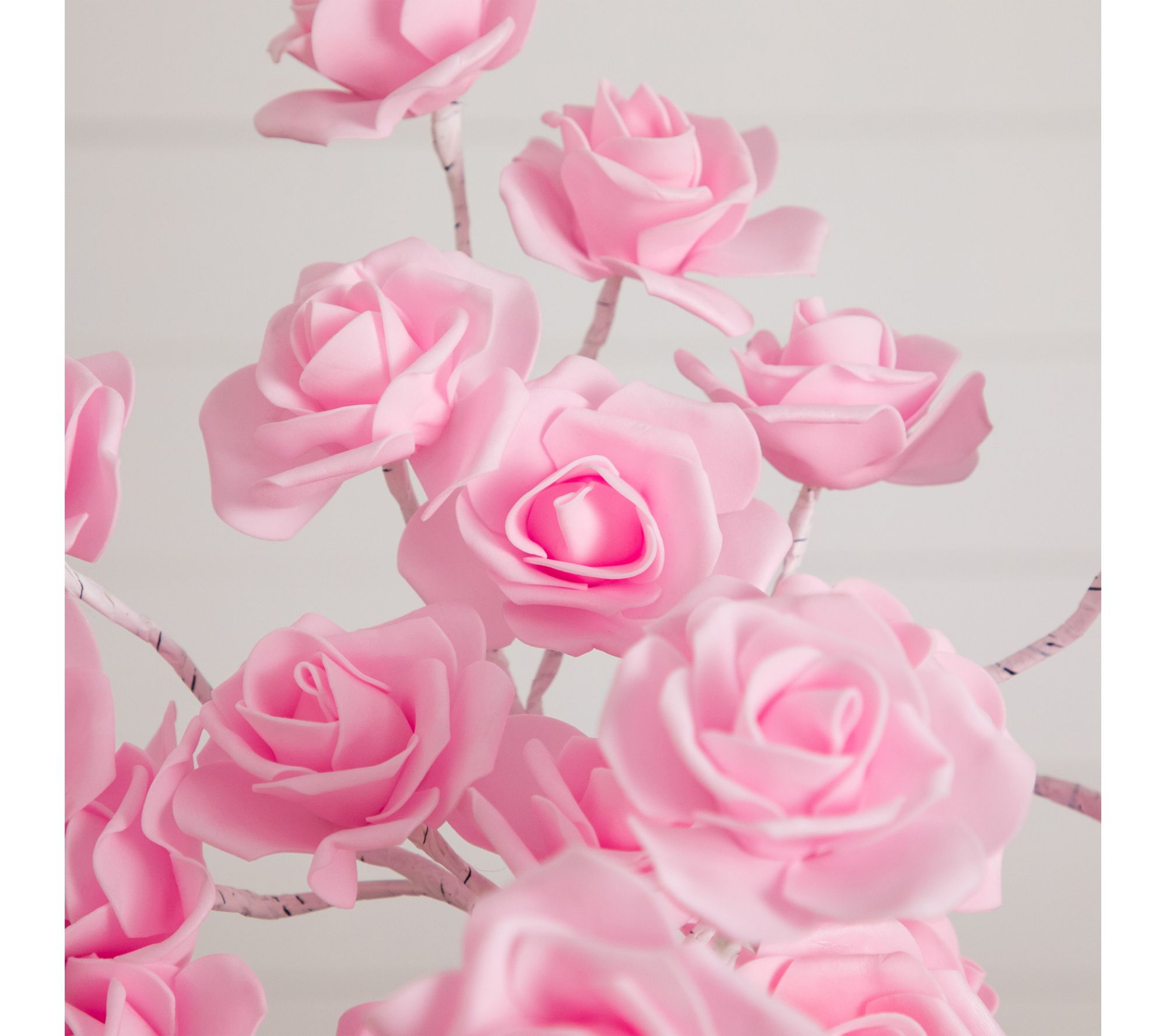 Features rose-shaped LED lights on birch-style twig branches for a modern romantic touch