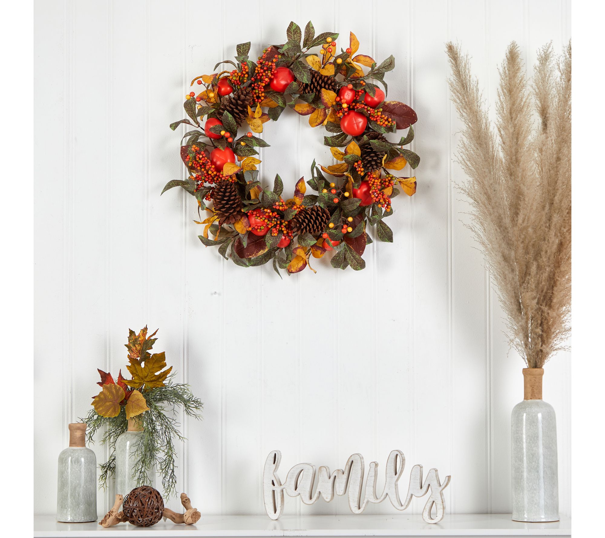 Welcome your guests with festive fall charm when you hang this decorative wreath on your door or in your entryway. From Nearly Natural.