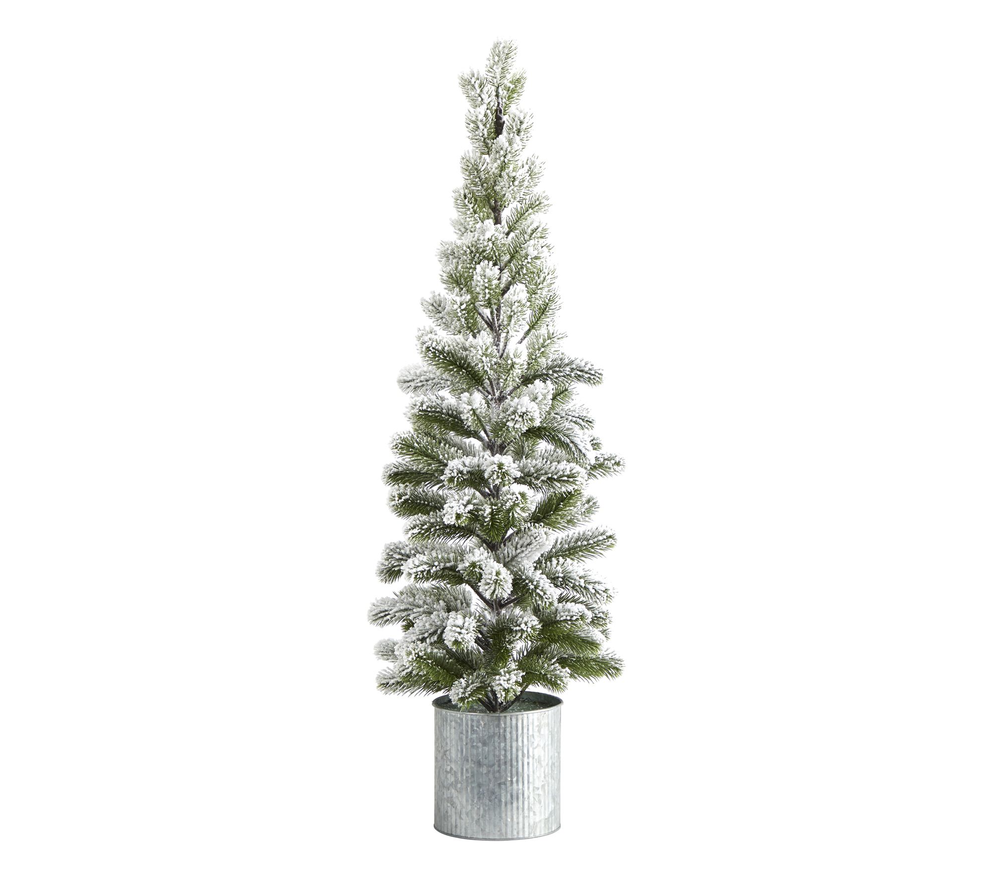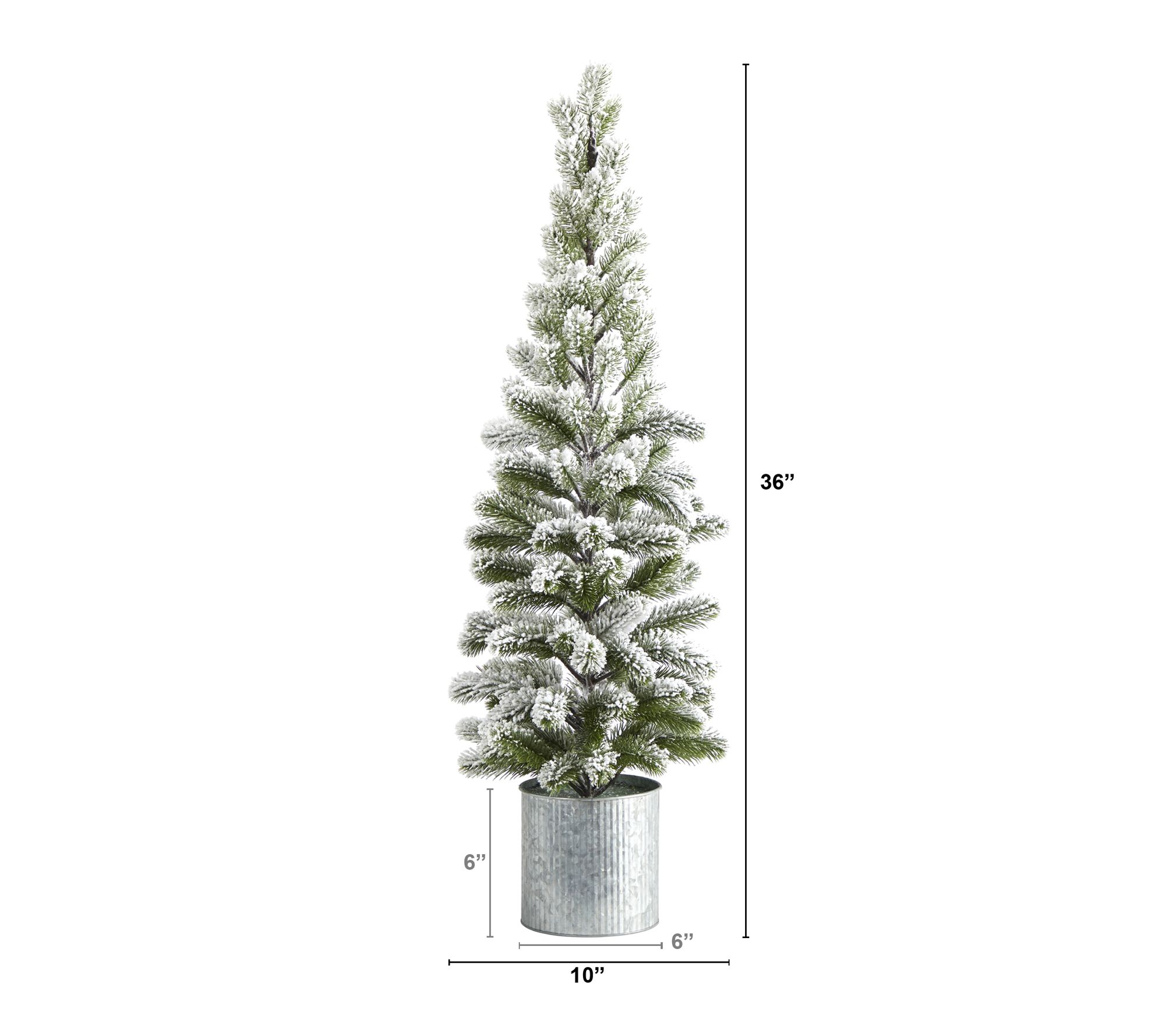 • Faux flocked pine tree in tin metal planter