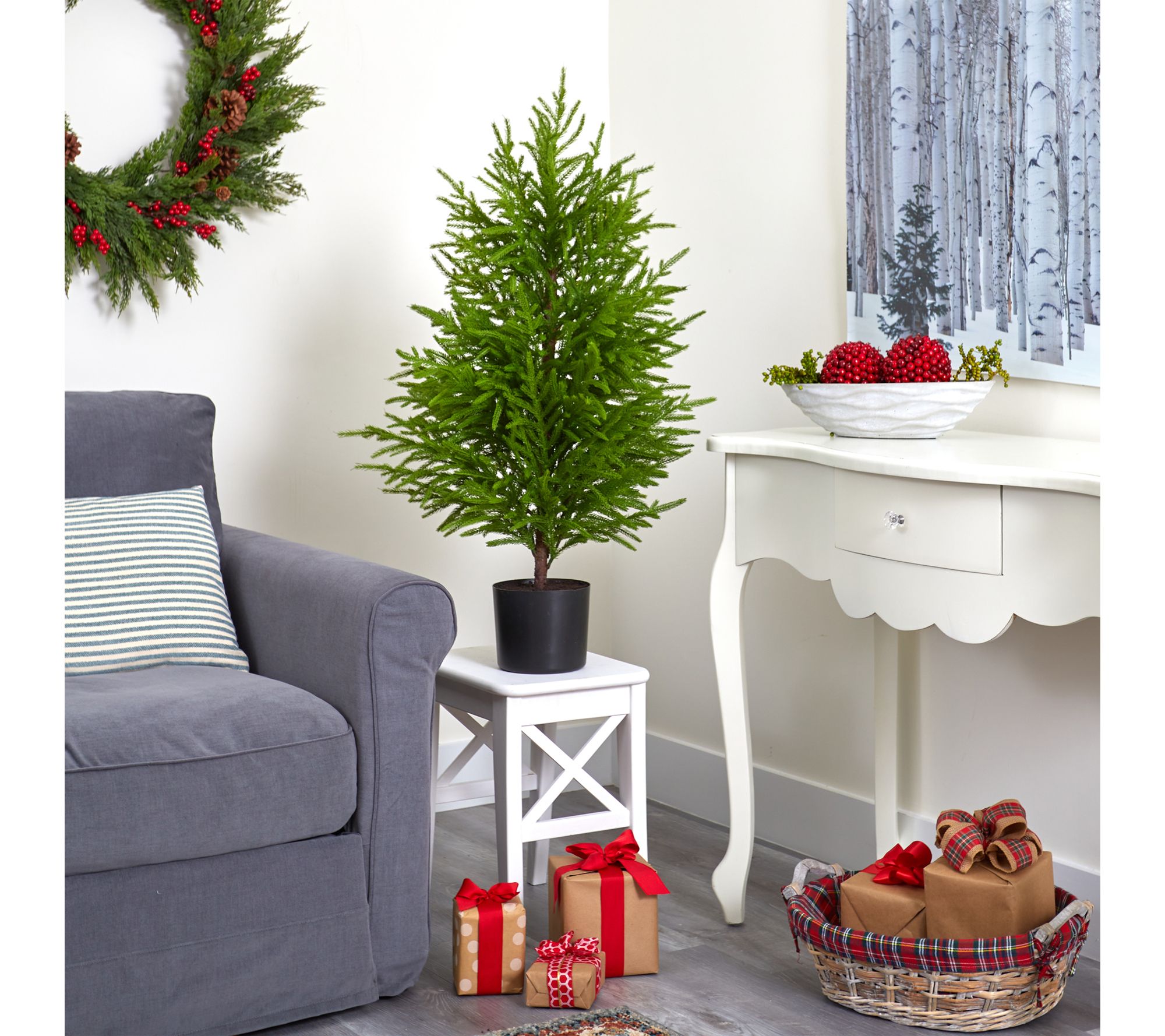 Create a welcoming holiday atmosphere with this lifelike Norfolk Island Pine artificial tree. Its lush green branches invite you to add ornaments or festive accents, so you can celebrate your traditions in any room. Easily enjoy the look of a classic Christmas tree -- without the upkeep -- all season long. From Nearly Natural.