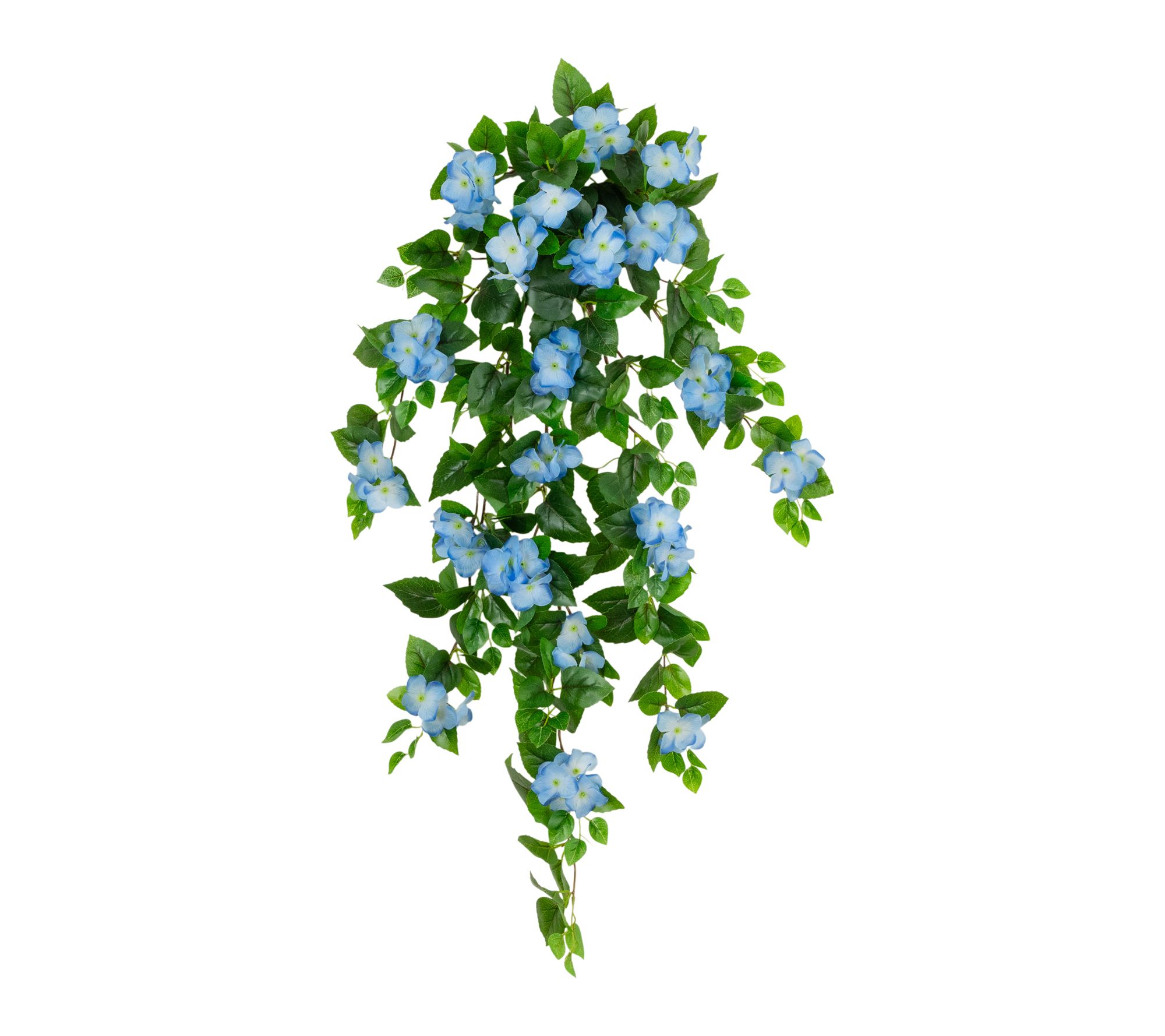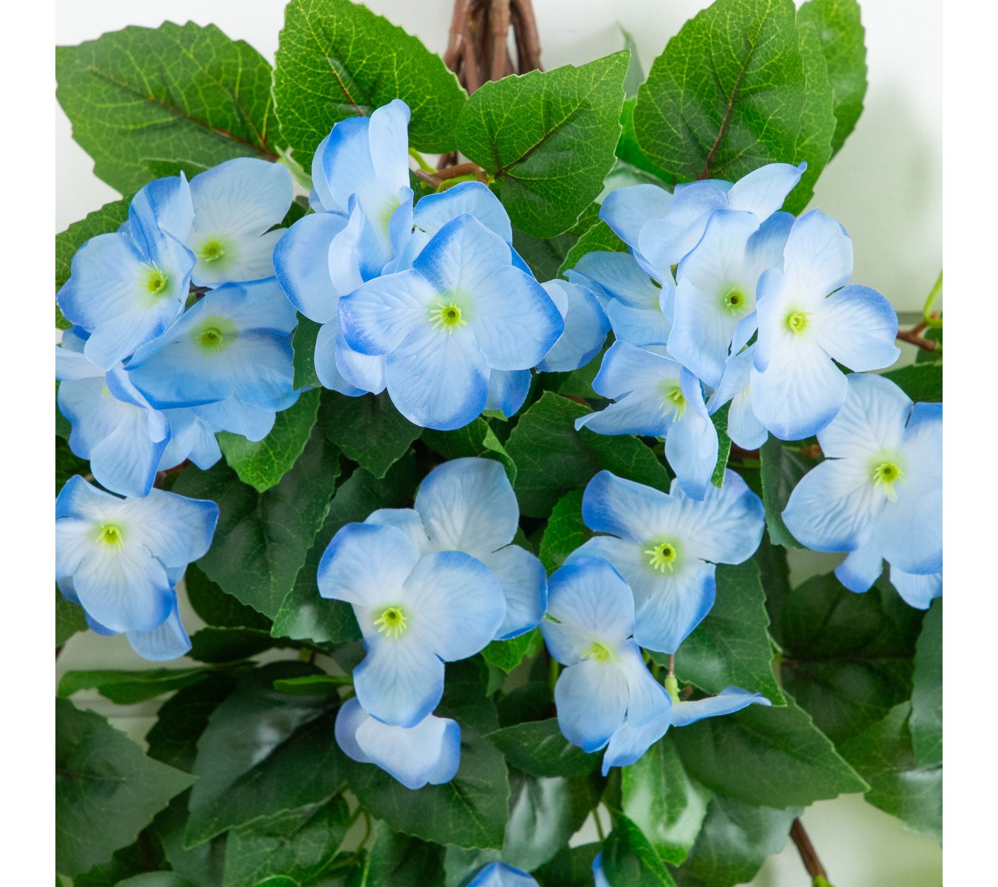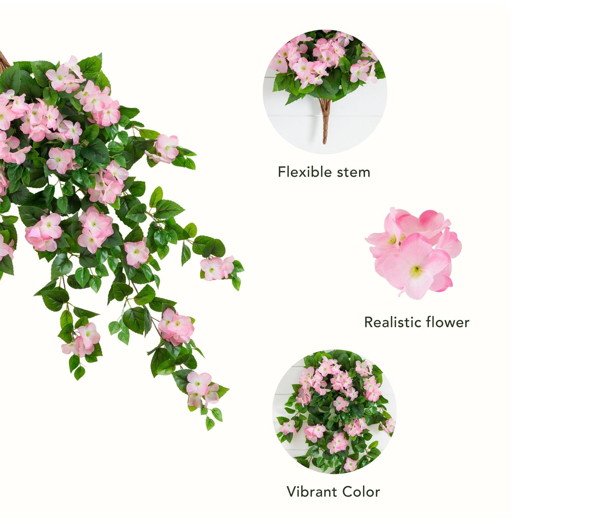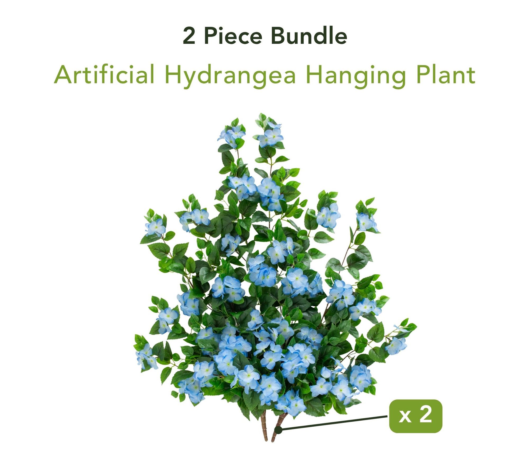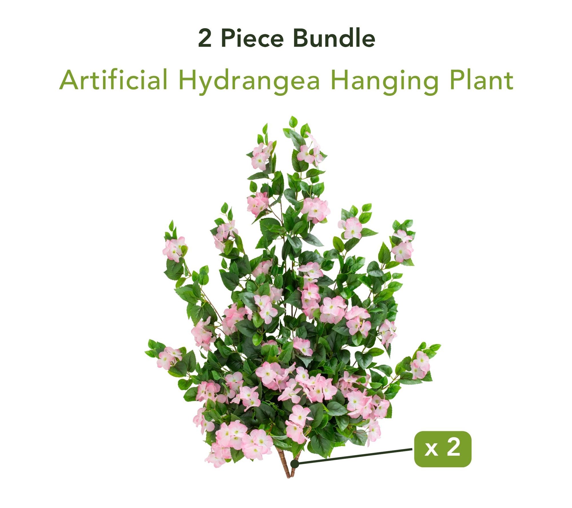 Includes two hanging faux hydrangea plants; additional items (shown) not included