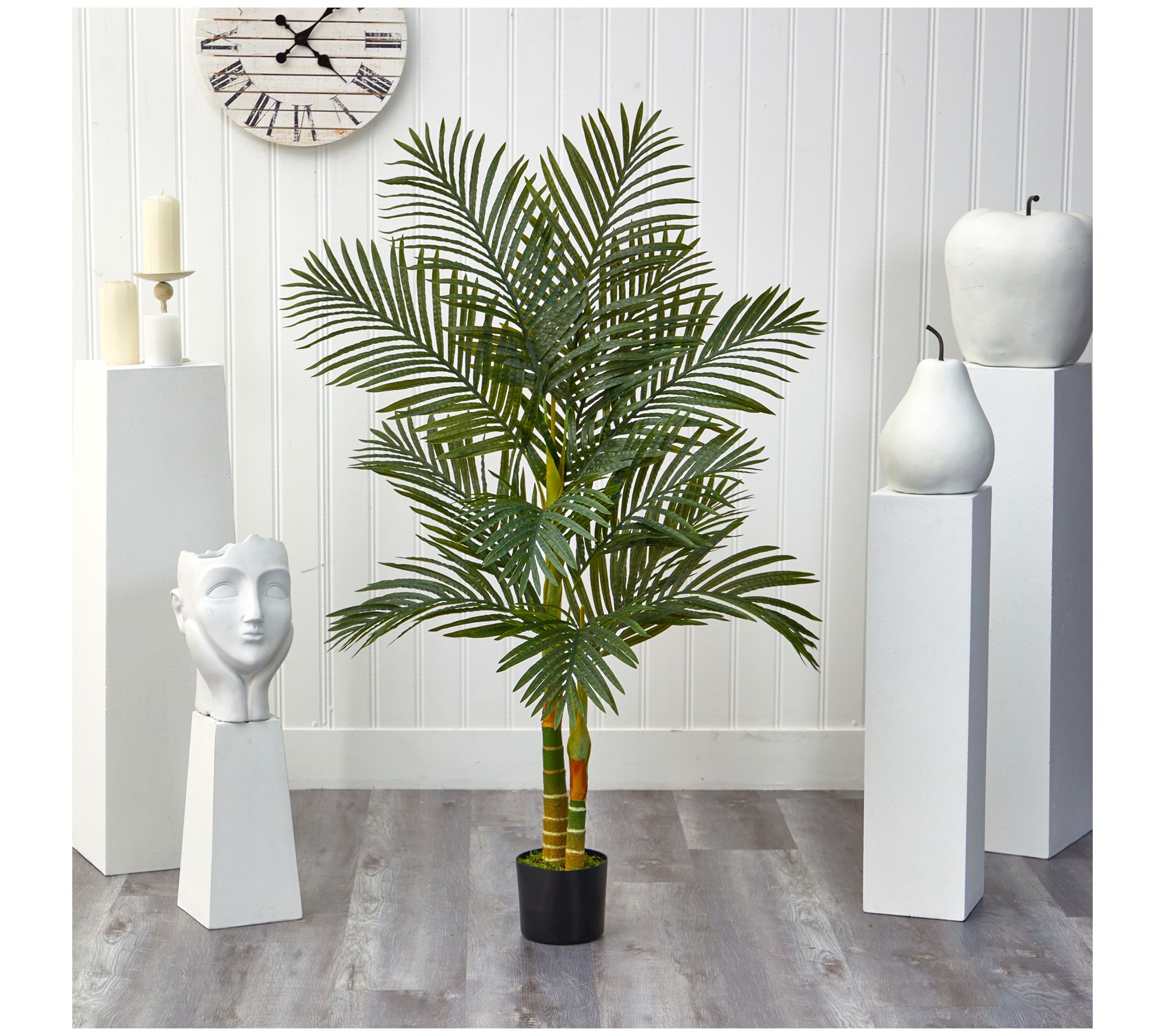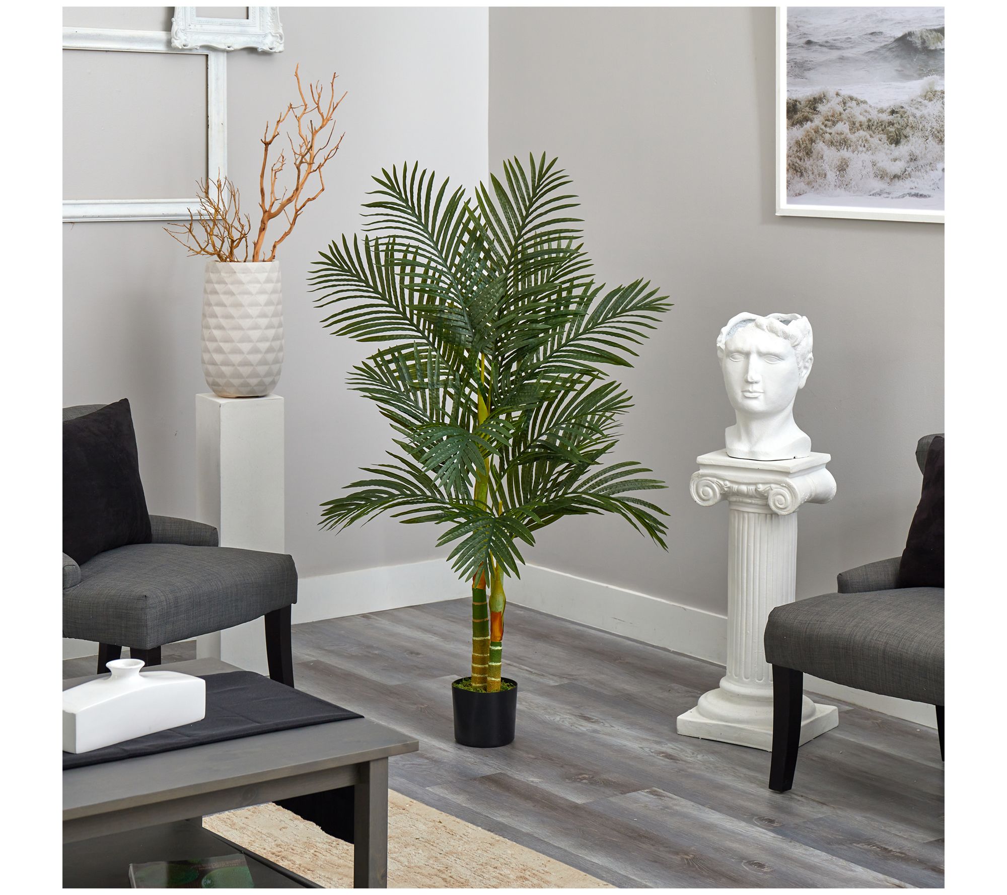 Bring the essence of tropical paradise into your living space with this realistic palm tree. Its lush green leaves and striking golden fronds create an instant vacation vibe, perfect for enhancing your sunroom, office, or guest room ambiance. From Nearly Natural.