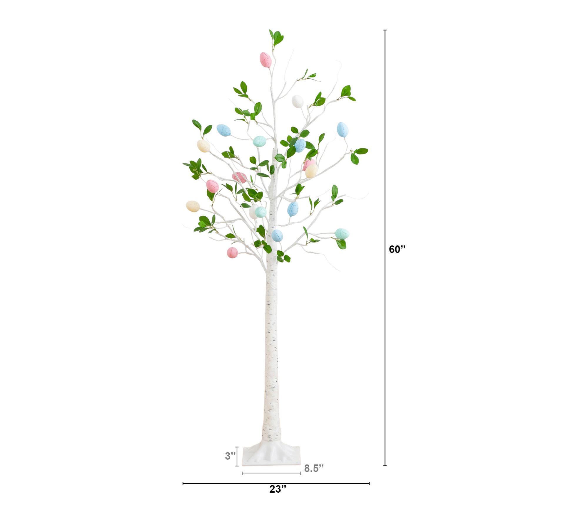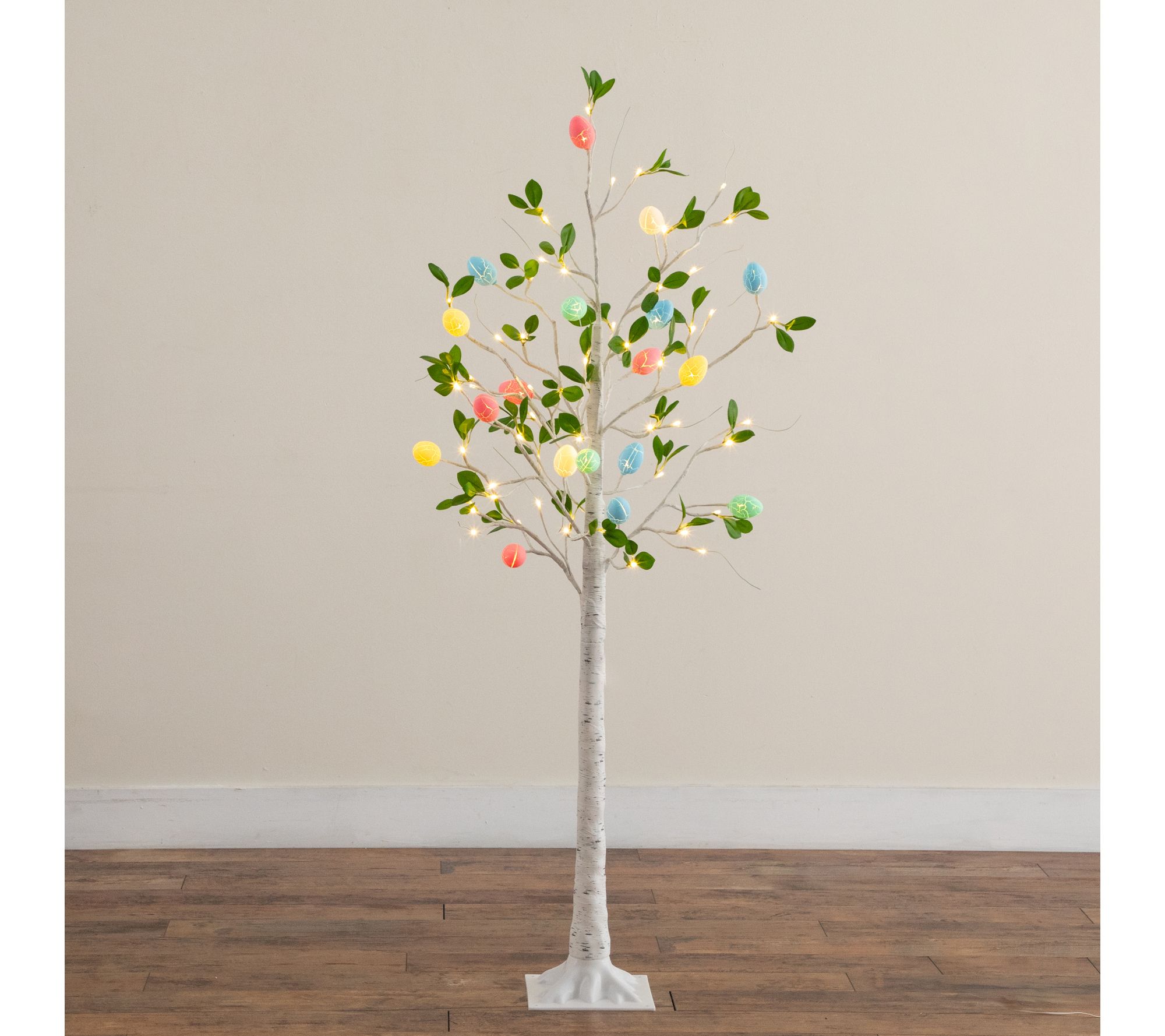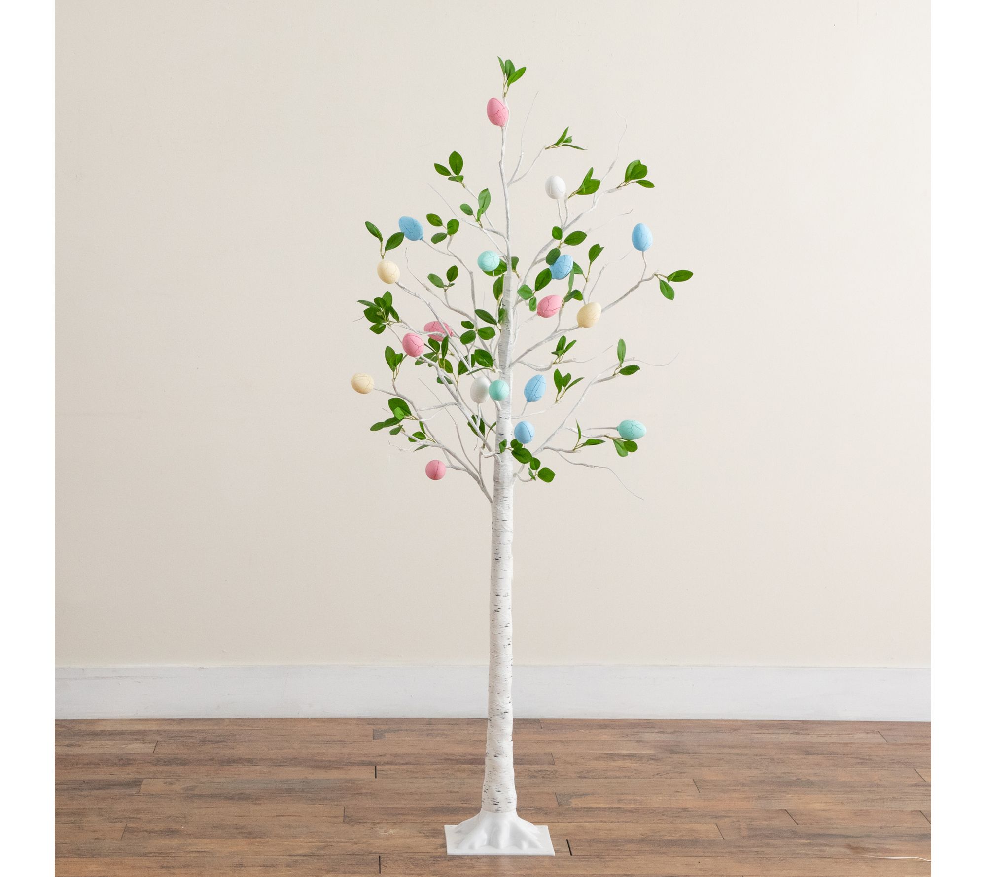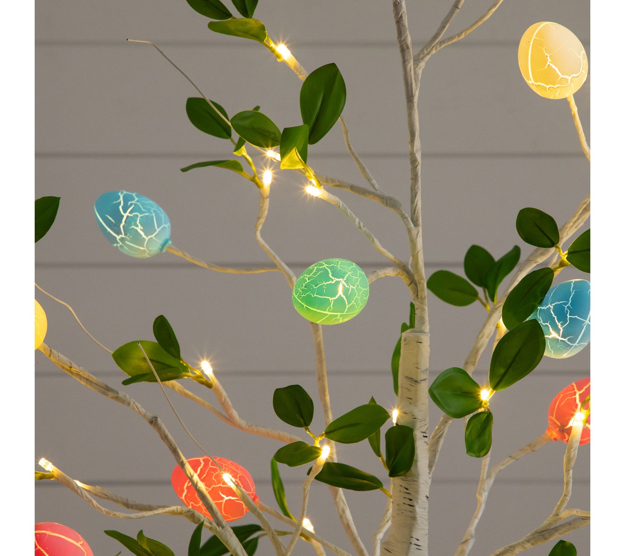 Accented with pastel, crackle finished egg-shaped LED lights and green leaves for a festive, lifelike look