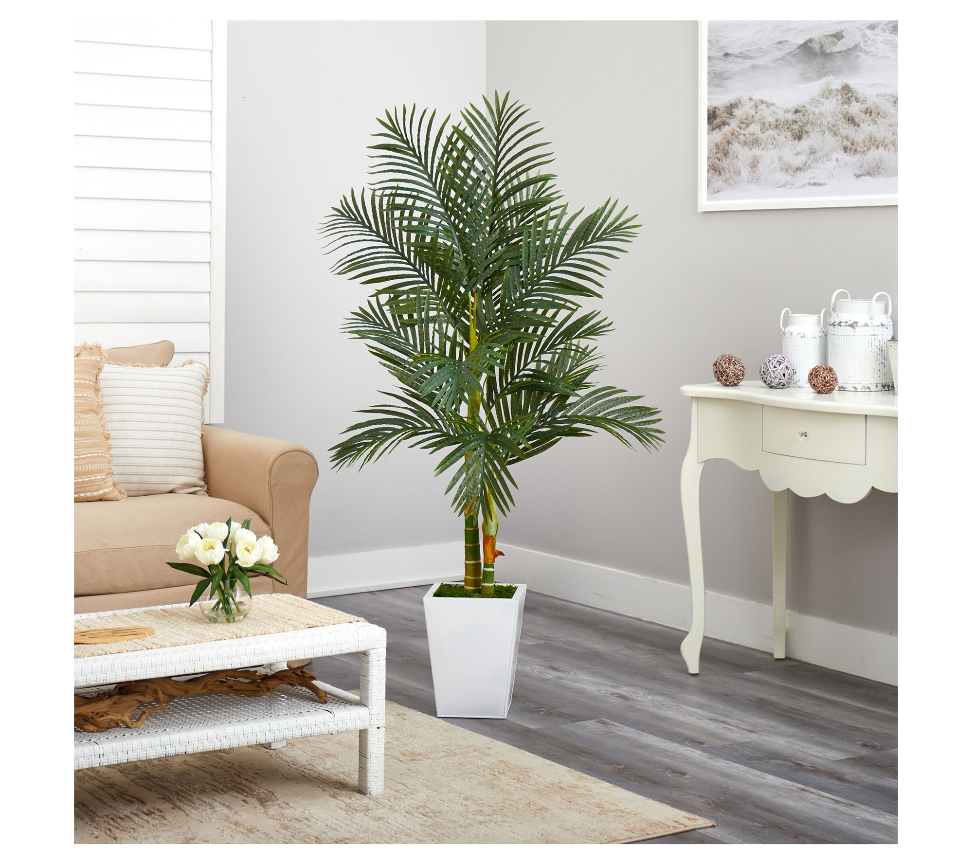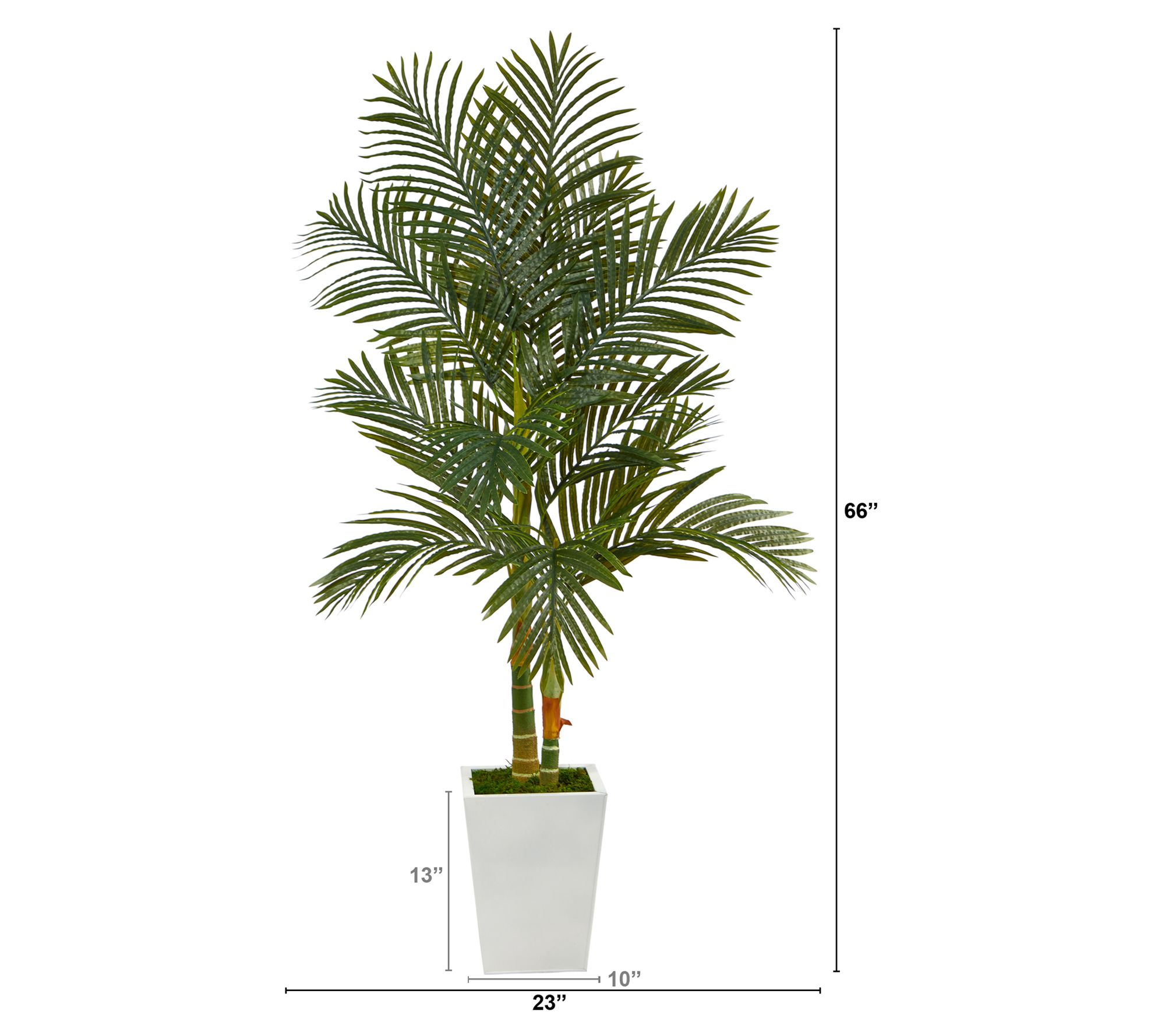• Includes lifelike golden cane artificial palm tree and white metal planter
