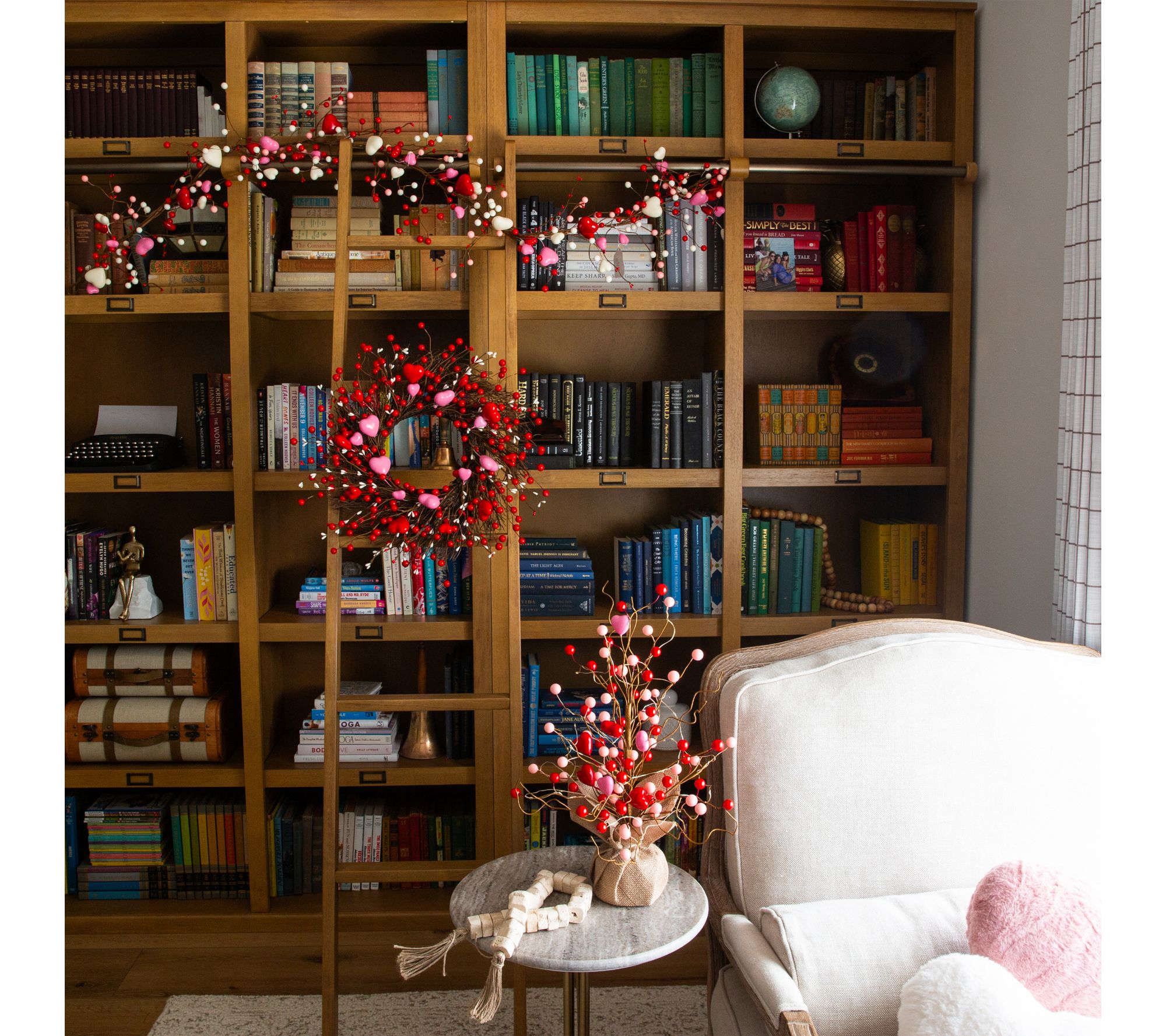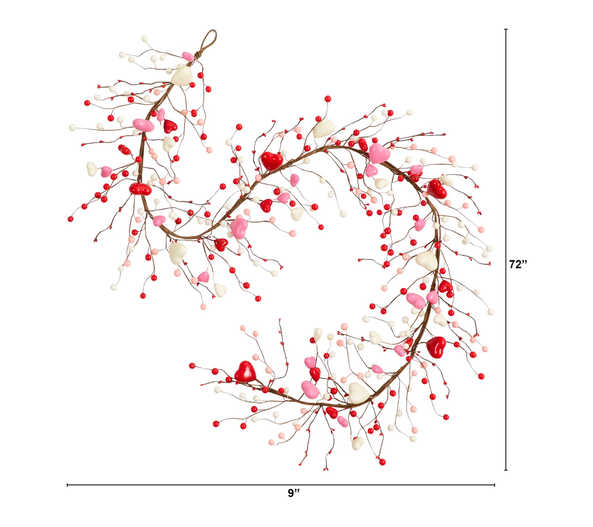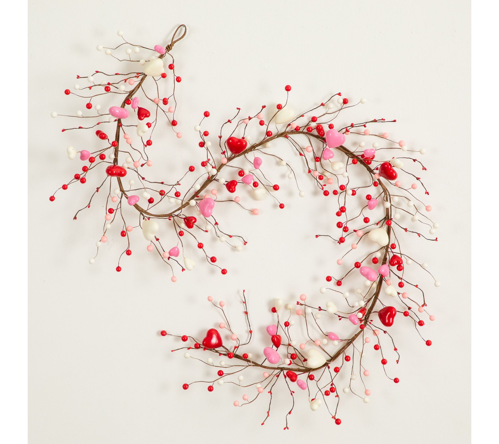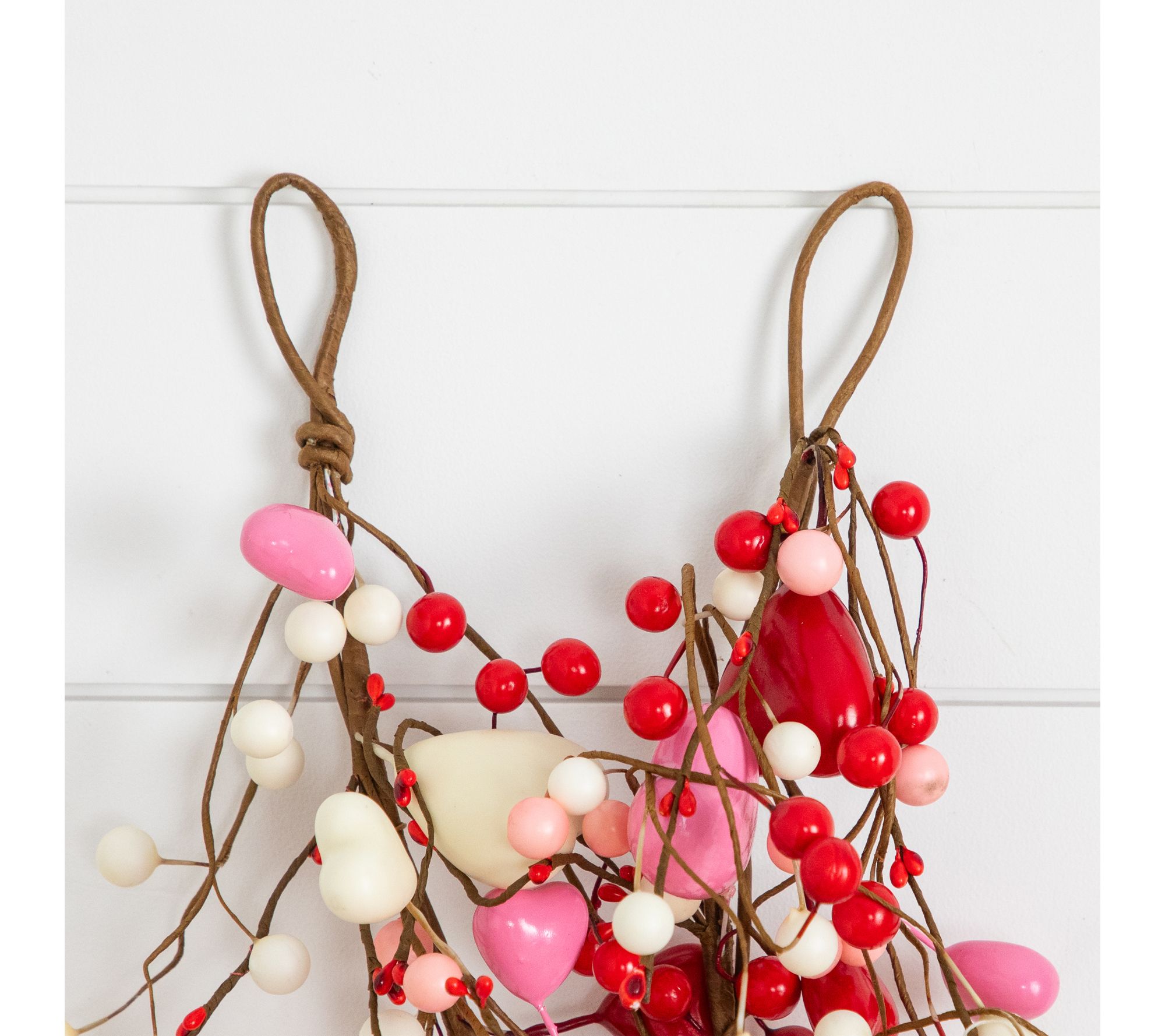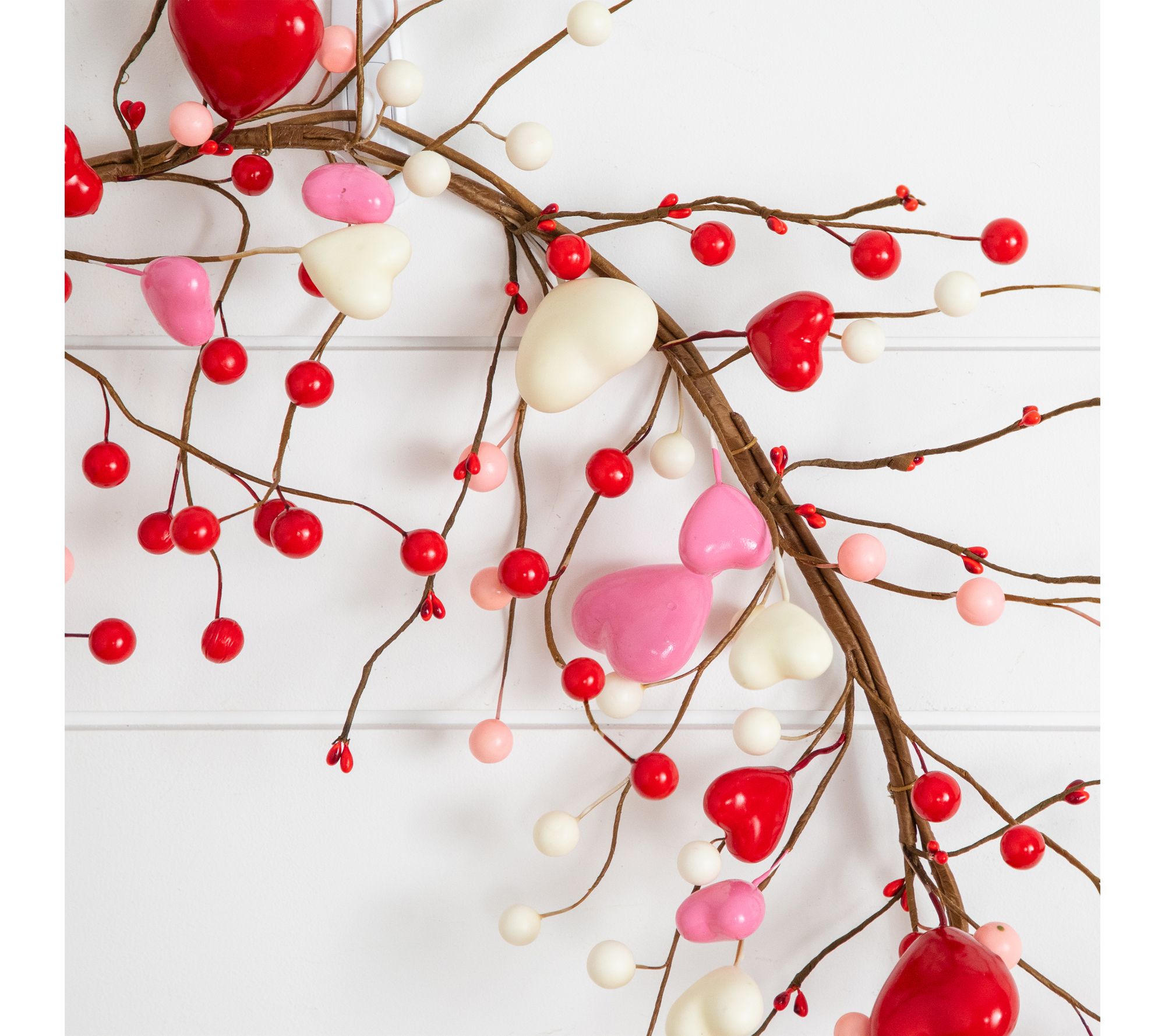 Features lifelike rattan, foam, plastic, and iron wire branches with heart ornaments in pink and red