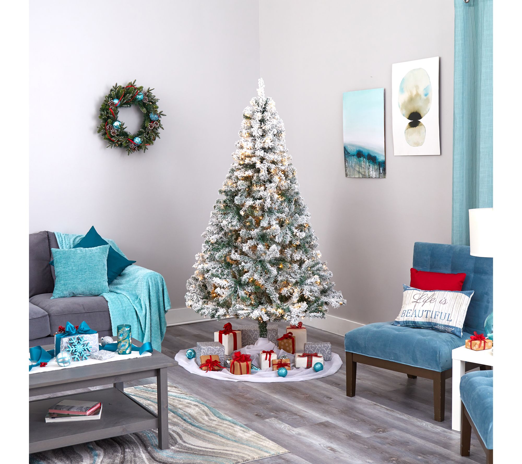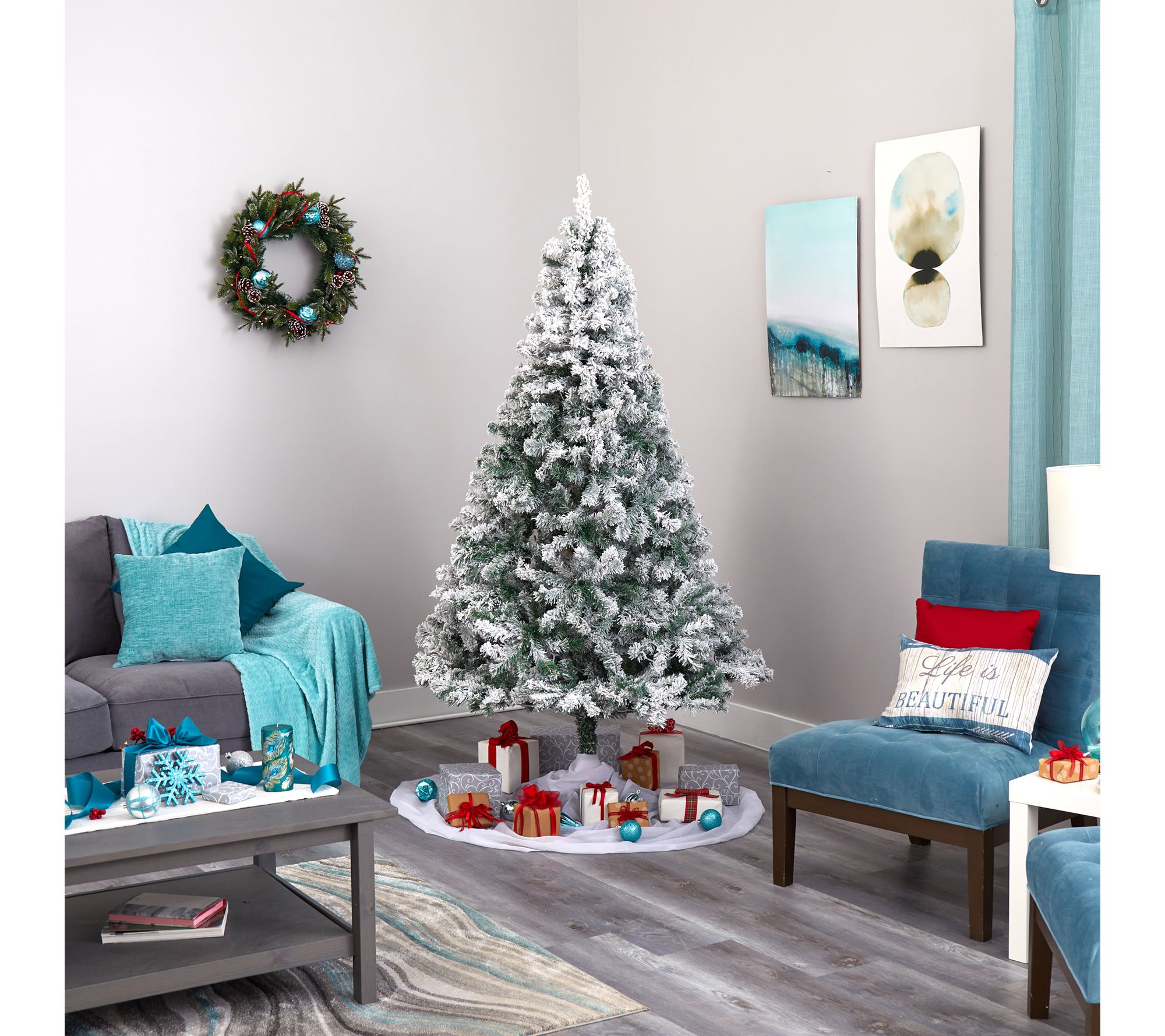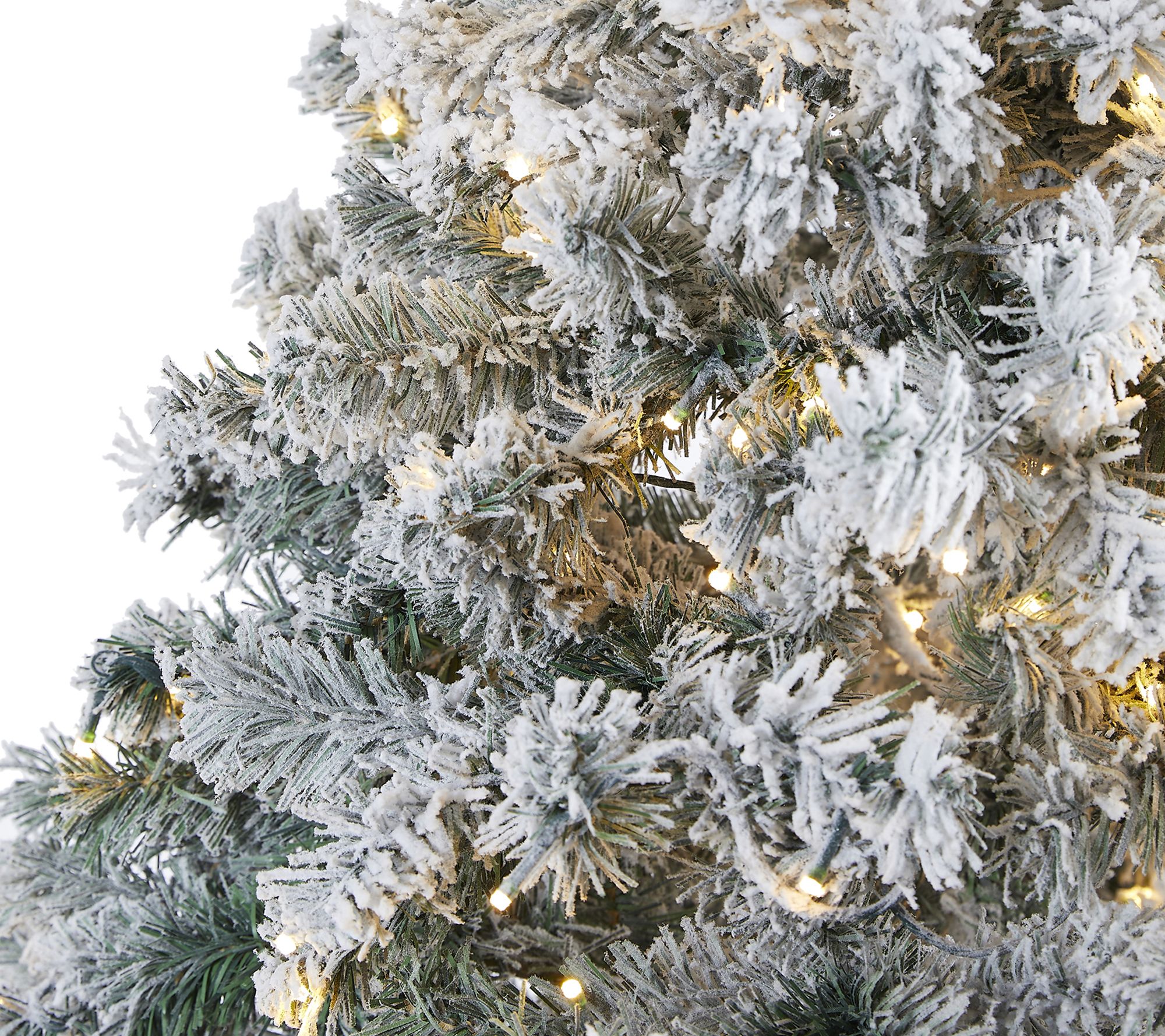 Celebrate the magic of the holidays with this flocked Rock Springs Spruce Christmas tree, pre-lit with warm white LED lights for a cozy glow. Its lifelike branches showcase your ornaments beautifully, while the frosty finish brings a snowy charm indoors. Setting up is simple, so you can focus on enjoying festive moments with family and friends. From Nearly Natural.