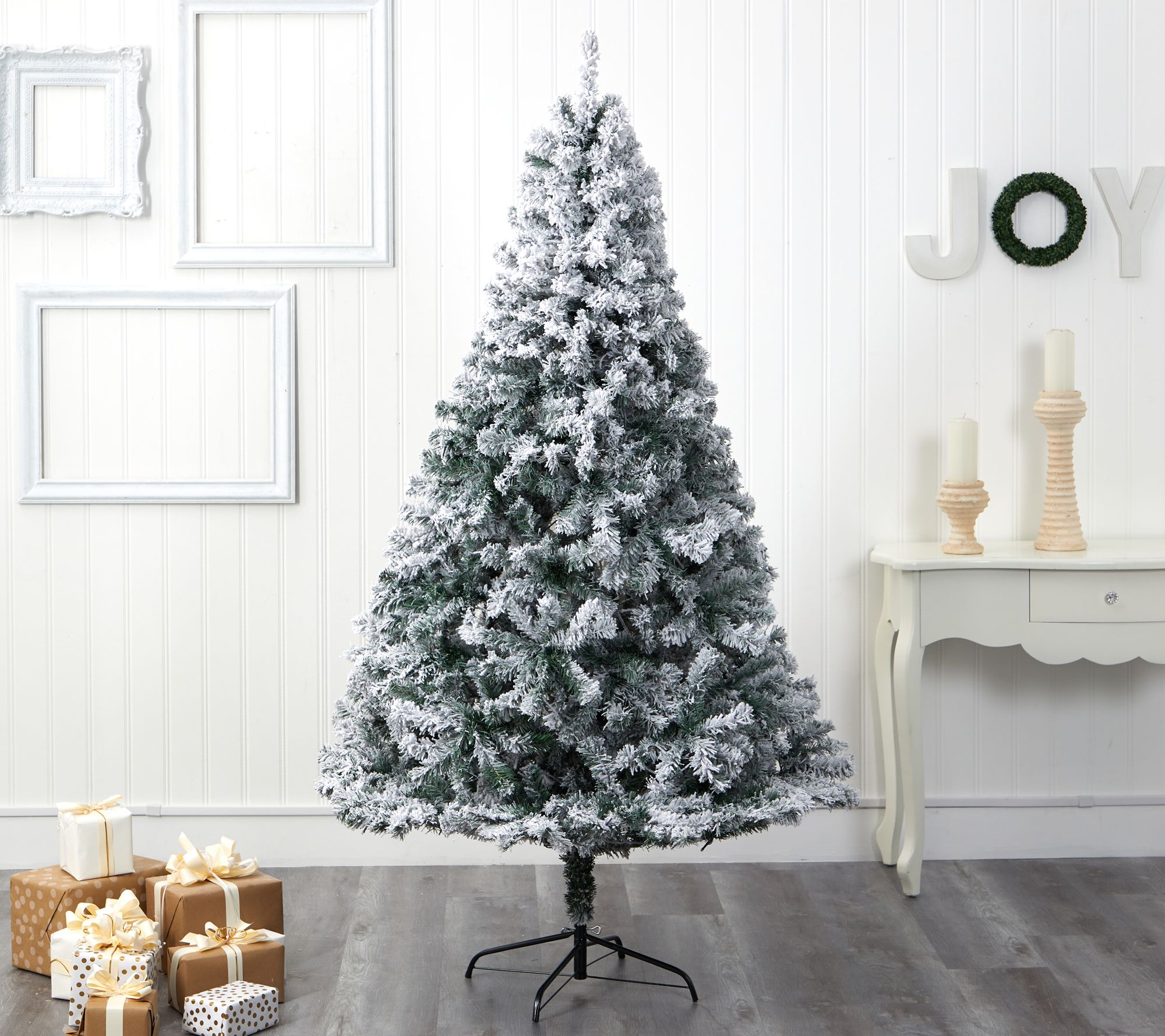 Evoke a winter wonderland this season with this flocked Rock Springs Christmas tree. Easy to set up, this winter-inspired tree boasts realistic-looking foliage with bendable branches, lightly frosted with faux snow. Transform your home or office into a joyous holiday setting for years to come. From Nearly Natural.