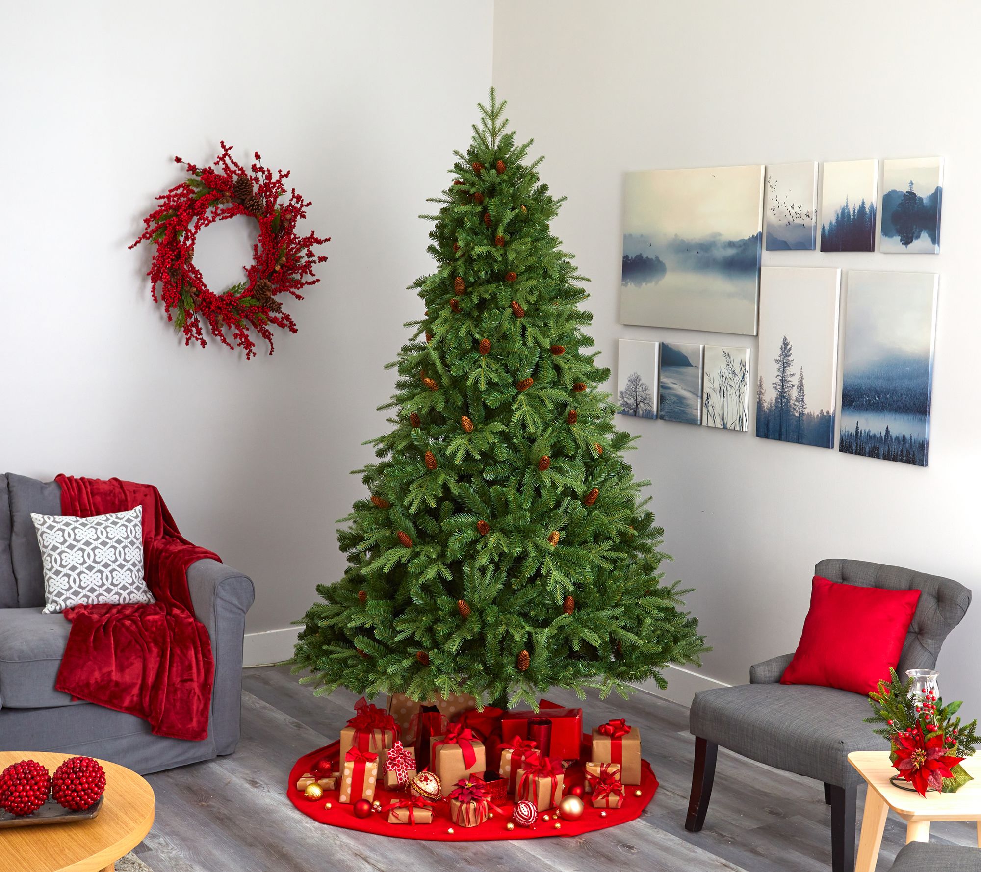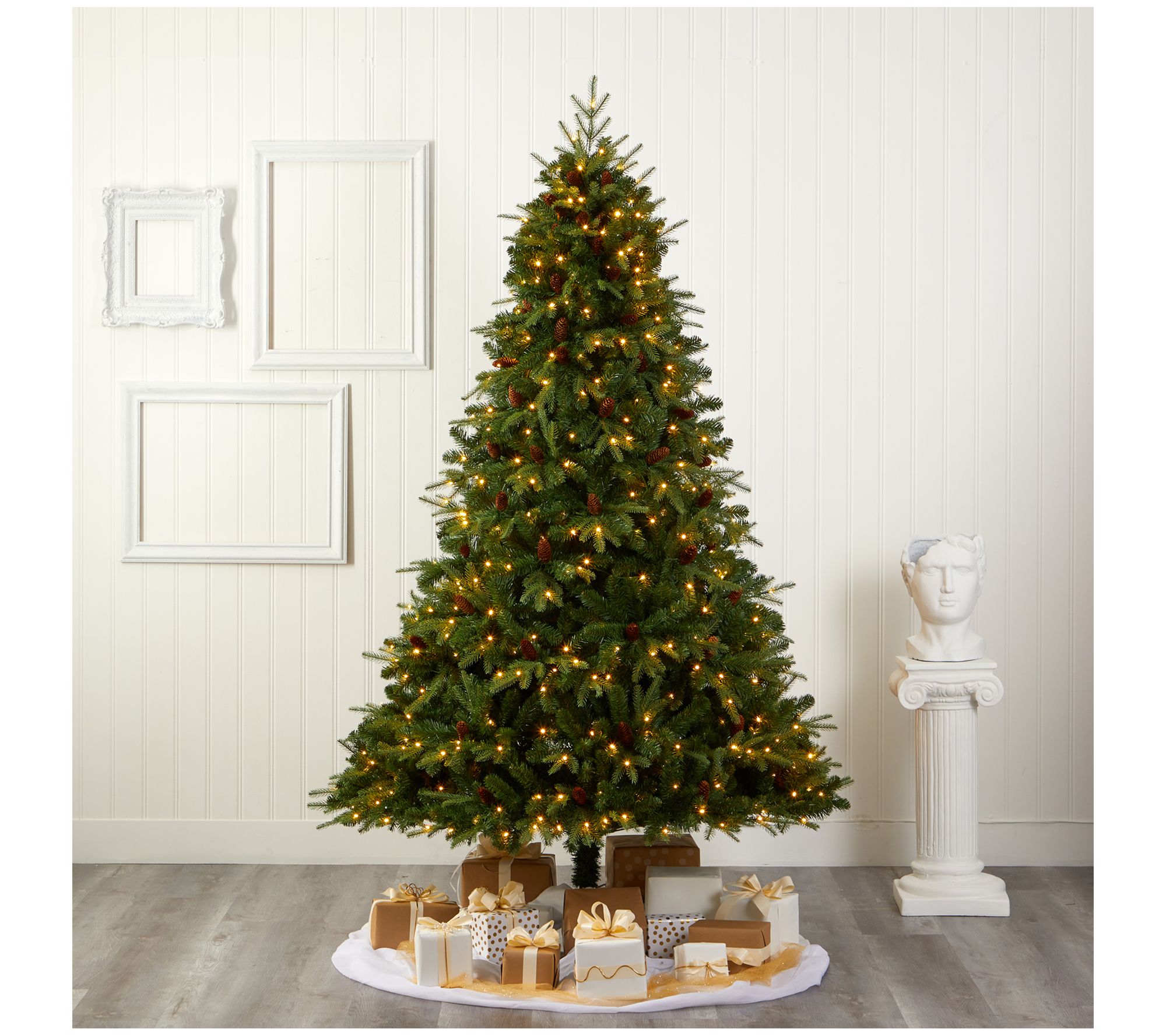 Evoke the charm of a traditional Christmas with the Nearly Natural 8' Christmas tree with lights and pinecones. This artificial tree features an all-natural look with easy-to-bend branches, perfect for showcasing your favorite ornaments. Accented with realistic faux pinecones and pre-strung with 550 clear LED lights, this tree ensures a hassle-free holiday season. From Nearly Natural.