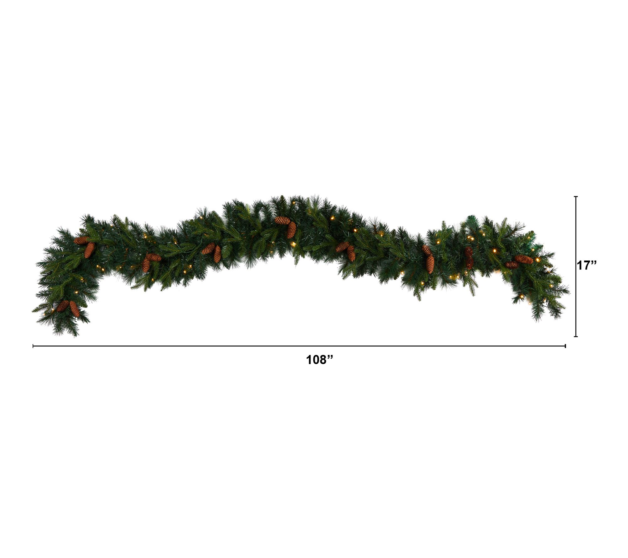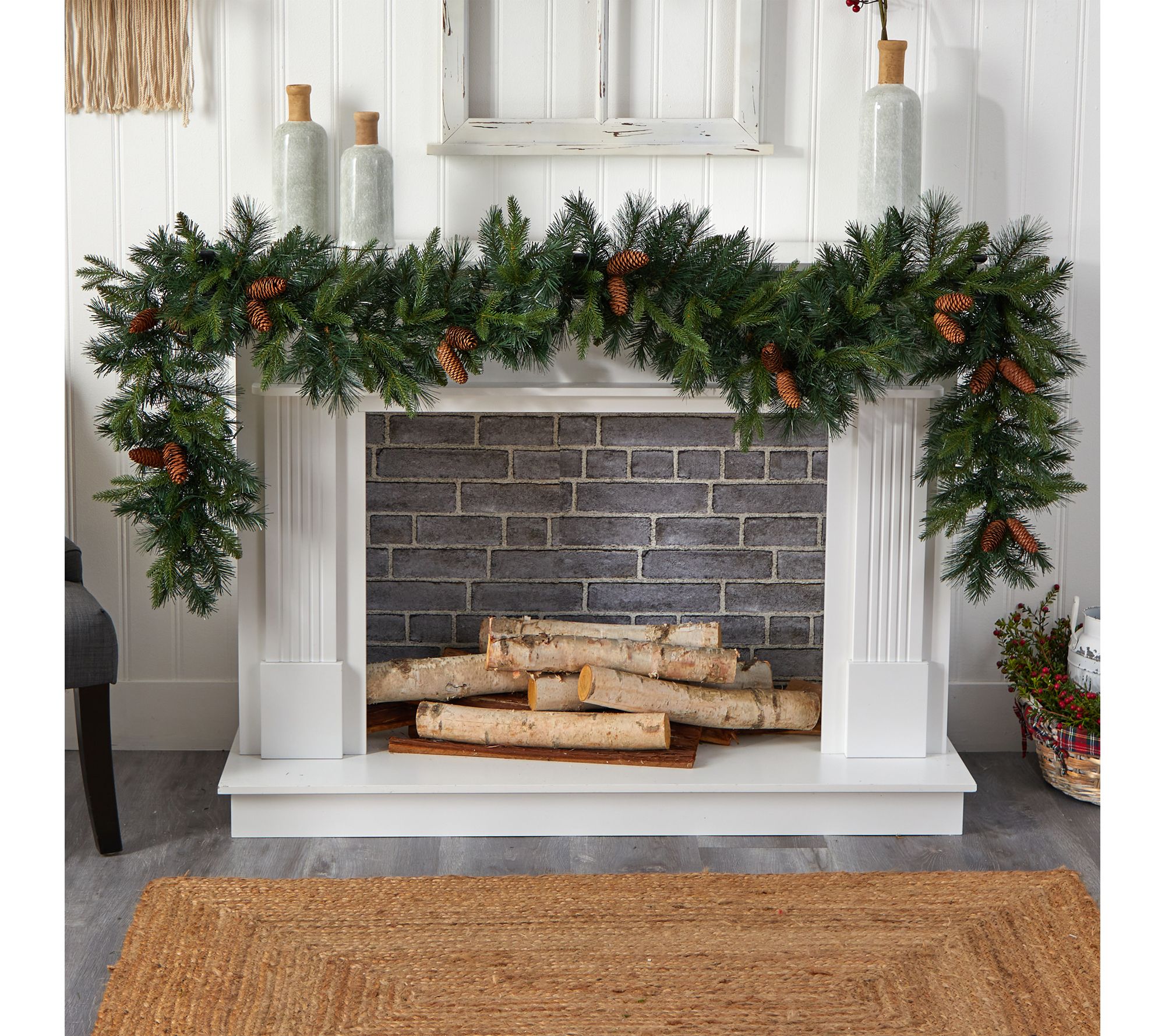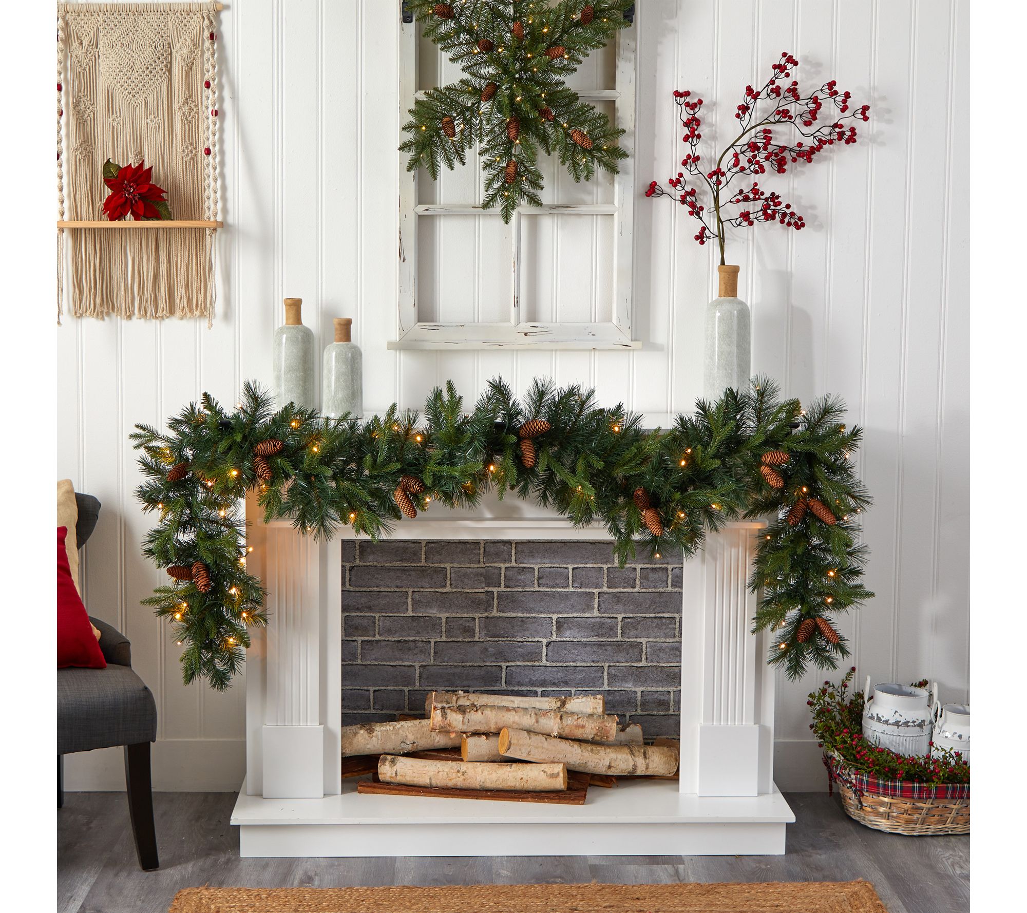 Transform your holiday home into a cozy retreat with this Mixed Pines and Pinecones Garland. Delicate evergreens and pinecones create a warm, welcoming look, while 70 warm white LED lights bring gentle illumination to a mantel, staircase, or bed frame. Easily shape the bendable branches to suit your space, making every corner feel festive. From Nearly Natural.
