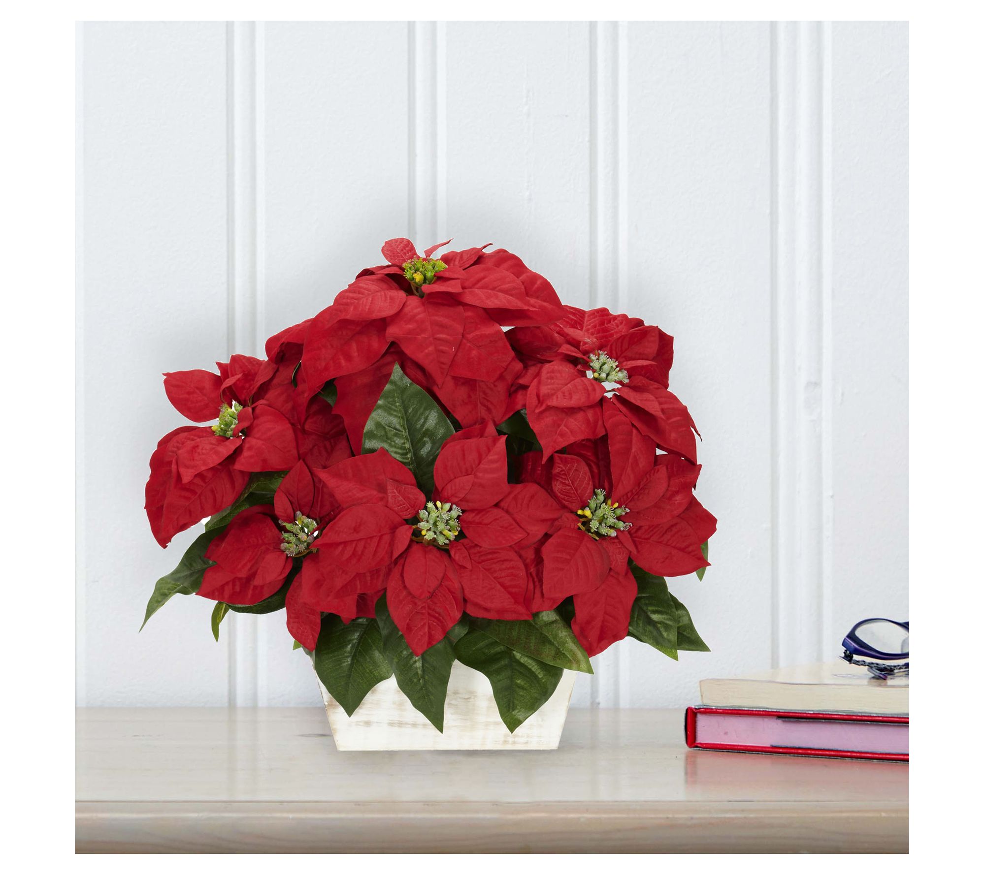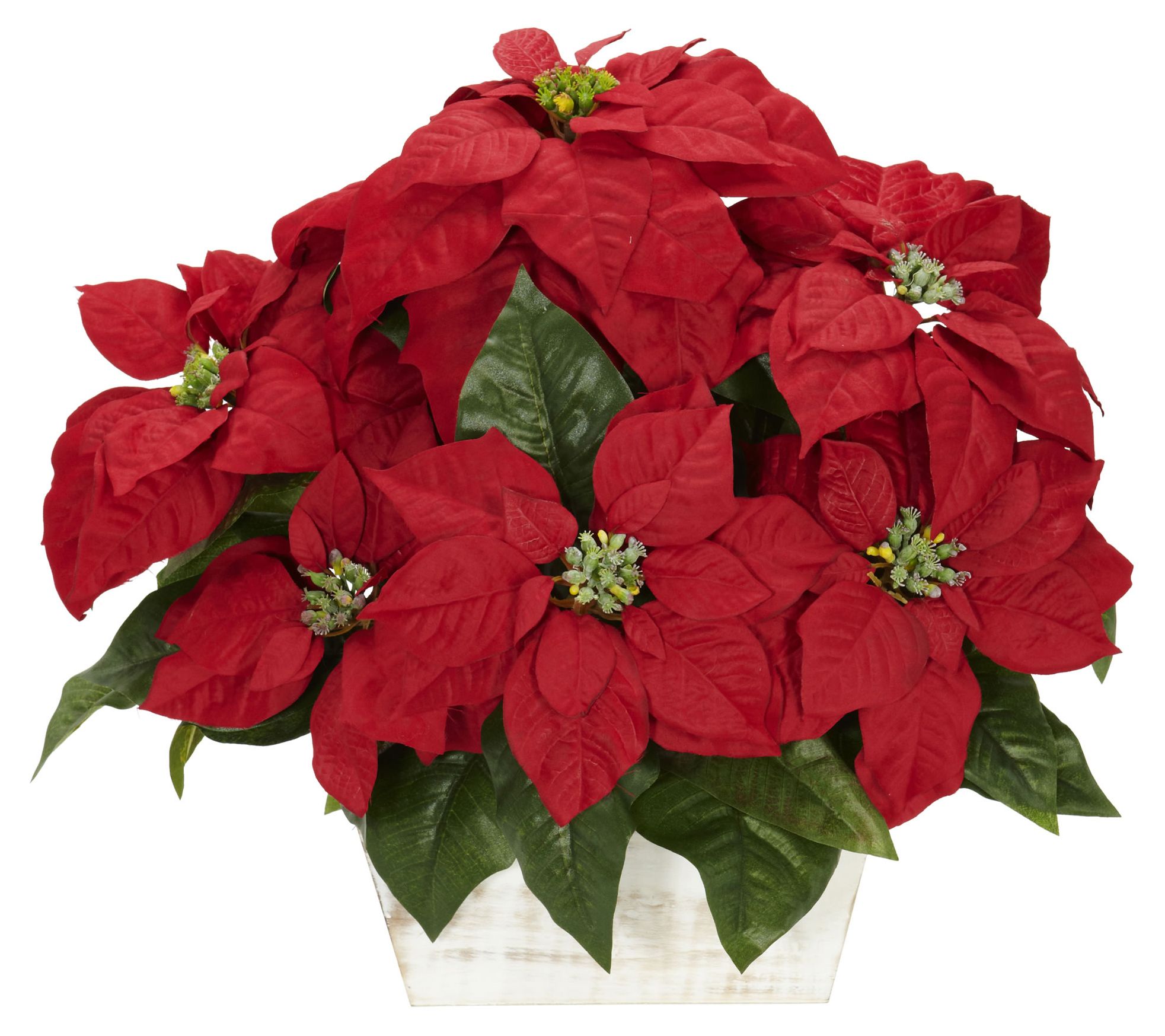 • Includes lifelike poinsettia arrangement and whitewash planter