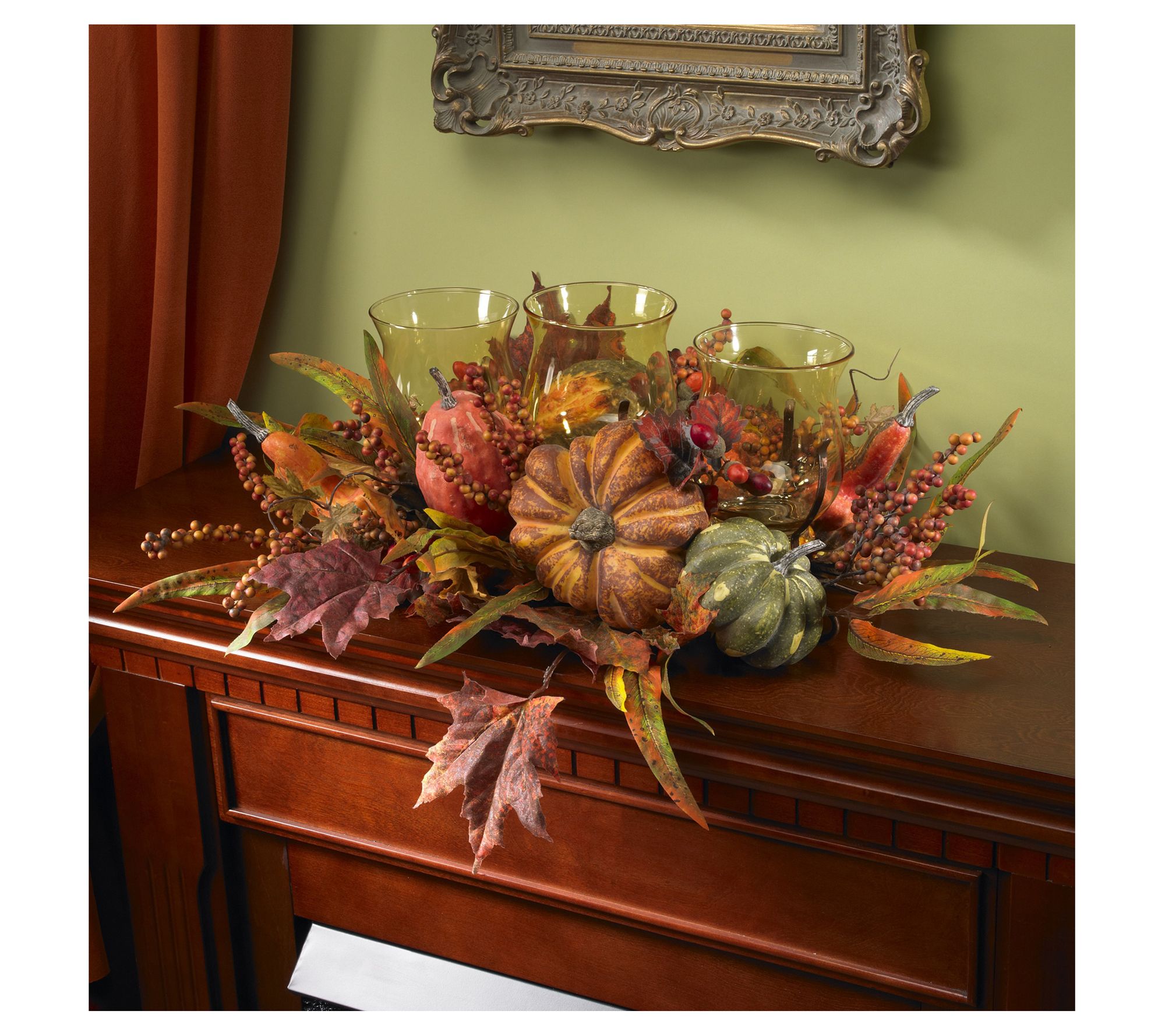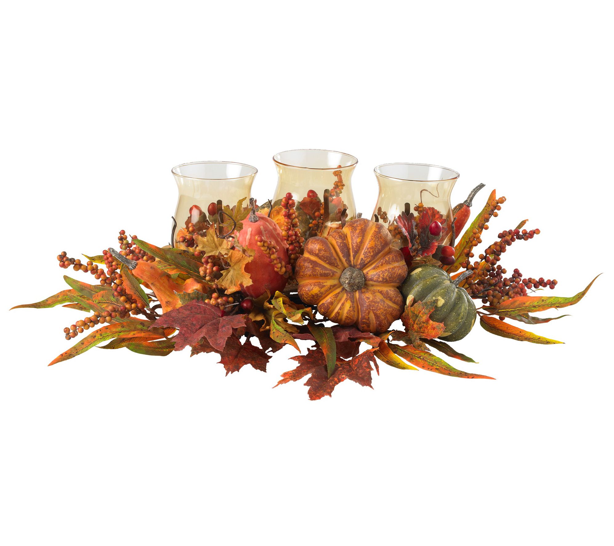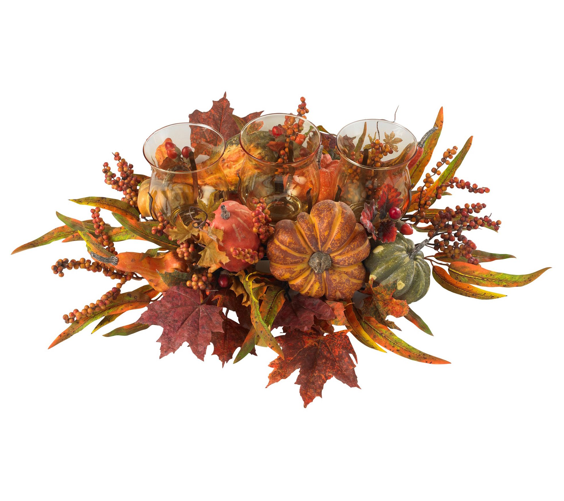 Bask in the glow of autumn with this triple candleabrum, where three candle holders nestle amid a vibrant tapestry of berries, fall leaves, and seasonal fruits. Ideal for adding a touch of festive charm to your holiday gatherings, mantels, or bookshelves, it instantly evokes the warmth of harvest season in any setting. From Nearly Natural.