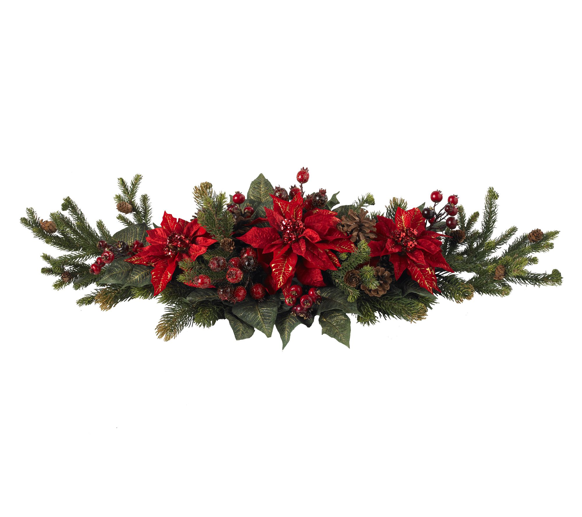 Create a memorable holiday scene with this vibrant centerpiece, boasting an explosion of reds, greens, and festive charm. Whether it graces your dinner table or brightens your mantel, its lifelike arrangement of poinsettias, pine needles, berries, and pinecones will instantly capture the spirit of the season. From Nearly Natural.