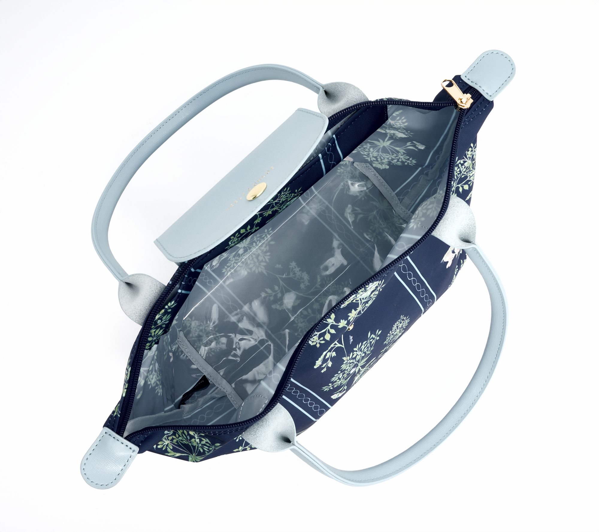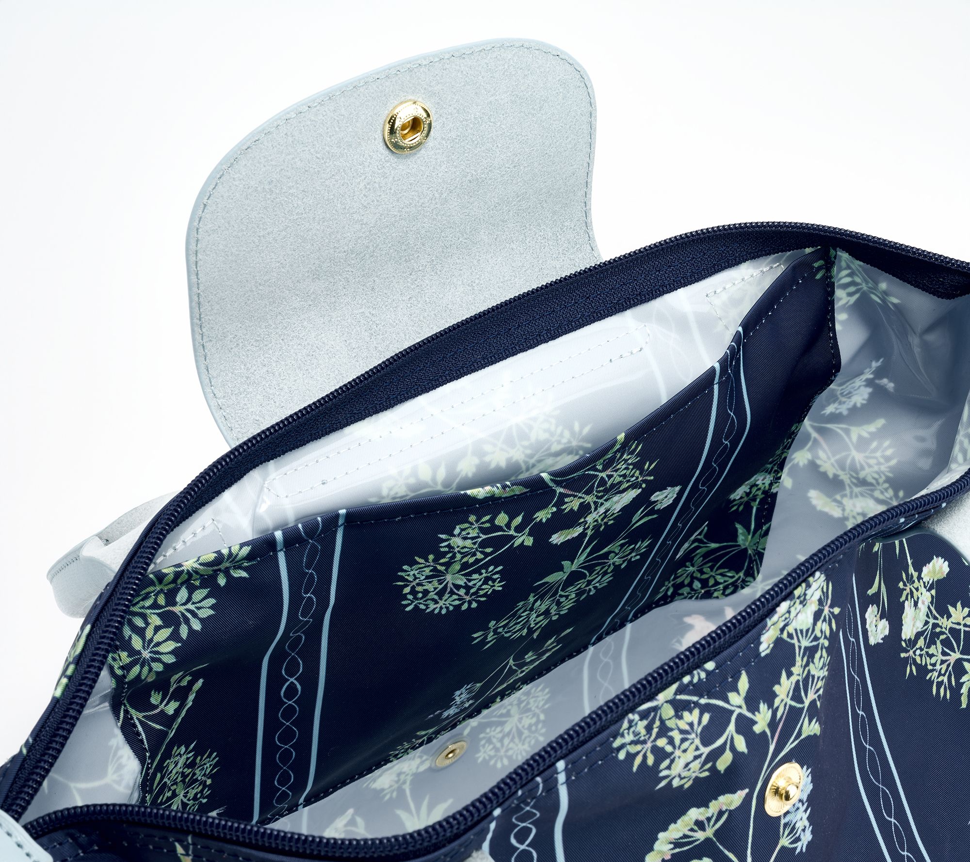 Double handles, metal snap closure, plastic zipper with metal pull