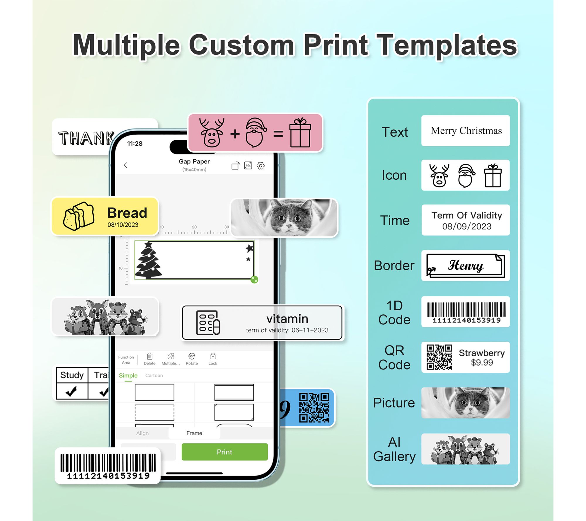 • Prints text, QR code, barcode, materials, images, time, and borders