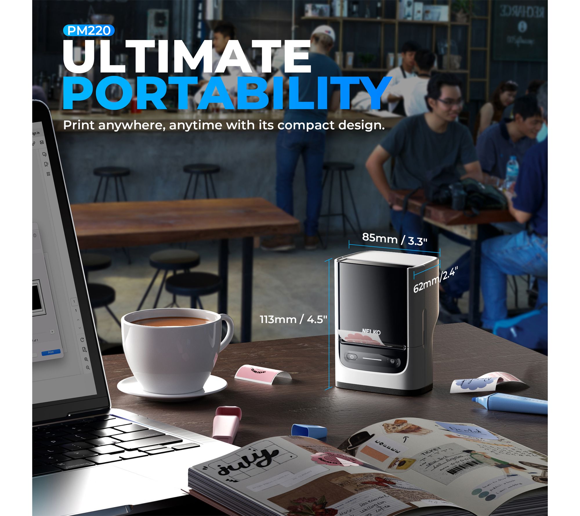 Includes Nelko PM220 Bluetooth Label Printer, one built-in label roll, one extra label roll, manual, and charger