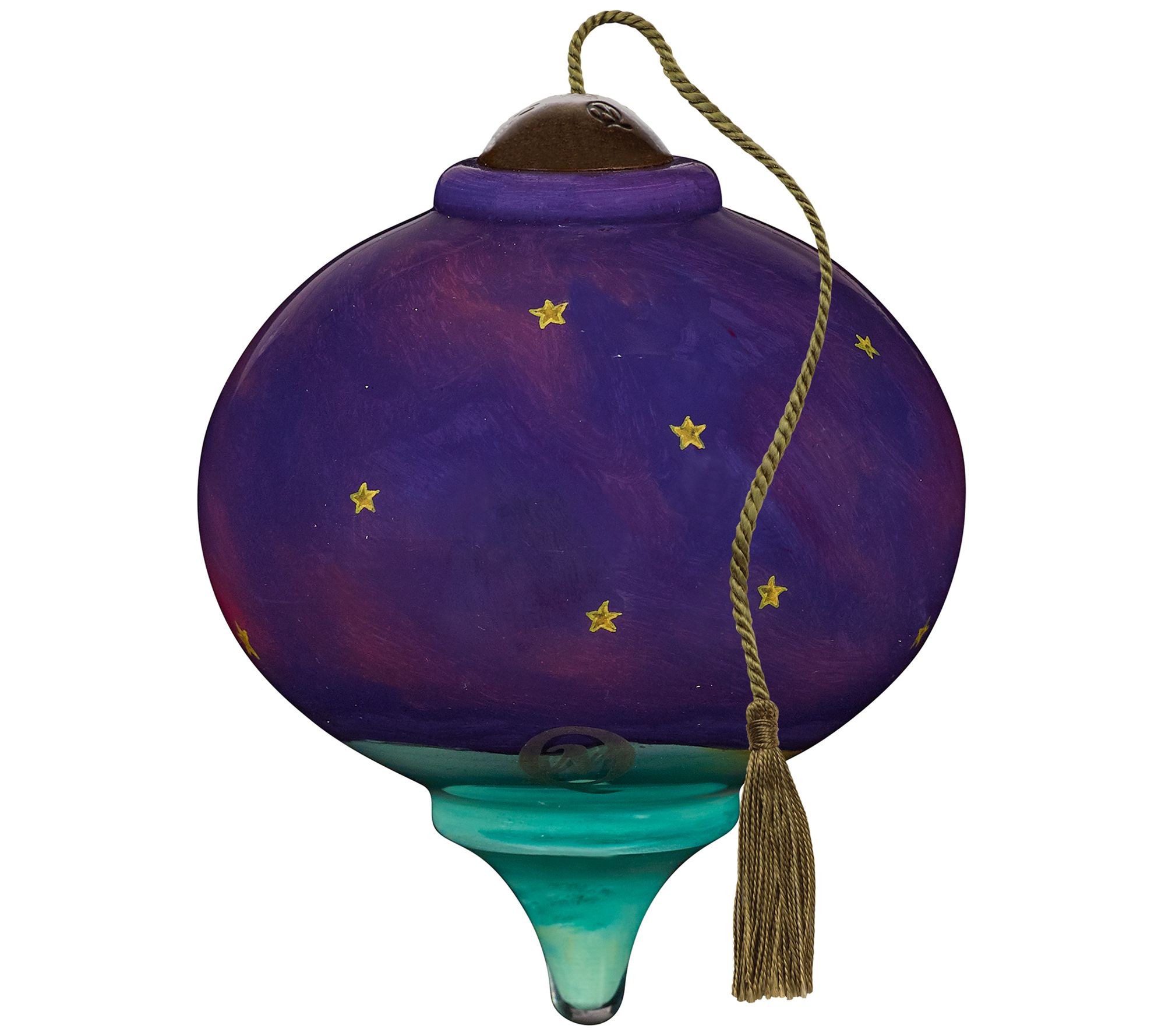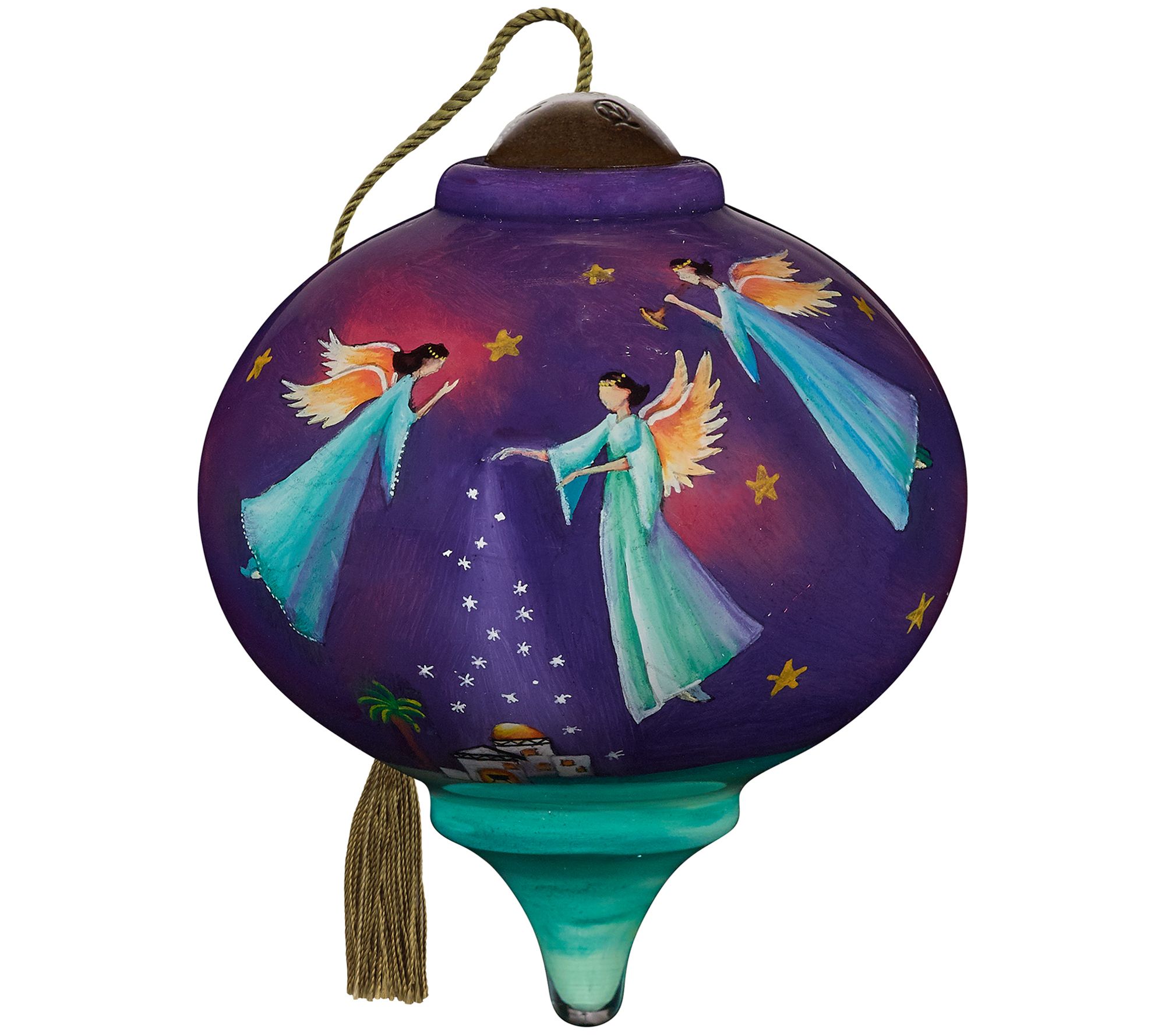 Give your tree display a celestial upgrade with this elegant marquise ornament depicting angels playing a trumpet and sprinkling stars in a brilliant teal and purple palette. From Ne'Qwa.