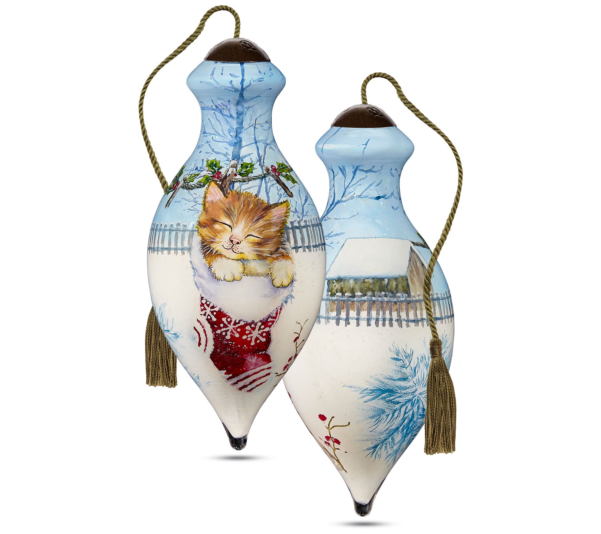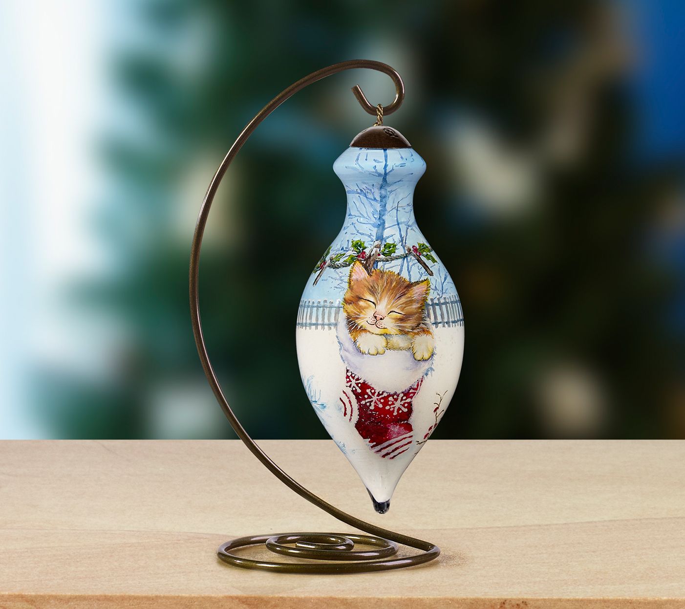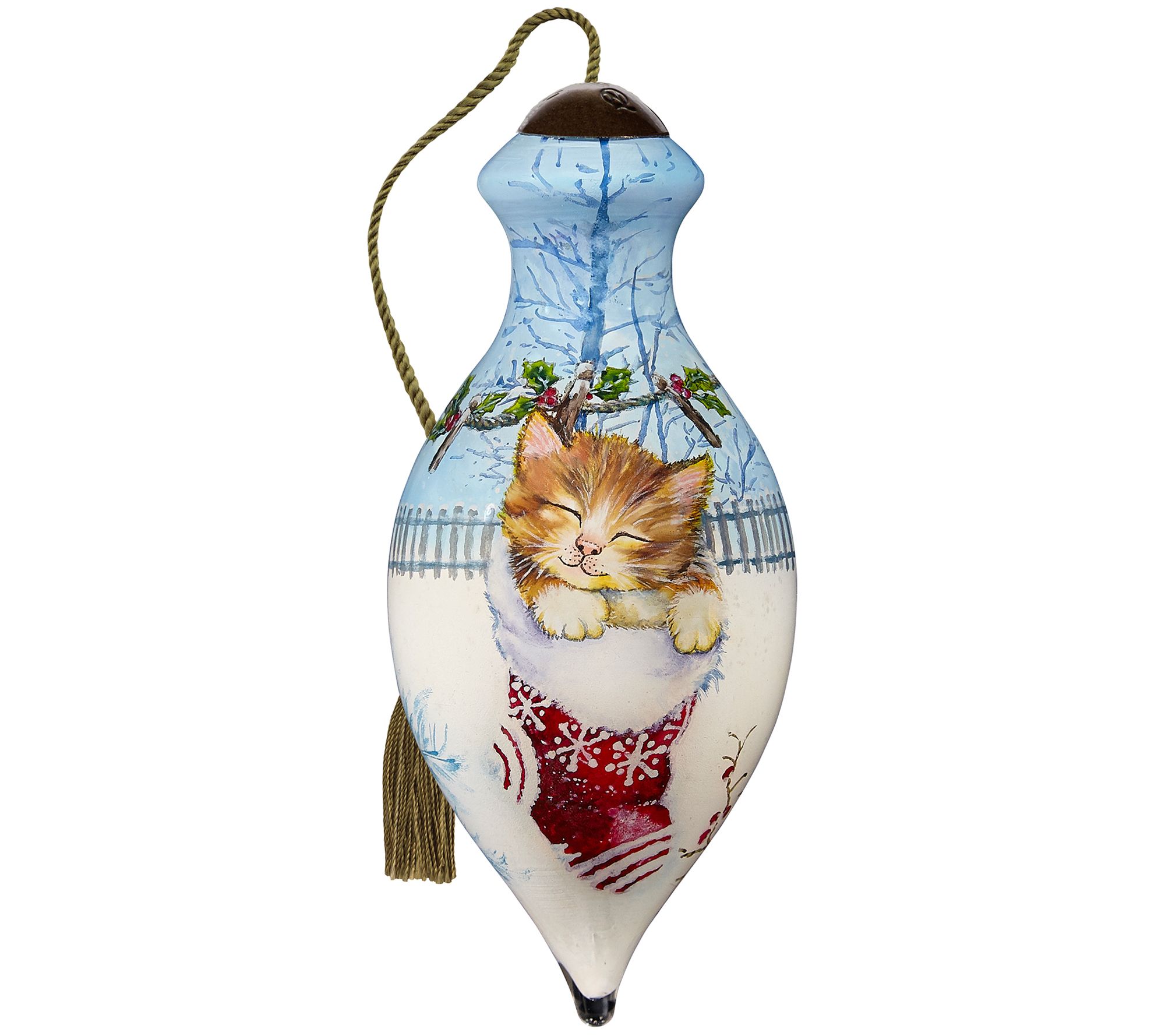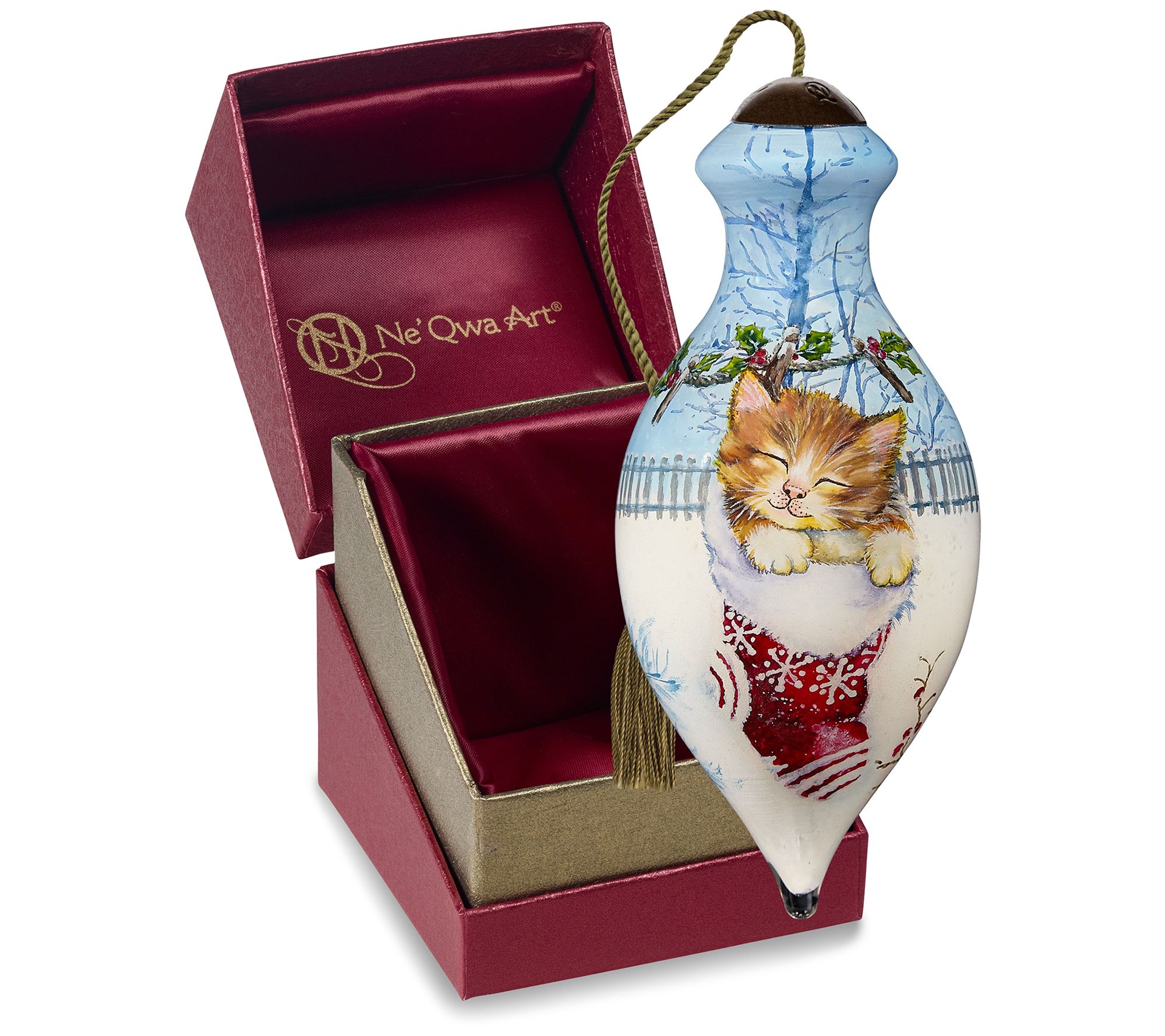 With a pretty Christmas kitty peeking out of a stocking, this cheerful hand-painted ornament from Ne'Qwa adds a special touch to the wonder of the season. Gift it to family and friends, or use it an unexpected addition to your table setting or gift bag trim. From Ne'Qwa.