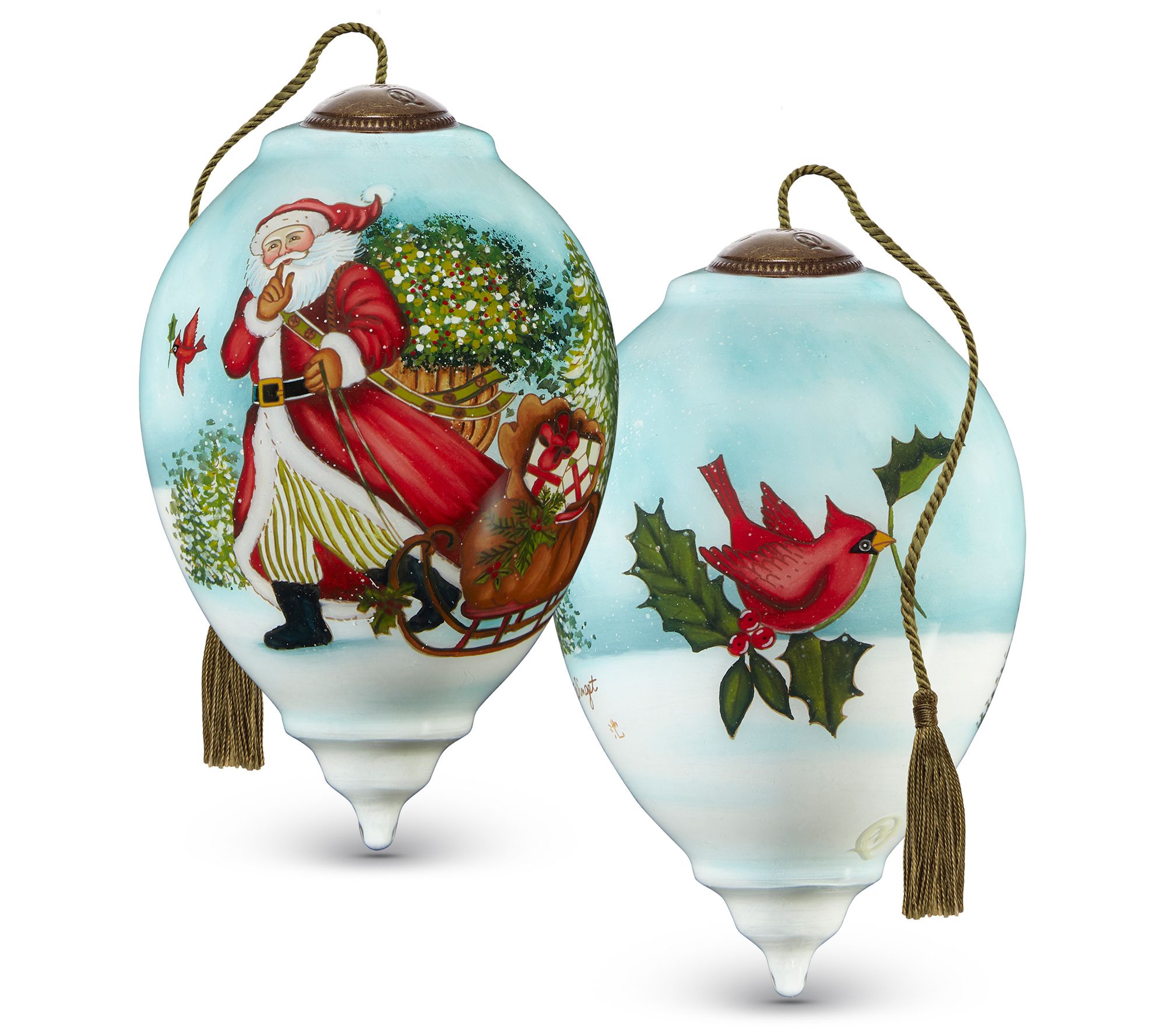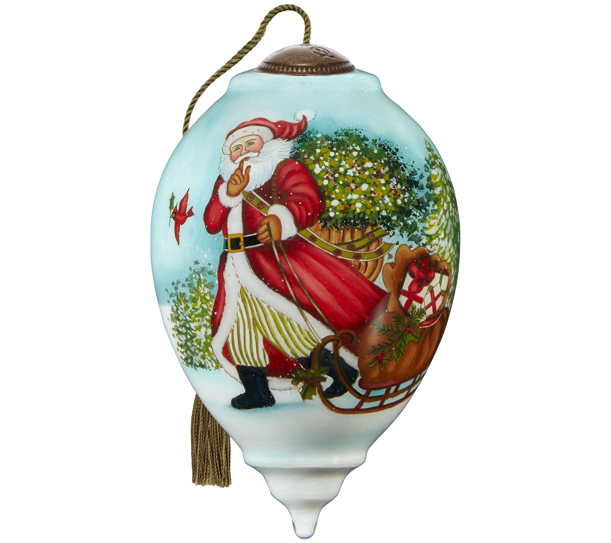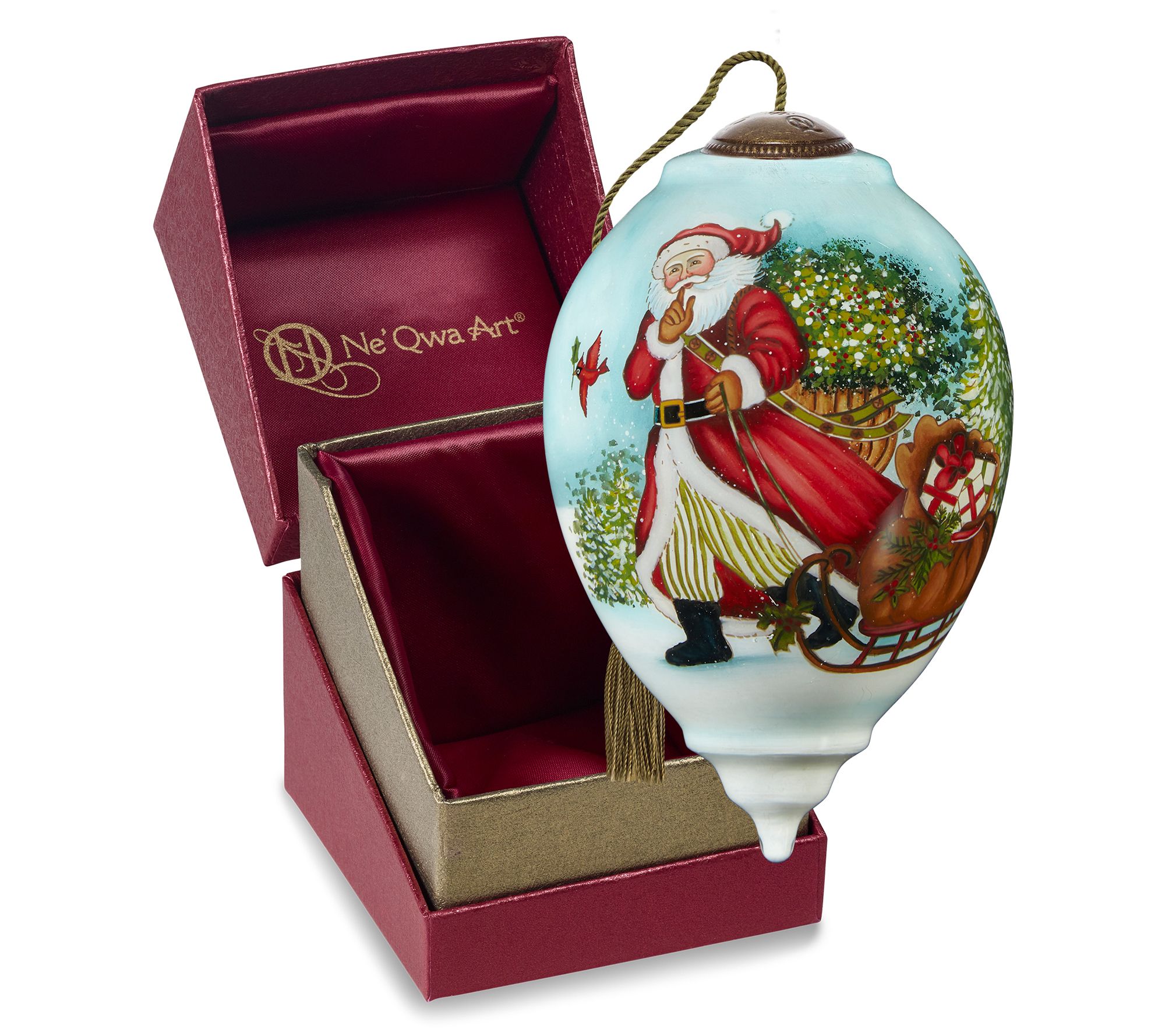Decorate your tree with this luxe glass ornament featuring everyone's favorite gift-giver. From ne'Qwa.