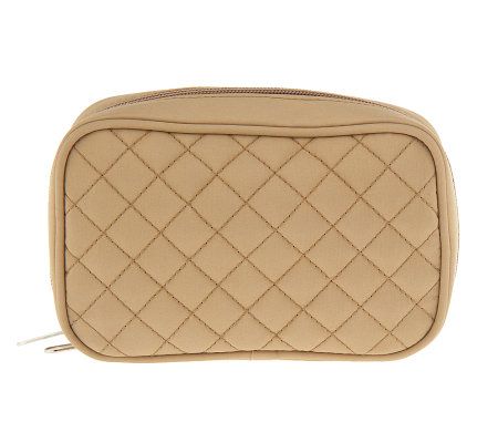 The quilted cosmetic case boasts a roomy center compartment with a deep gusset to hold makeup galore. Two pouches on each interior side wall help keep things orderly. The medium-sized organizer has six outer pockets to accommodate sunglasses, tissues--whatever you need on the go. One of these pockets is generous enough for a large wallet, or can be snapped to make two smaller pockets. The large-sized organizer provides seven additional pockets.