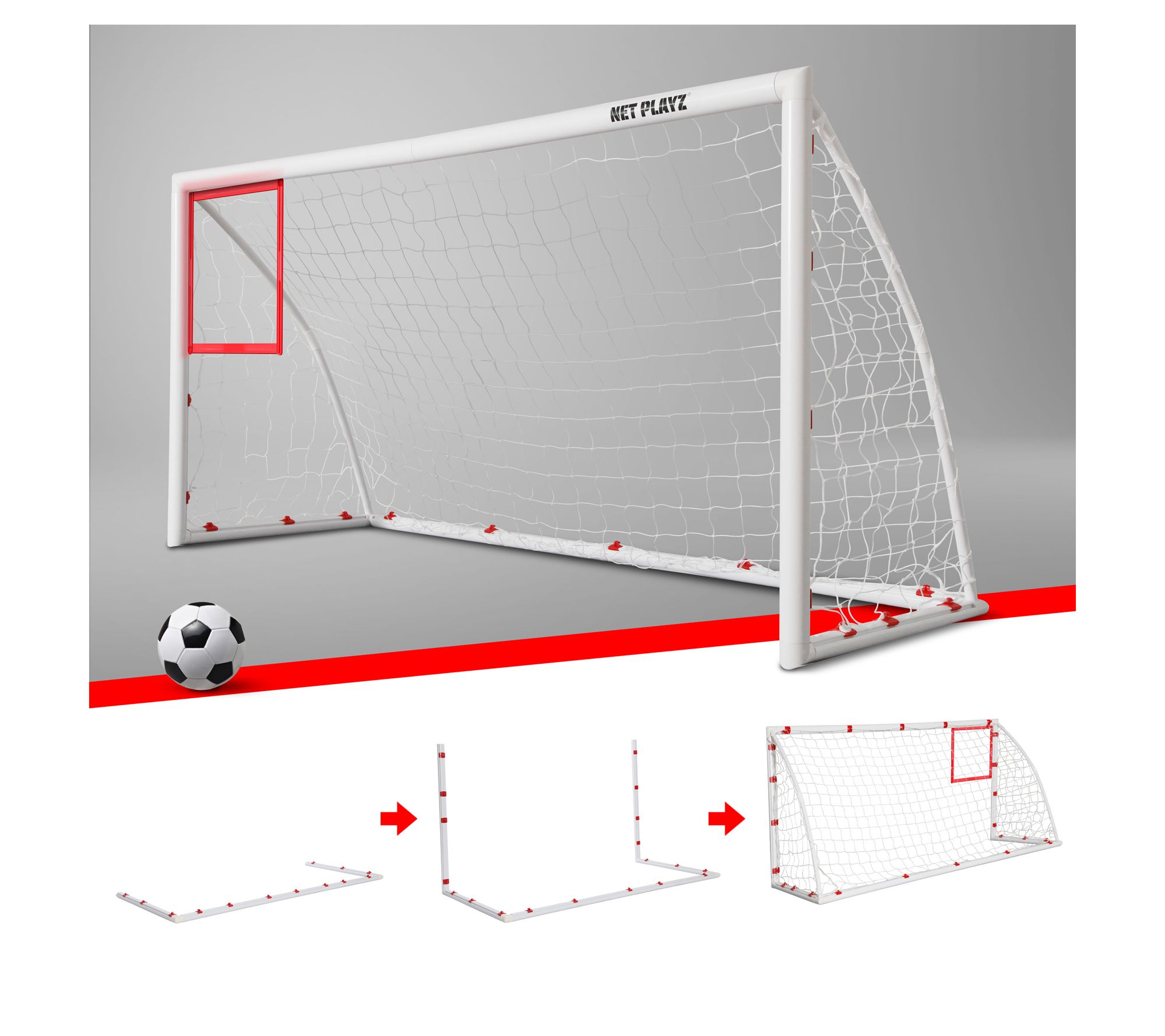 Transform your backyard into a training ground with this versatile soccer goal set. Its robust 3D PVC frame stands up to the most powerful shots, promising unmatched stability for countless games. Within just 10 minutes, assemble the structure effortlessly, then get ready for action thanks to the quick-clips net system and adjustable corner targets that allow for dynamic practice sessions. Perfect for aspiring athletes or family fun, this goal set provides the ultimate setup for honing skills and enjoying the game. From Net Playz.