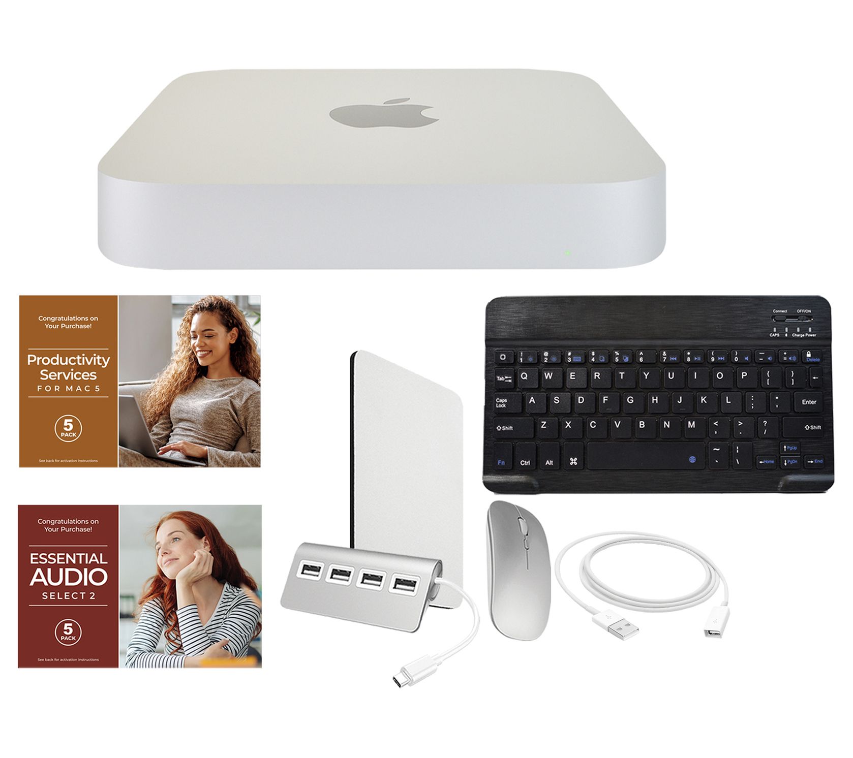 • Includes 2023 Mac mini with power cord; wireless mouse, mouse pad, Bluetooth keyboard, four-port USB-C hub, USB extension cable, and voucher; monitor not included