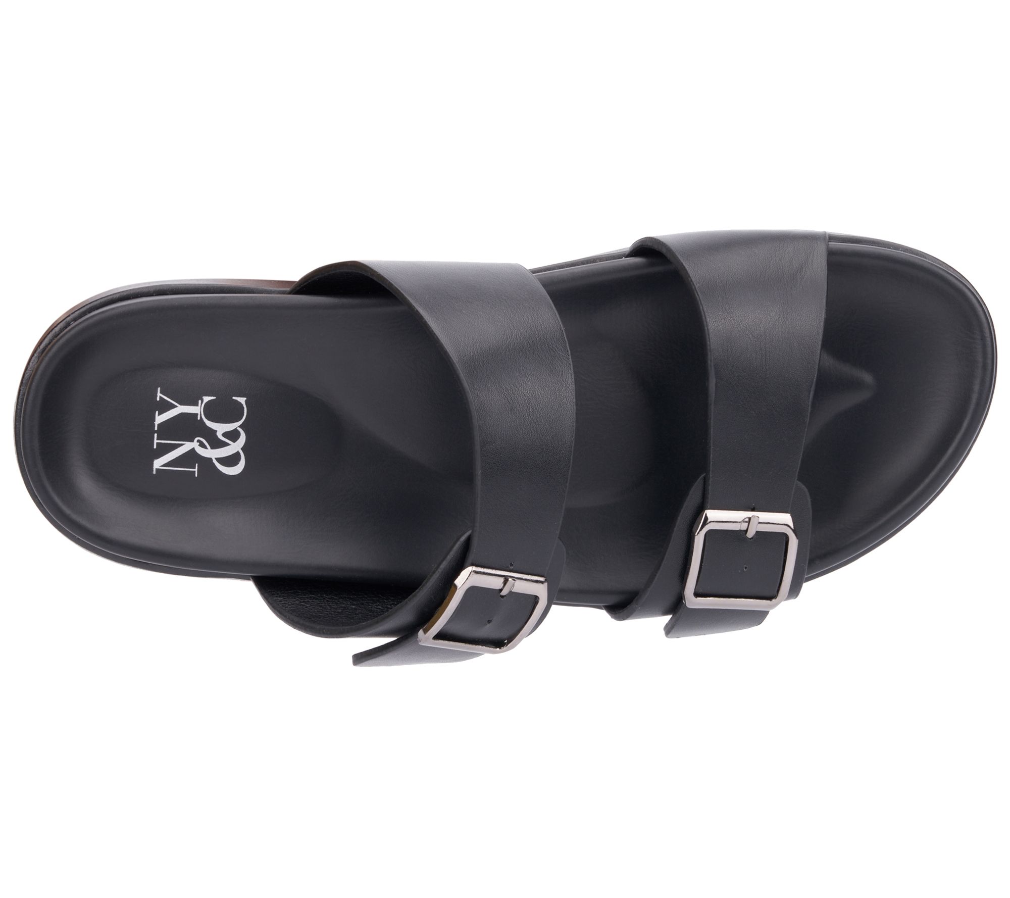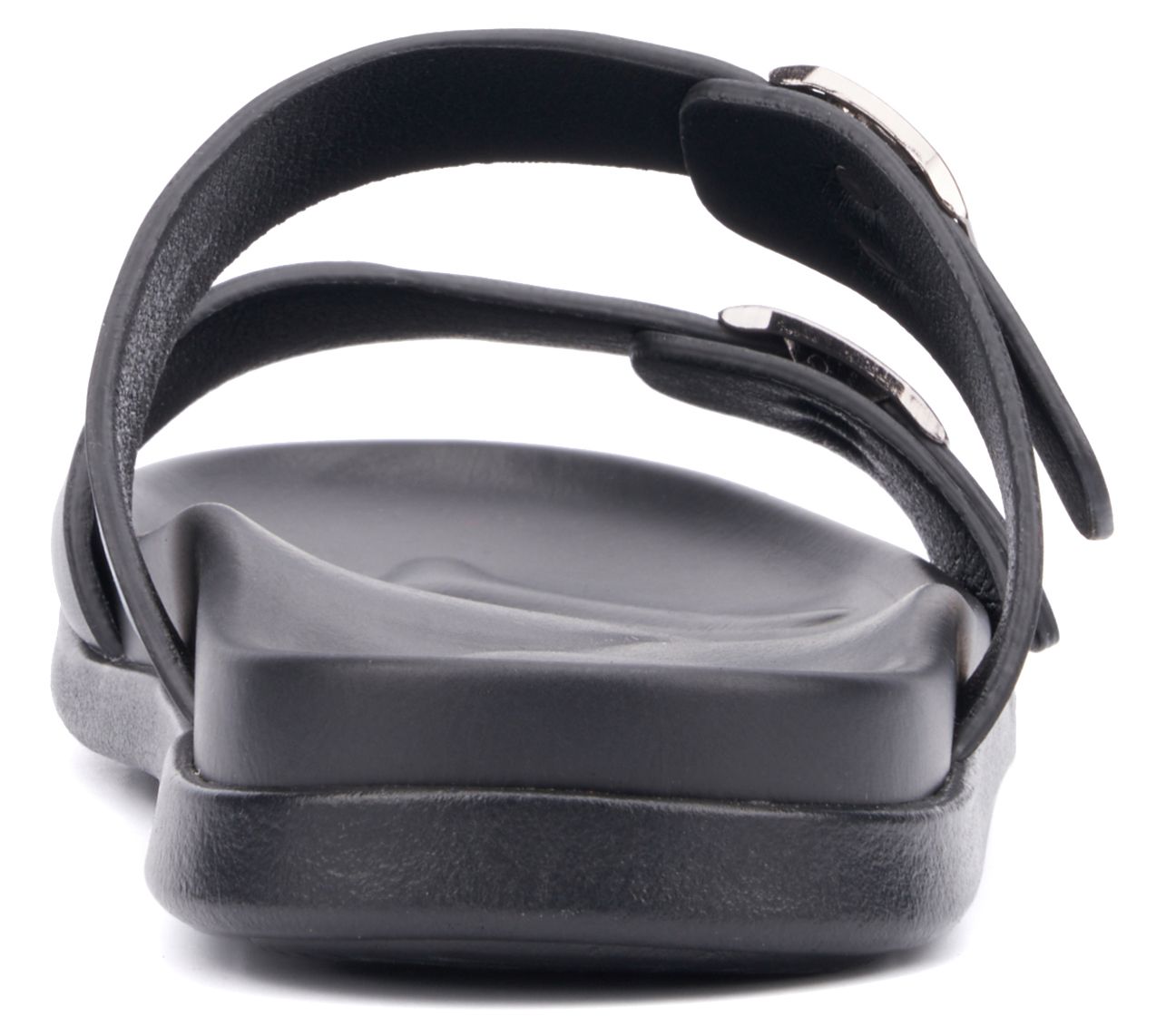 Slip-on style, double buckle straps, padded footbed, rounded toe