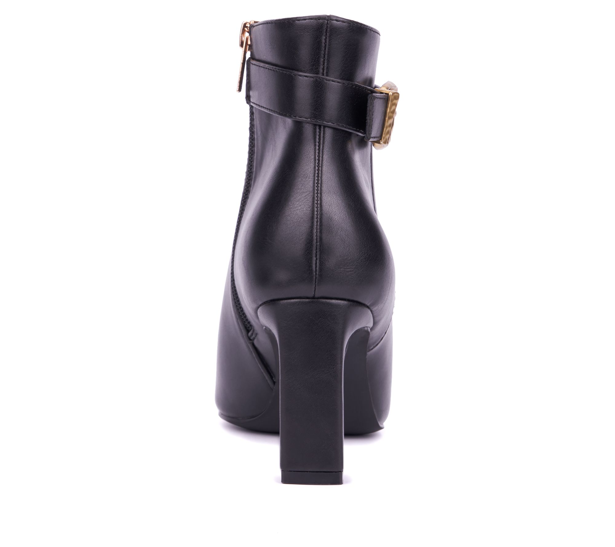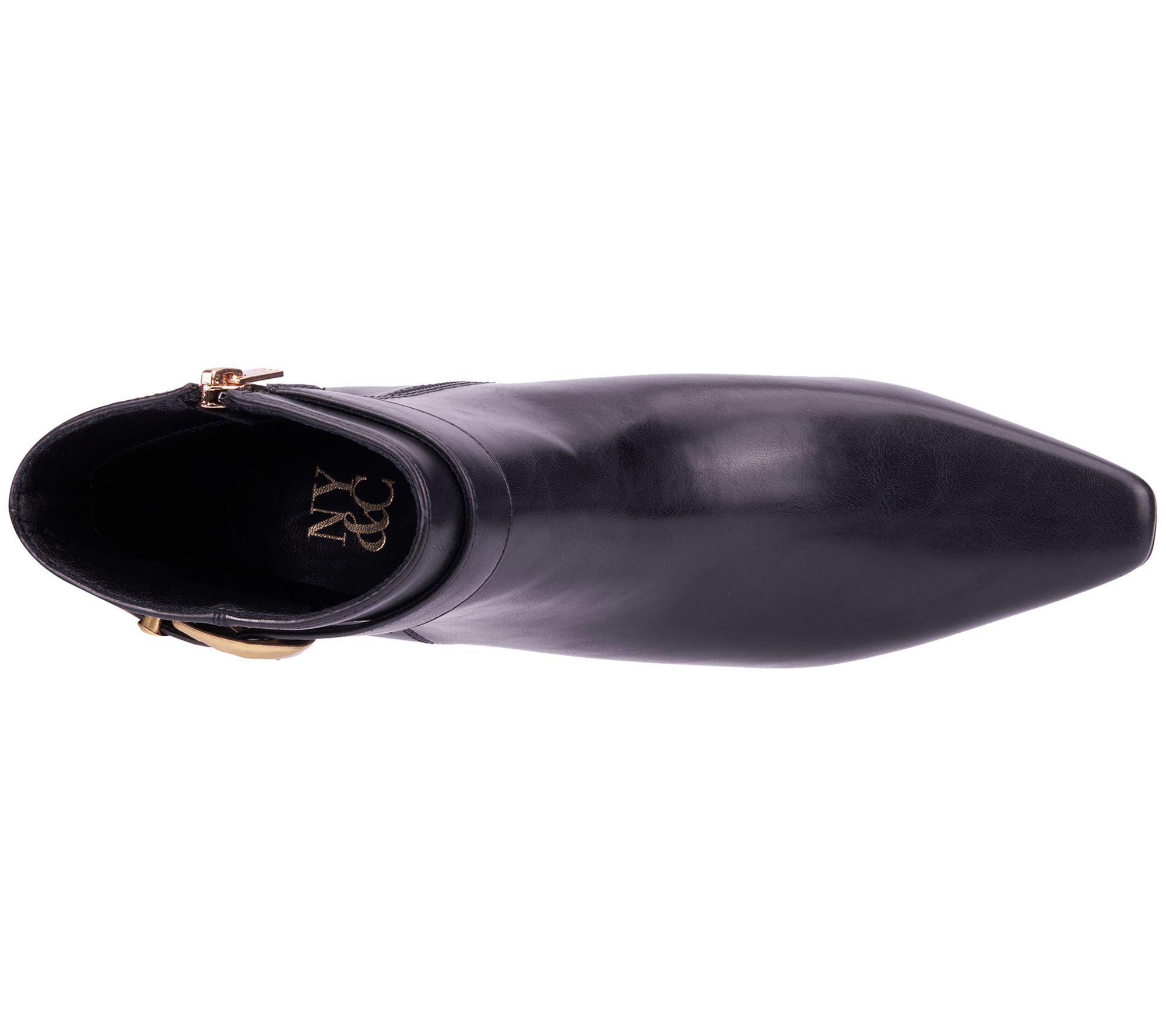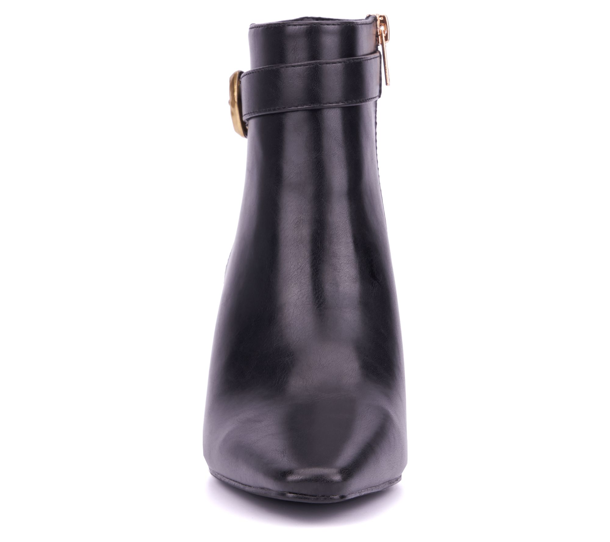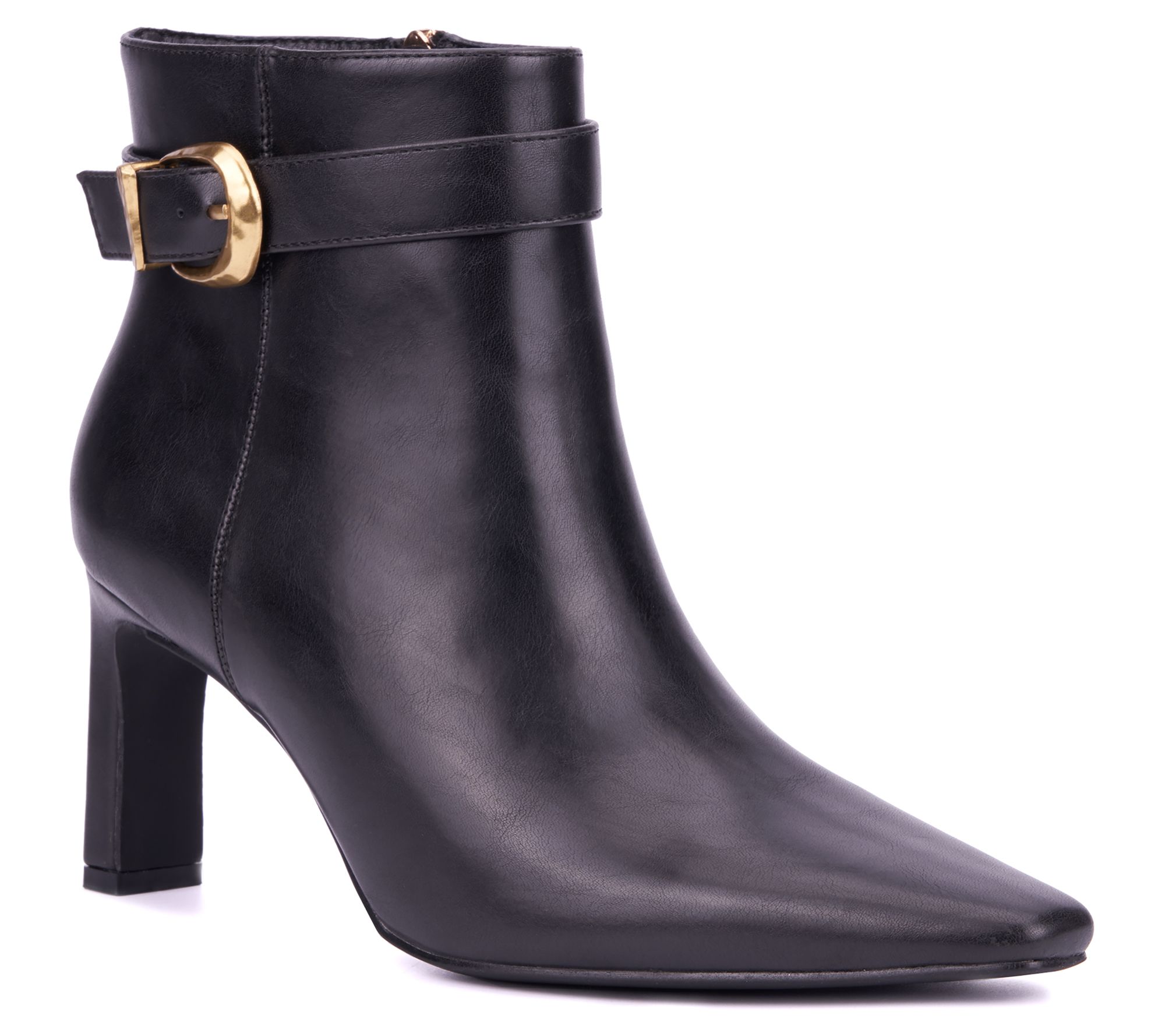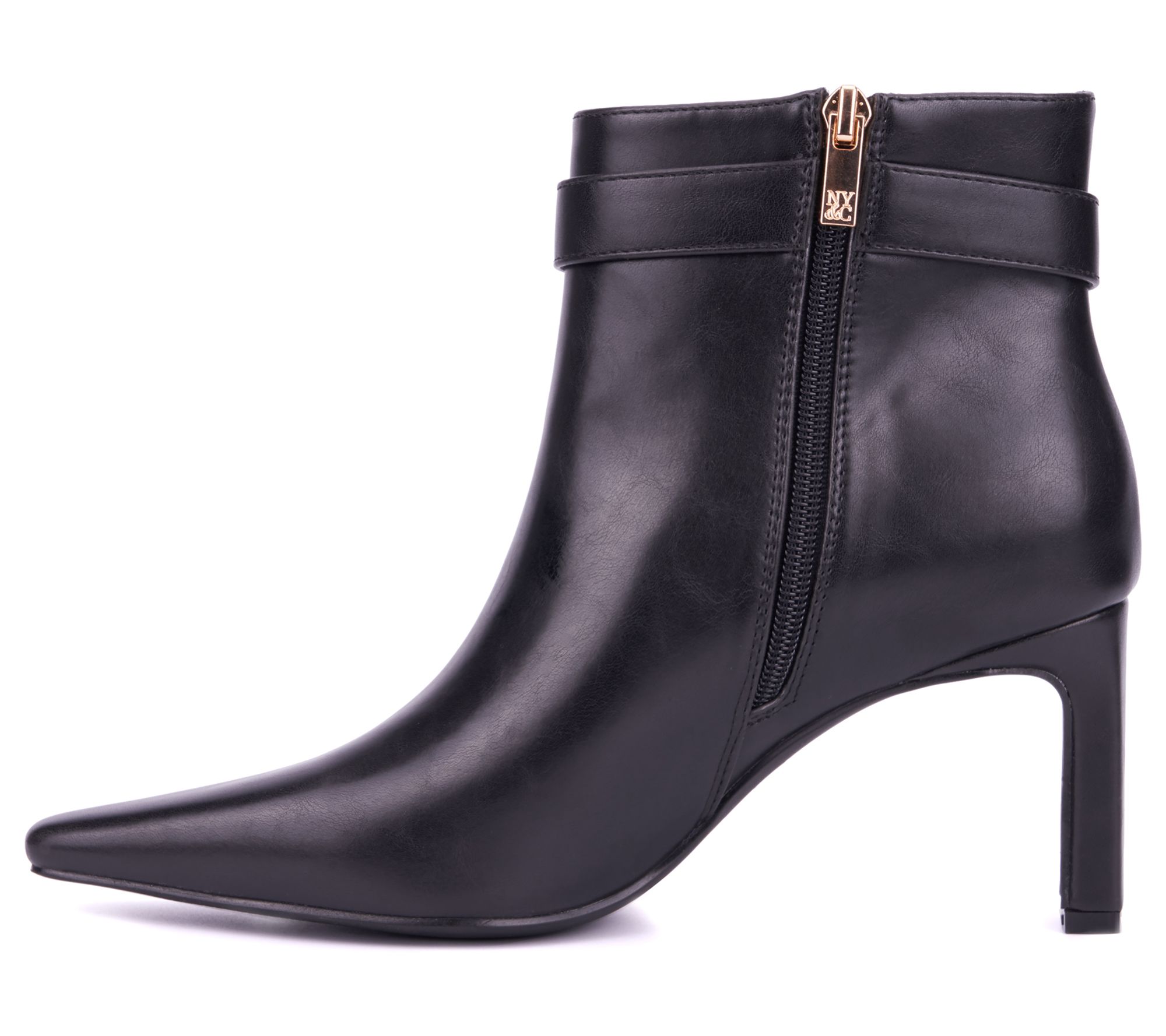 Introducing the McKenzie bootie from New York & Company, a perfect blend of modern sophistication and timeless style. This sleek style features a smooth faux leather upper, complemented by a striking goldtone buckle detail for added elegance. Designed for both comfort and chic appeal, the McKenzie effortlessly enhances any outfit, making it a must-have addition to your wardrobe. From New York & Company.