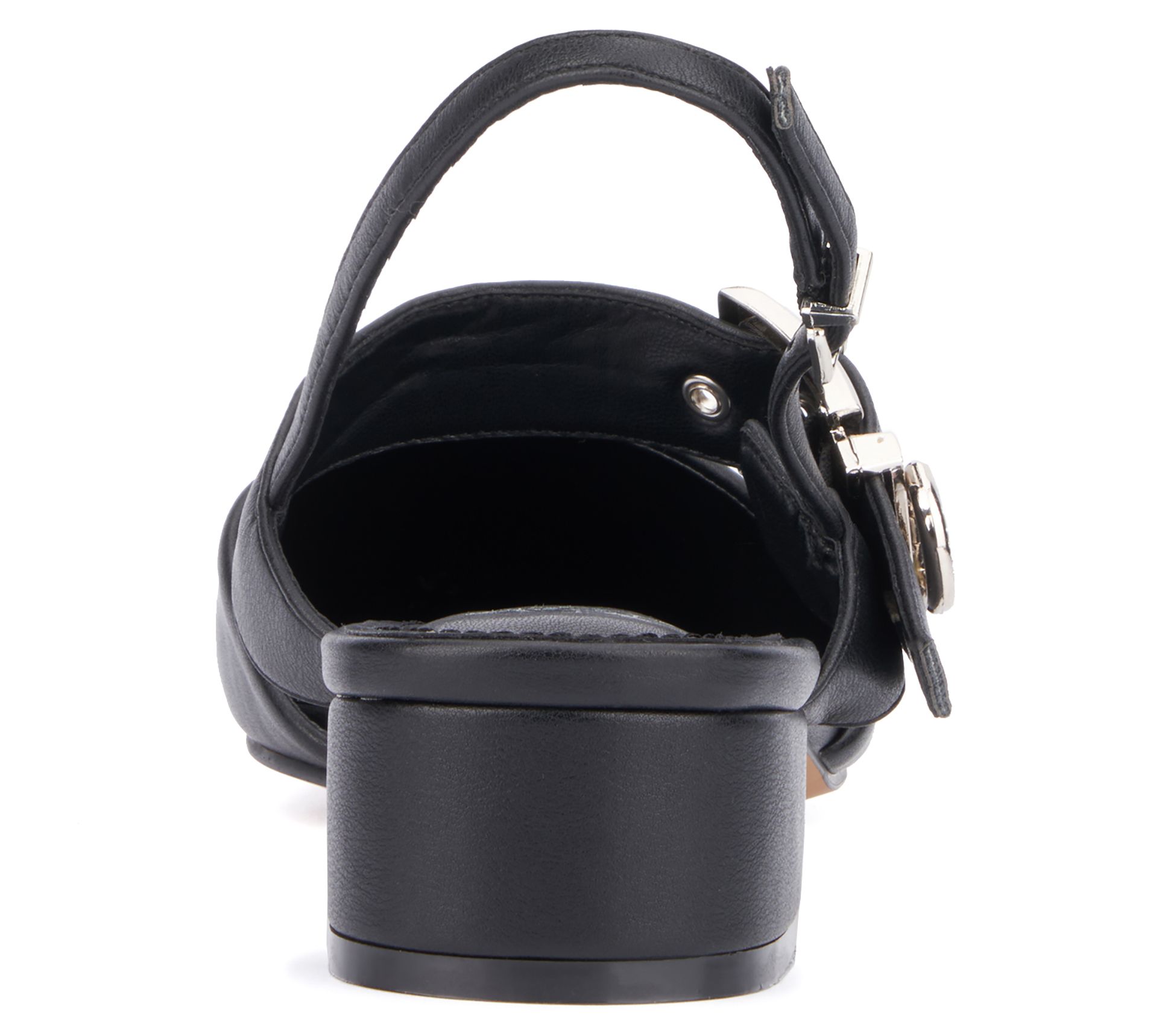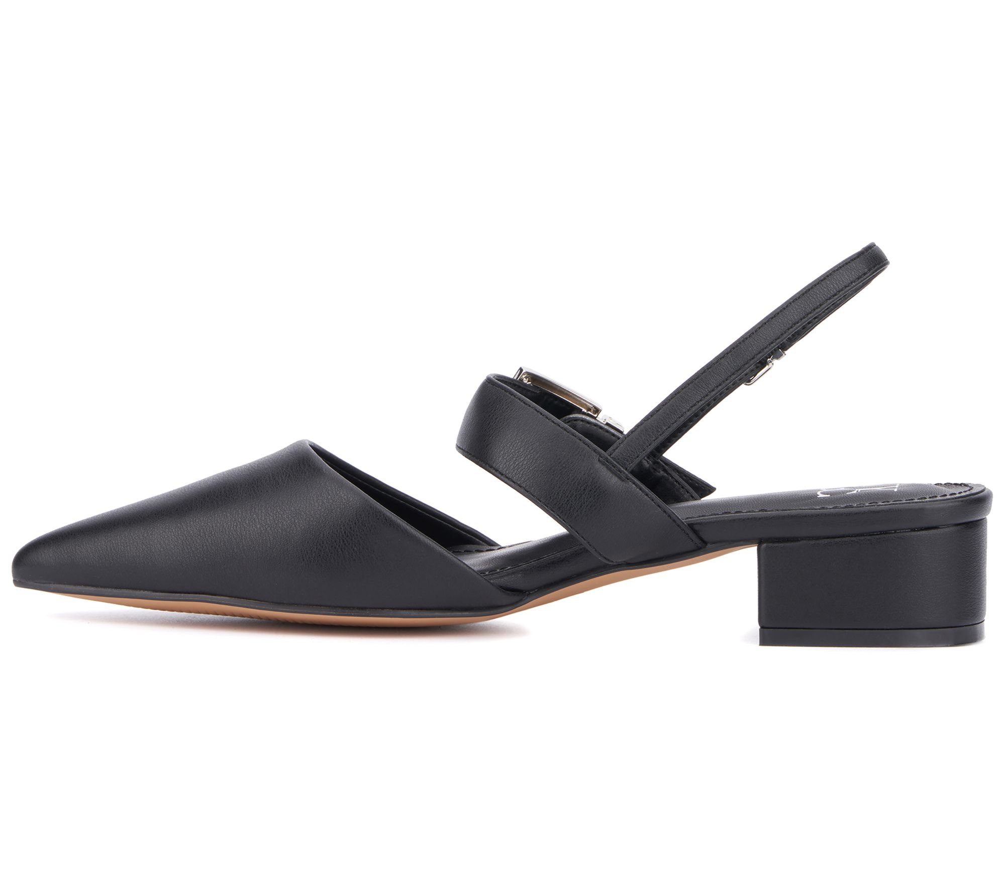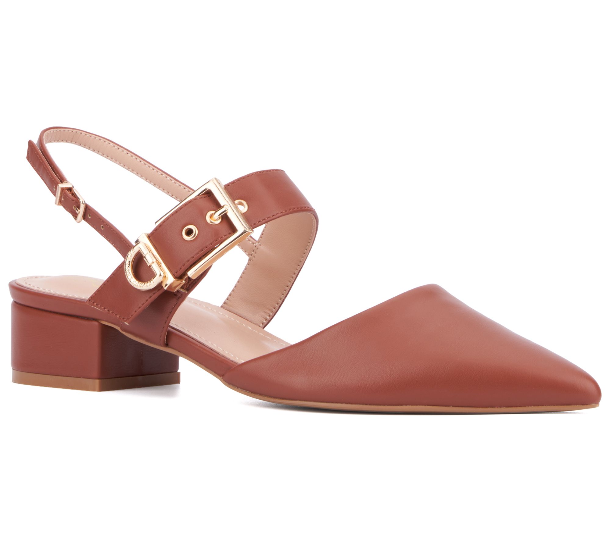 Step into sophistication with the Rea slingback block heels from New York & Company. These stylish heels feature a smooth faux leather upper, an elegant pointy toe, and a striking goldtone buckle strap detail that instantly elevates your look. Perfect for any occasion, the Rea block heel combines comfort and chic design, ensuring you step out with confidence and flair. From New York & Company.