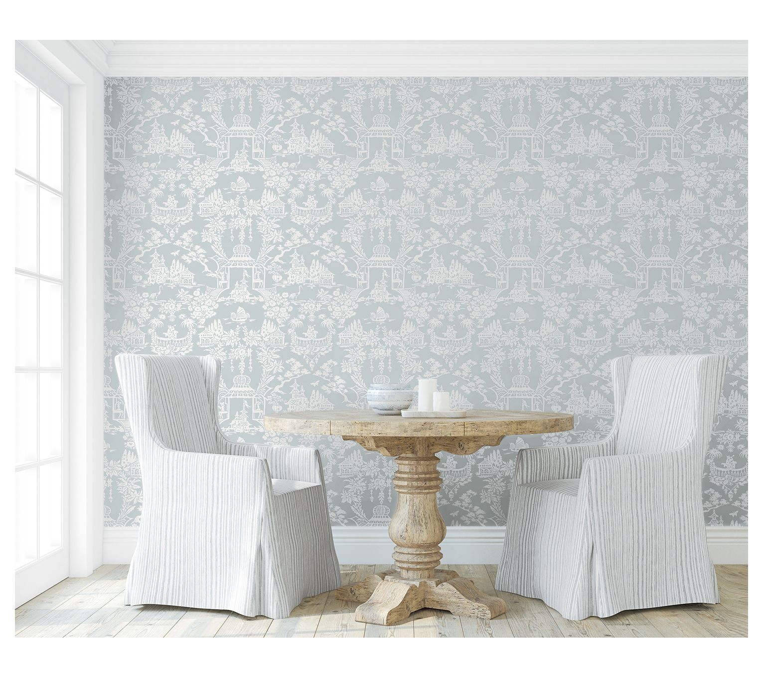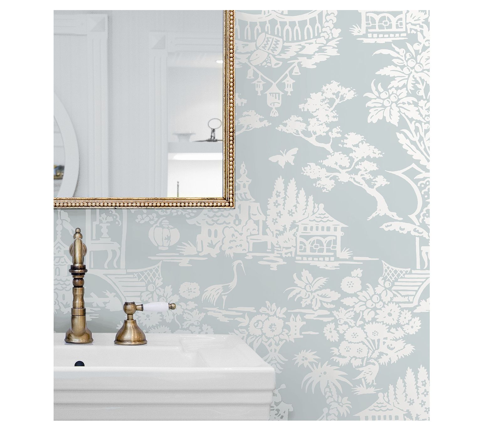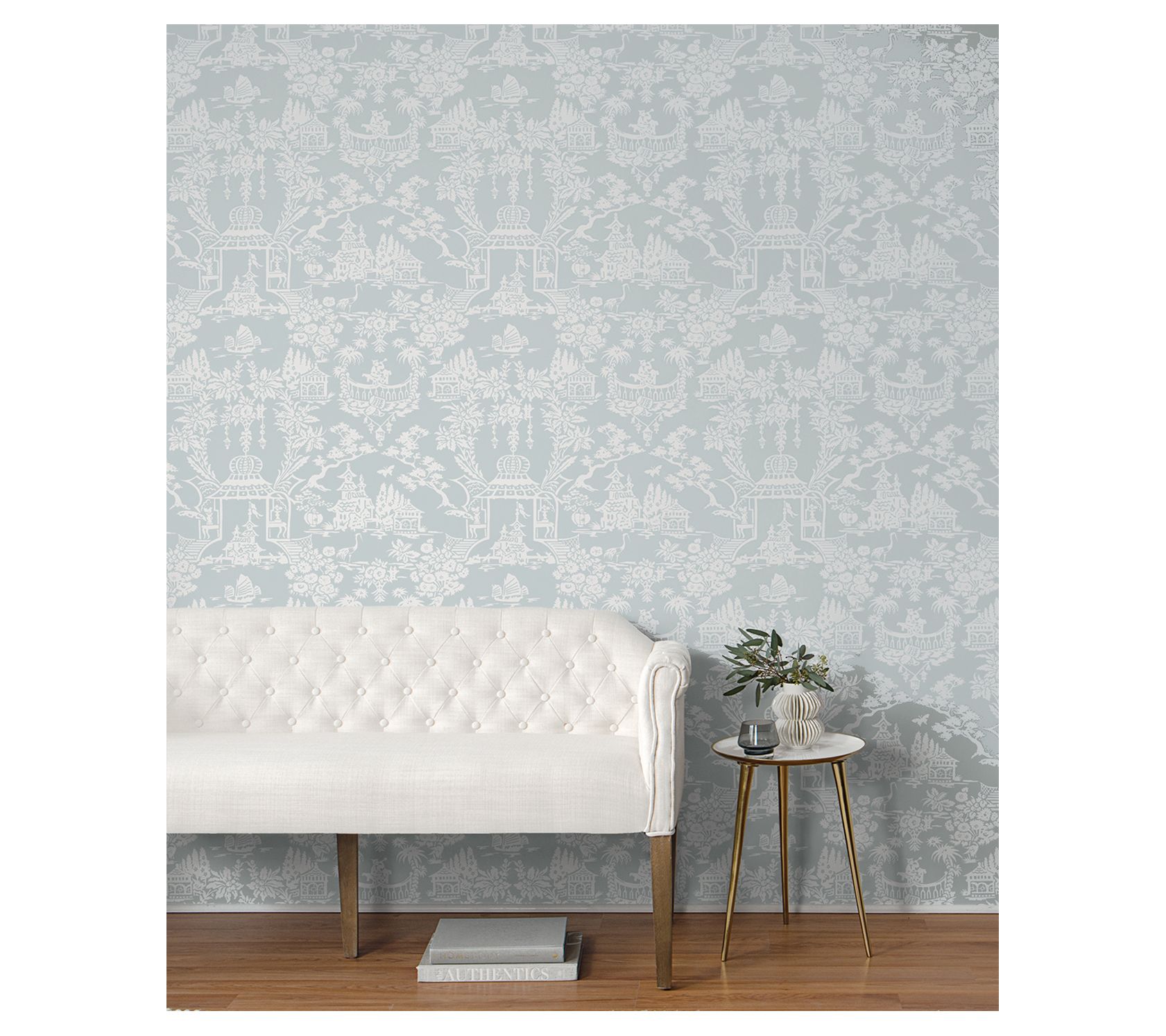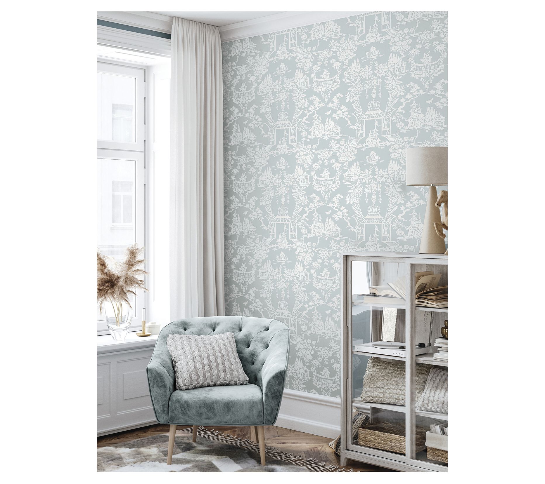 Cast in calming shades, the Garden Chinoiserie peel-and-stick wallpaper pattern offers an elegant aesthetic for your home. Featuring blossoming florals and imperial pavilions, this self-adhesive design is perfect for renters and homeowners seeking a hassle-free, DIY transformation. From NextWall.
