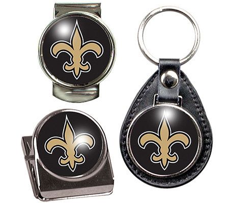 The key to preventing fumbles in the NFL? Keep the ball firmly tucked. How do you avoid fumbling your personal effects? Use this New Orleans Saints set. Your valuables stay organized and close at hand when attached to this leather key chain, money clip, and magnetized magazine clip, each of which is adorned with the team's logo. From Great America Products.