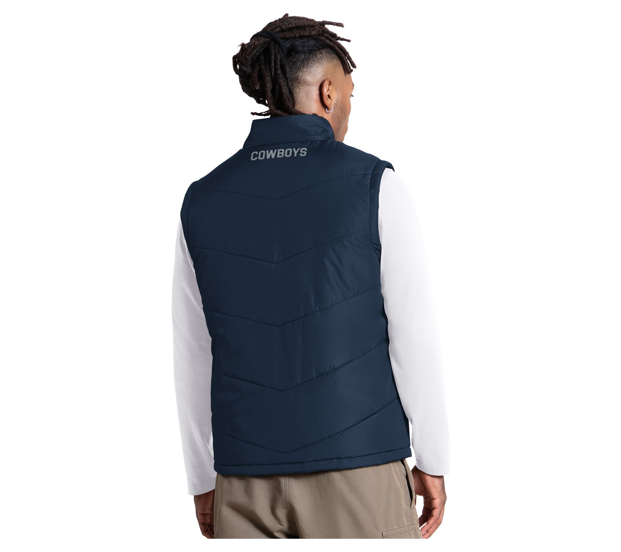 Show your team spirit throughout the season -- or score a can't-miss holiday gift -- with this men's puffer vest, designed with an appliqued logo at the chest and the team name embroidered across the back. The filled construction helps keep you comfortable whether you're tailgating, watching from the stands, or layering up for a brisk walk.