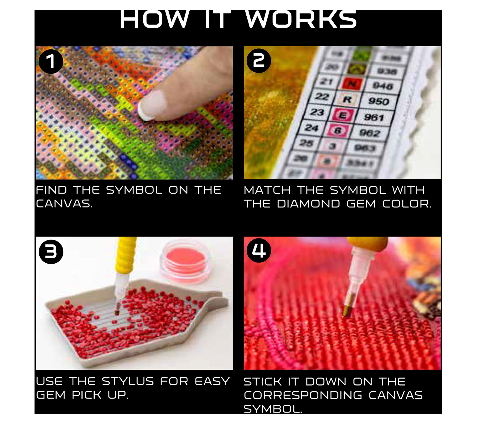 • Includes color printed fabric, diamond gems pre-sorted by color, stylus, comfort grip, craft tray, wax caddy, and easy-to-follow instructions